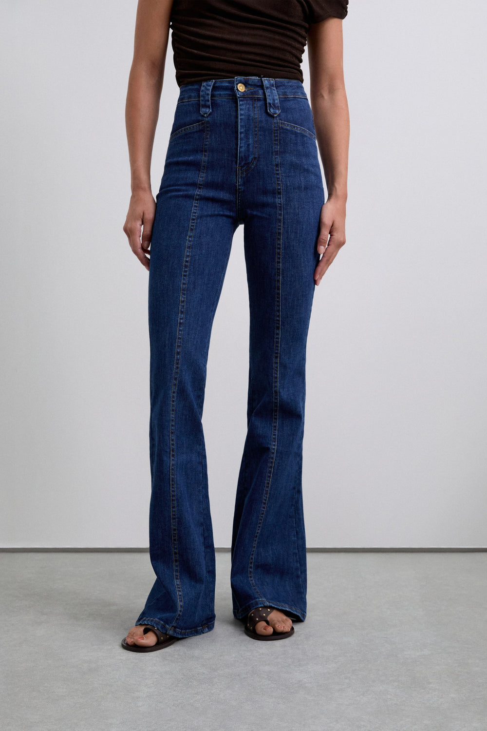 Denim bootcut broek met hoge taille. Naad op middenvoor. Voor- en achterzakken. Knoopsluiting en riemlussen in de taille. Logo met label op de achterkant.