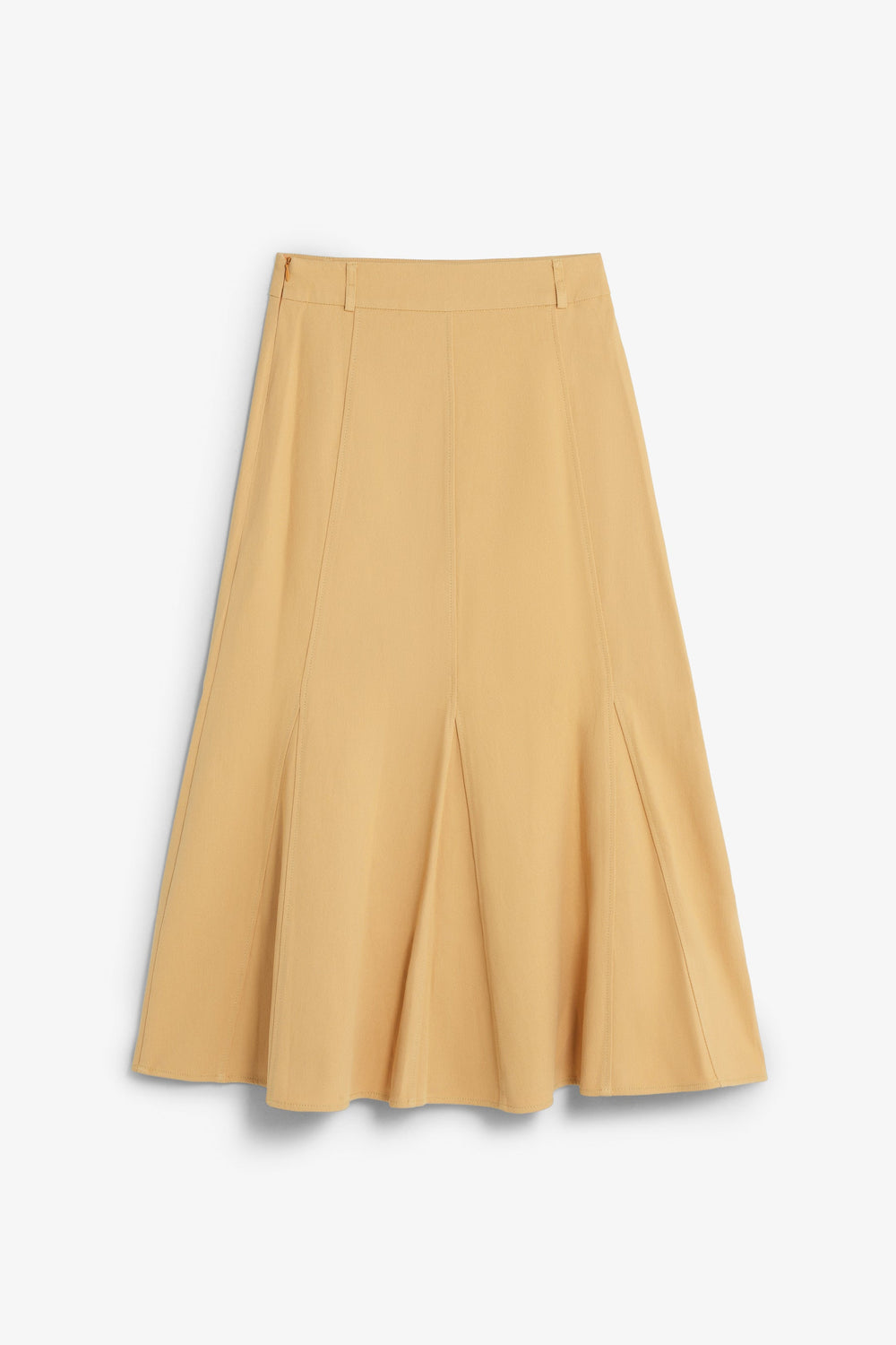Rok met riemlussen, elastiek in de taille en plooien. Gecombineerde binnenvoering. Blinde rits aan de zijkant.