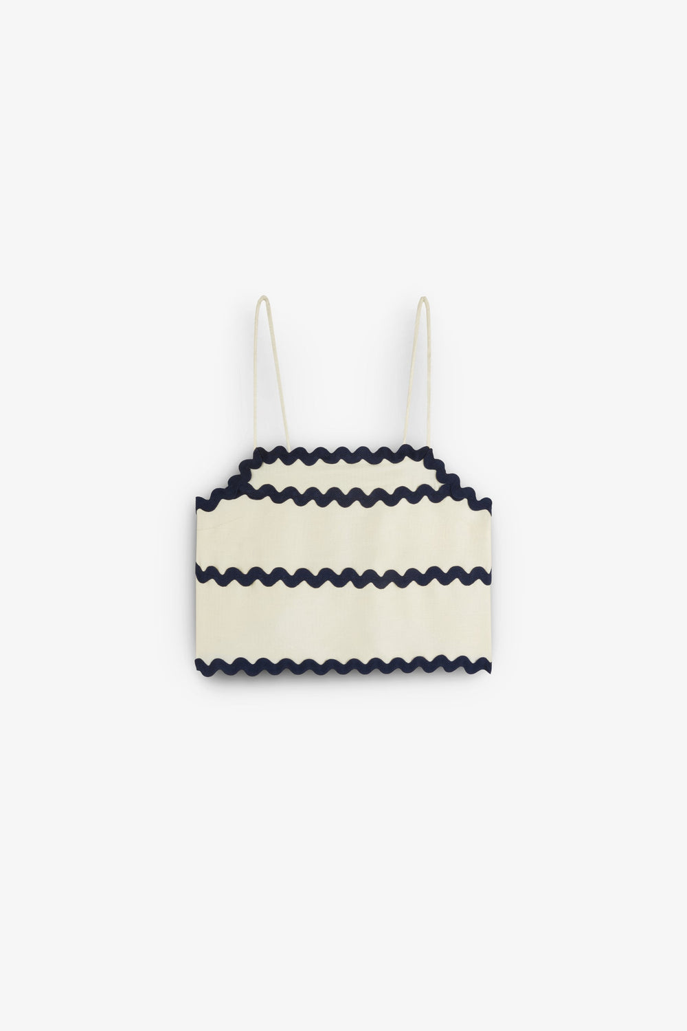Top met dunne bandjes en rechte halslijn. Contrasterende golven. Cropped model.
