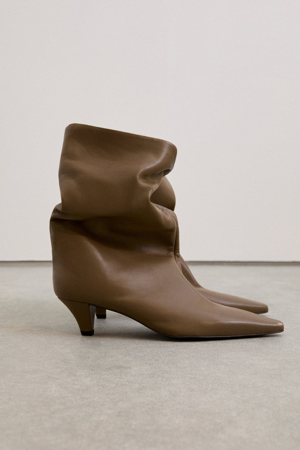 Laars gemaakt van 100% leer. Geplooide schacht. Middelhoge smalle hak. Spitse neus.