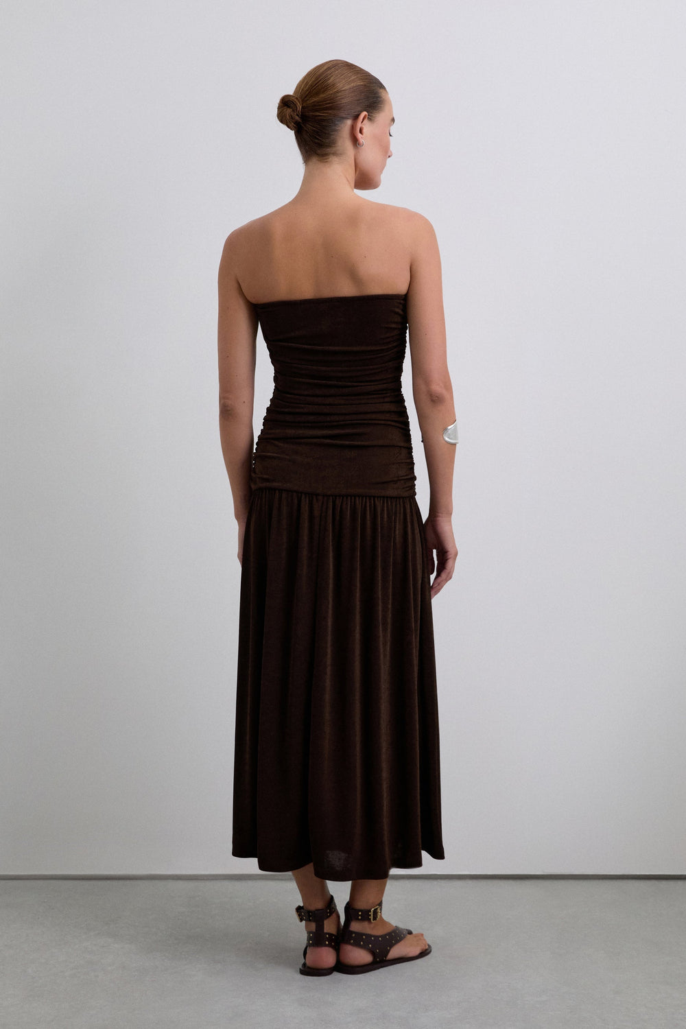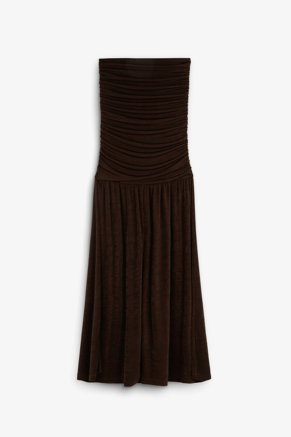 Jurk gemaakt van fijn tricot met lichte stretch. Slim fit, strapless model, lijfje met ruches. Halflang model.