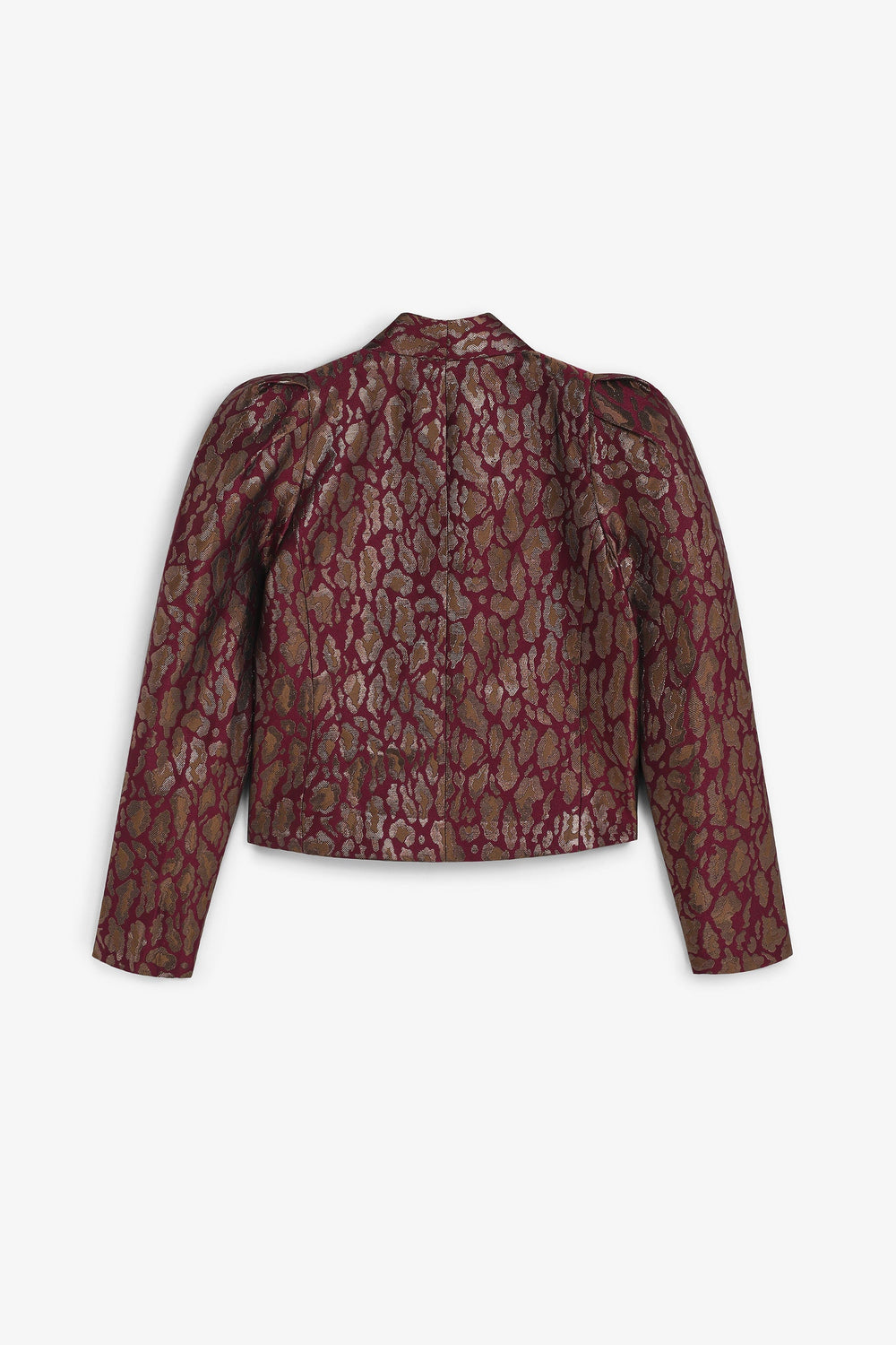 Cropped blazer van stof met metallic-effect en dierenprint. Lichtjes opstaande kraag. Lange pofmouwen met plooien. Strak model met knoopsluiting.