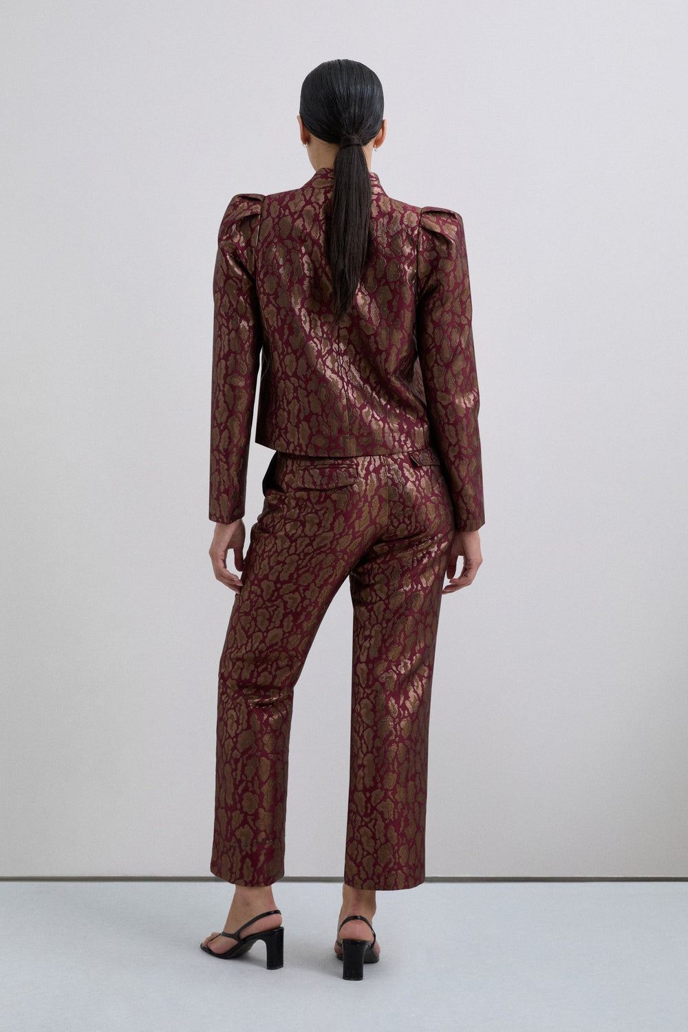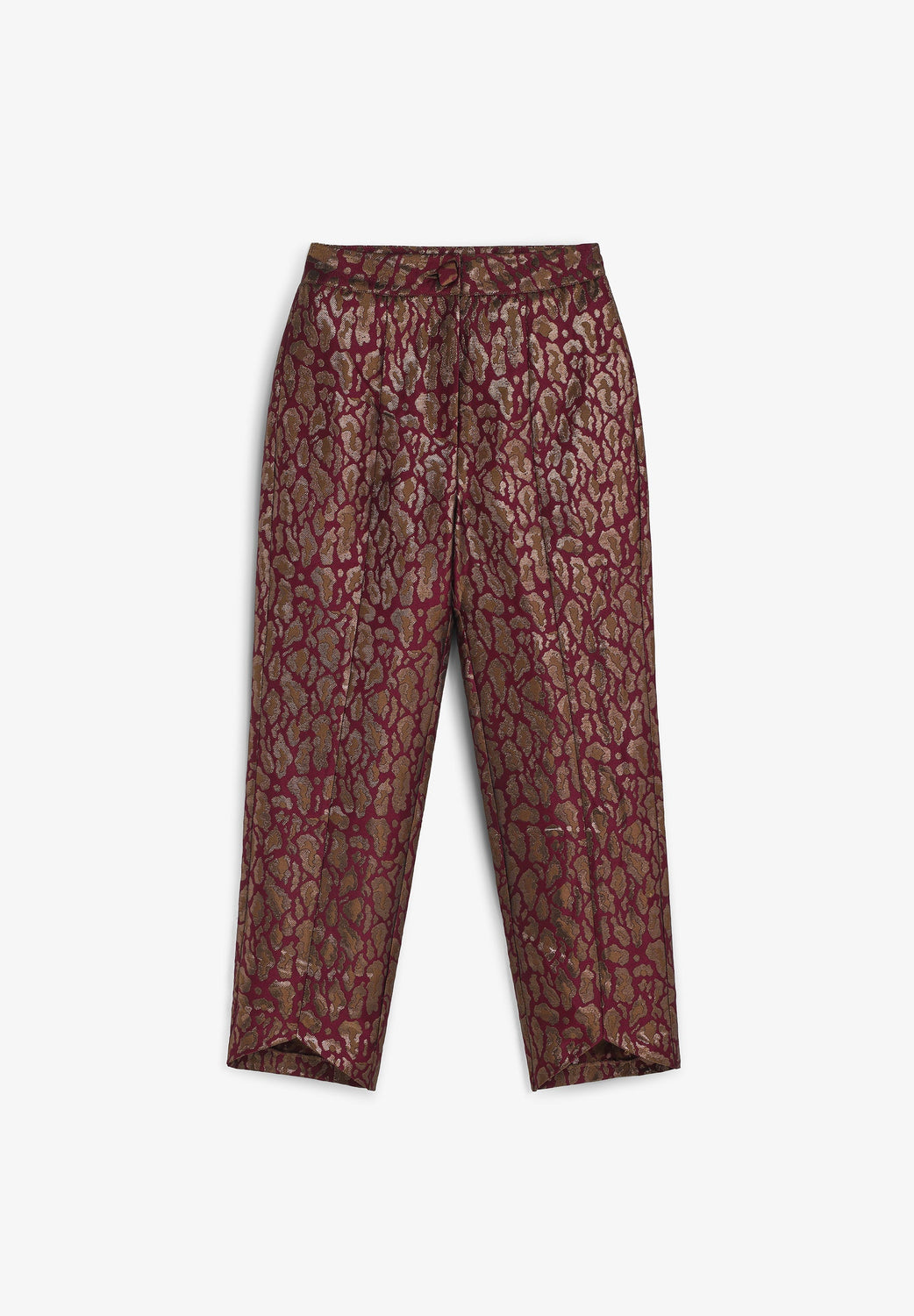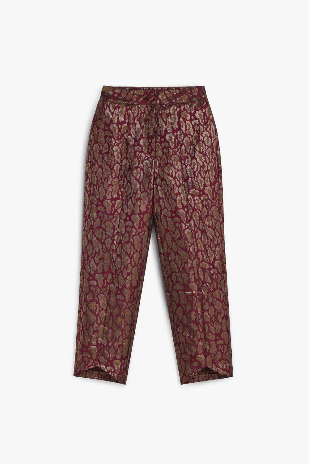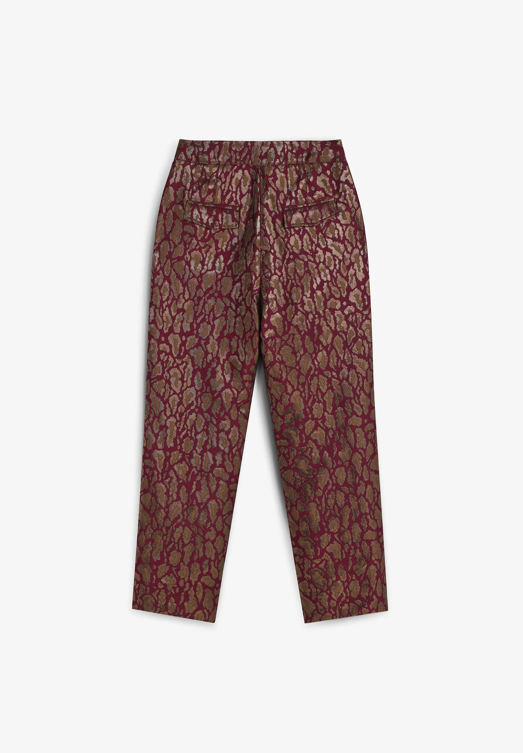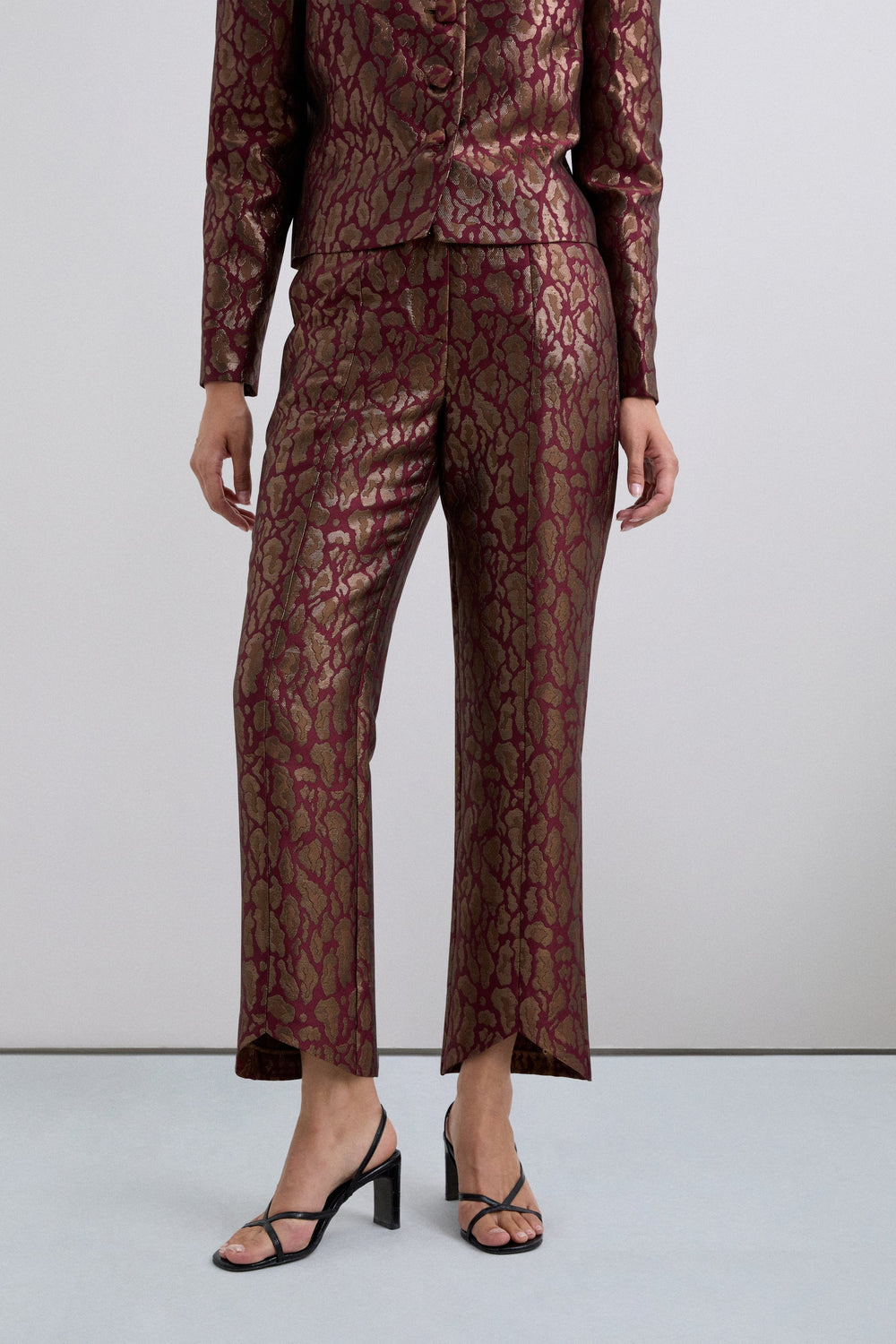 Broek van stof met metallic-effect en dierenprint. Naden. Sluiting met rits. Zoom van de broek met asymmetrisch ontwerp.