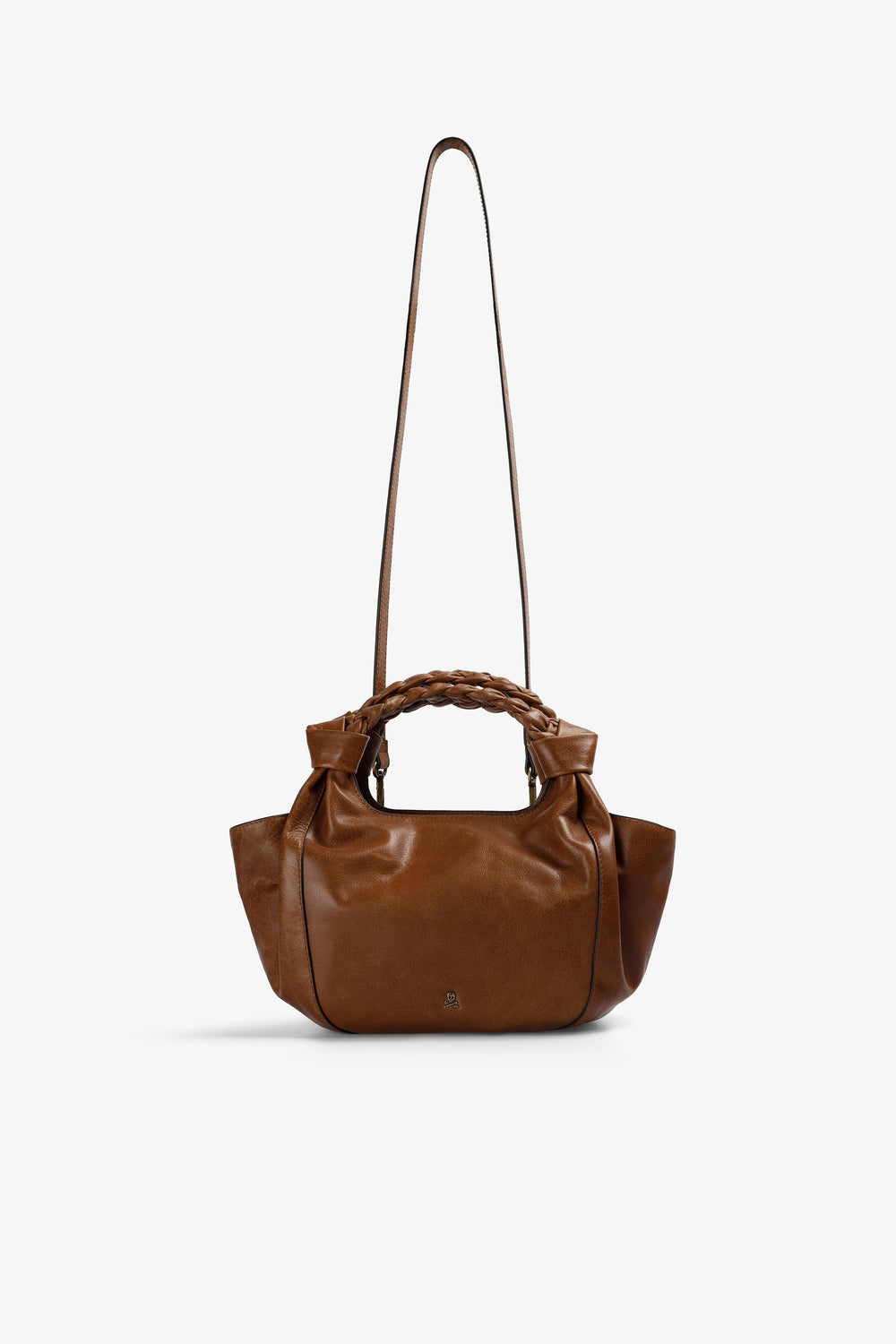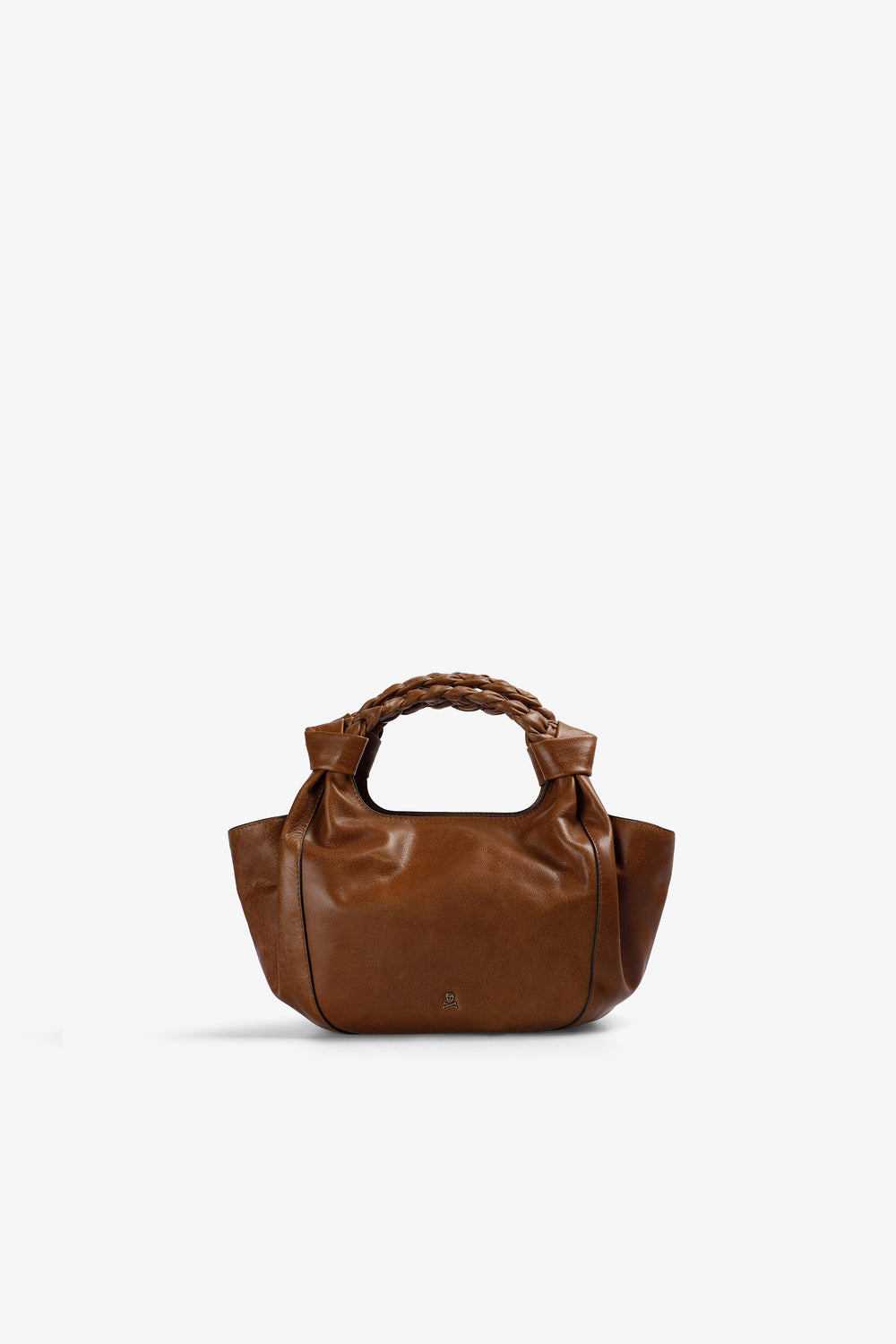 Handtas van 100% leer met geknoopt gevlochten hengsel. Voering, binnenzak en ritssluiting. Metalen logo op de voorkant. Optie voor dubbele handgreep.