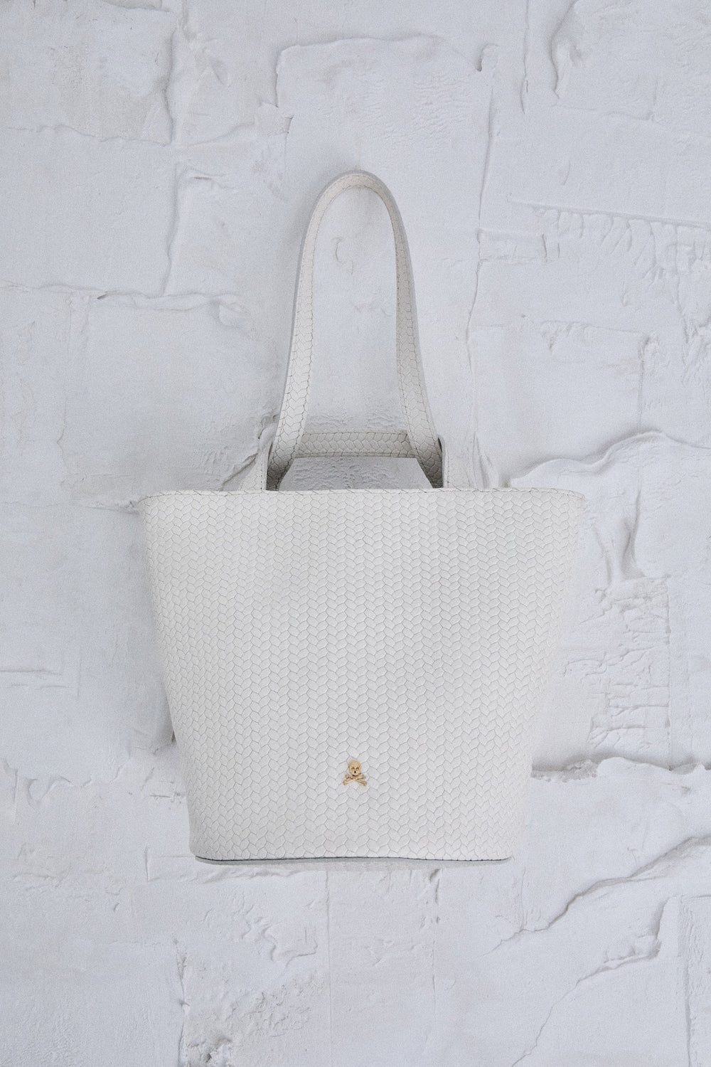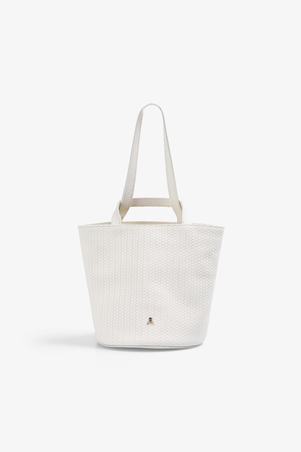 Mini buckettas van 100% gevlochten leer. Binnenvoering met zakje met rits. Metallic logo op de voorkant. Kort handvat.