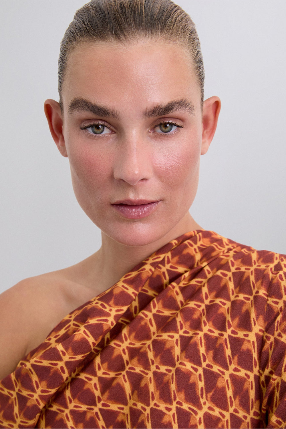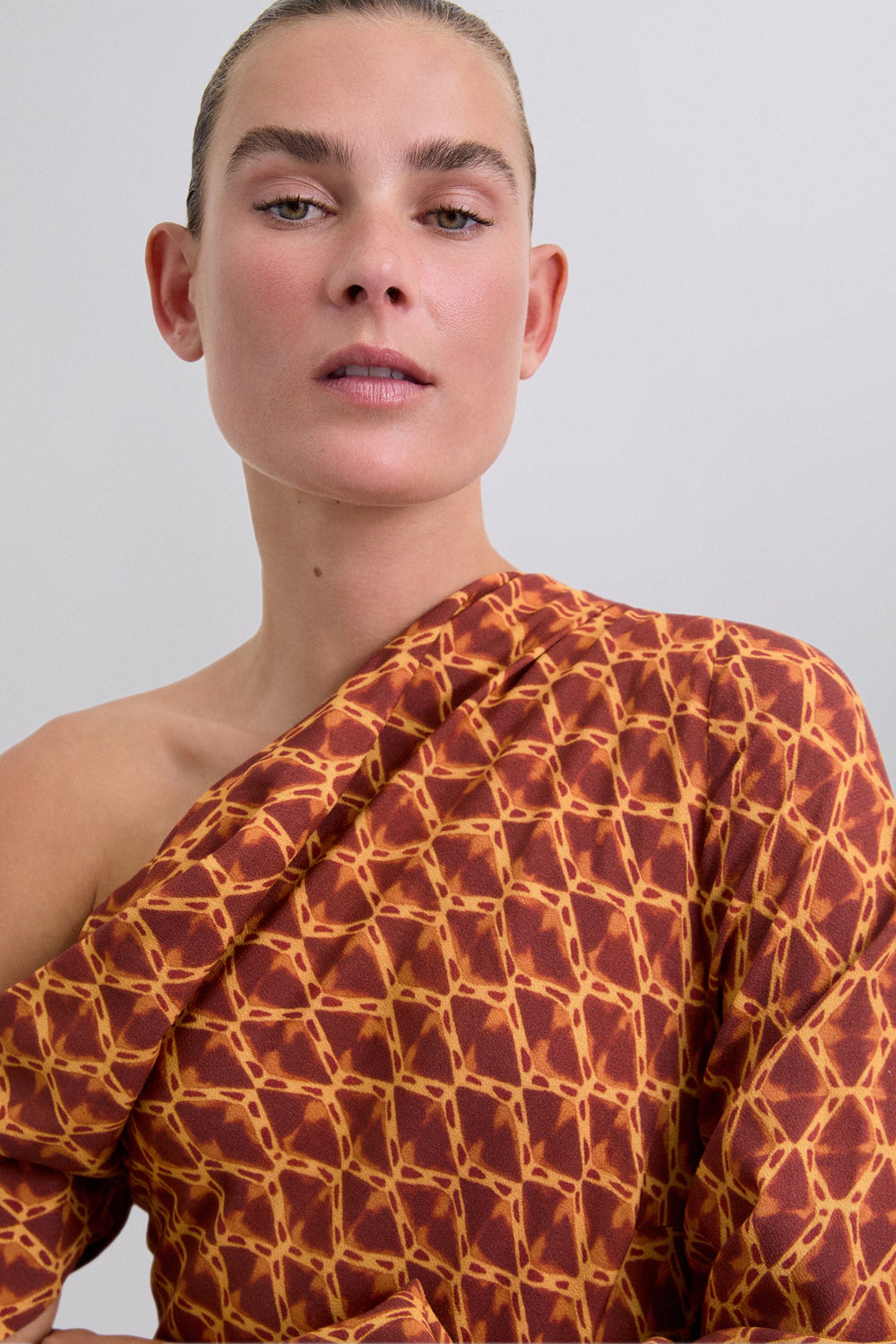 Jurk met print en lange en korte pofmouwen met elastische boorden. Asymmetrische hals. Eén blote schouder. Slim fit.