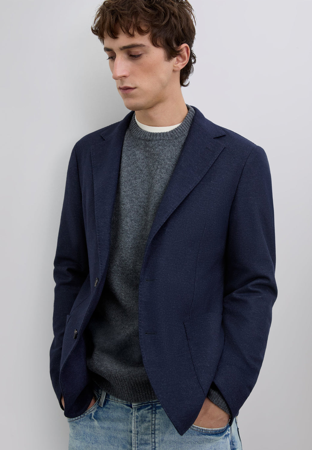 Technical blazer made of wool. Regular lapels. Three patch pockets. Two button fastening at the front. Long sleeves.