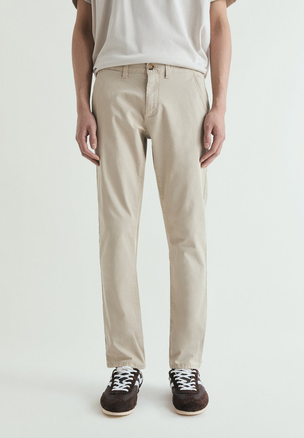 Chino jeans made of a cotton blend. Button fastening concealed by placket. Side and back pockets. Slim fit. Belt loops at the waist.