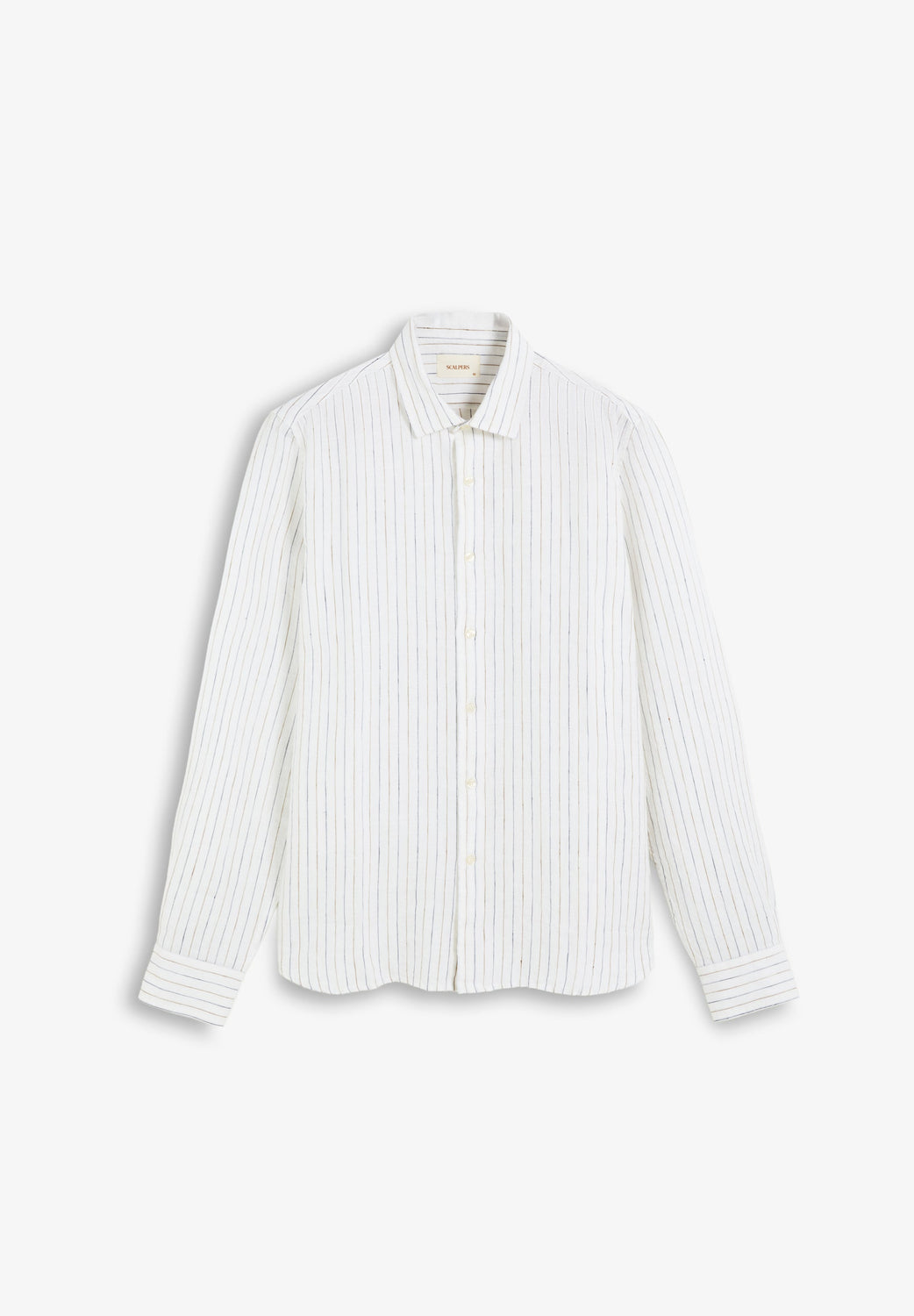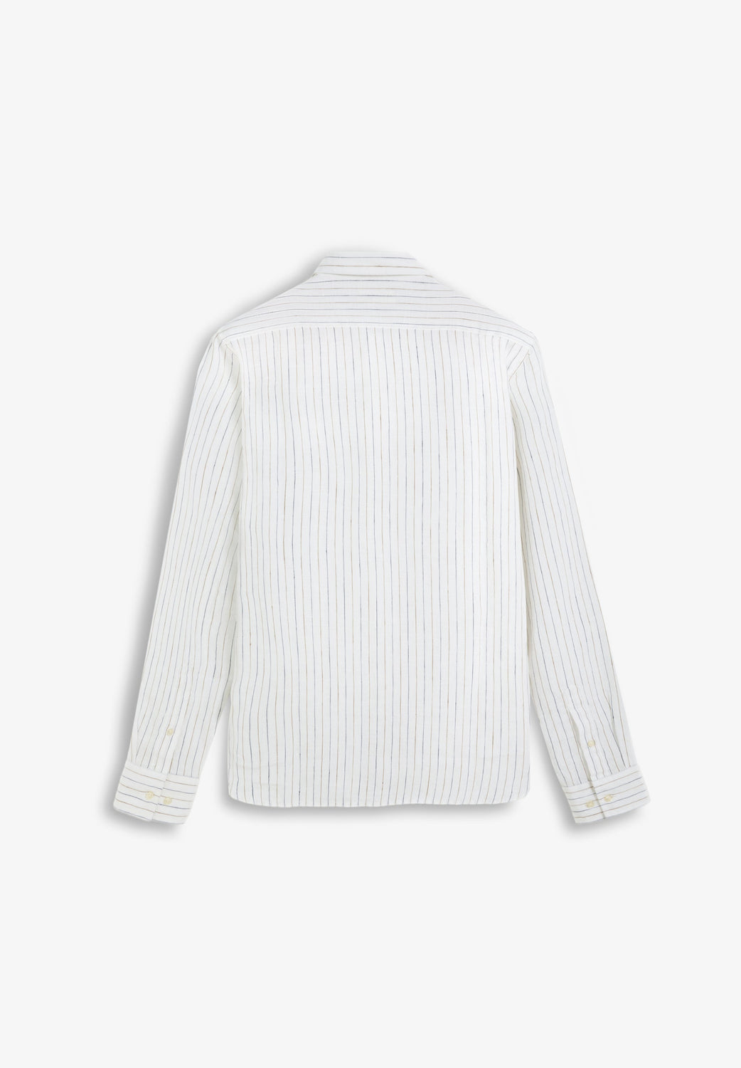 Koszula wykonana ze 100% lnu. Slim fit. Kołnierzyk koszulowy i długi rękaw z mankietami zapinanymi na guziki. Print w paski.