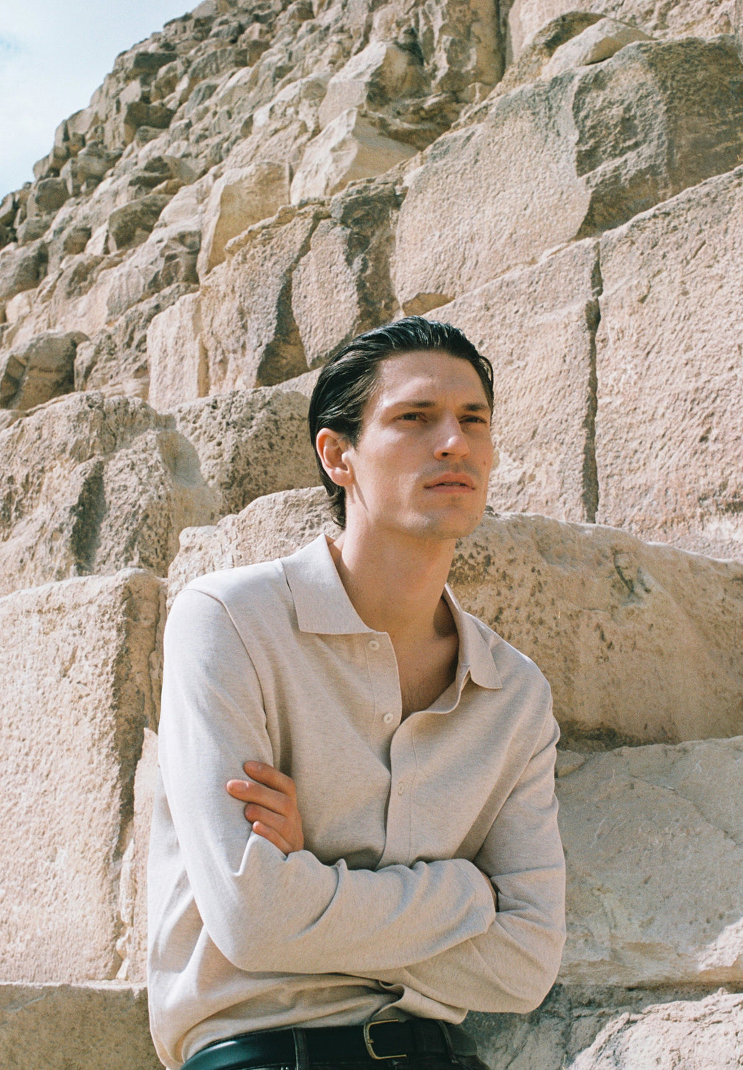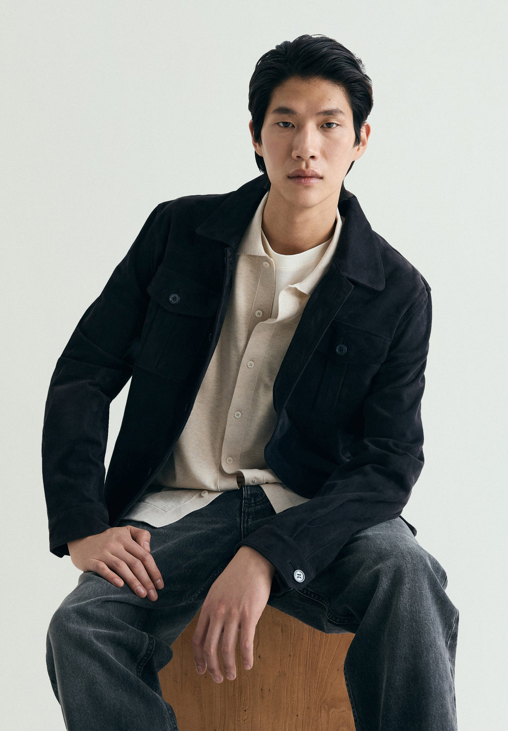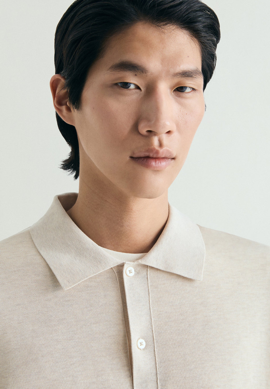 Polo shirt style cardigan made of cotton and silk fine knit blend. Polo shirt collar and long sleeves. Front button fastening.