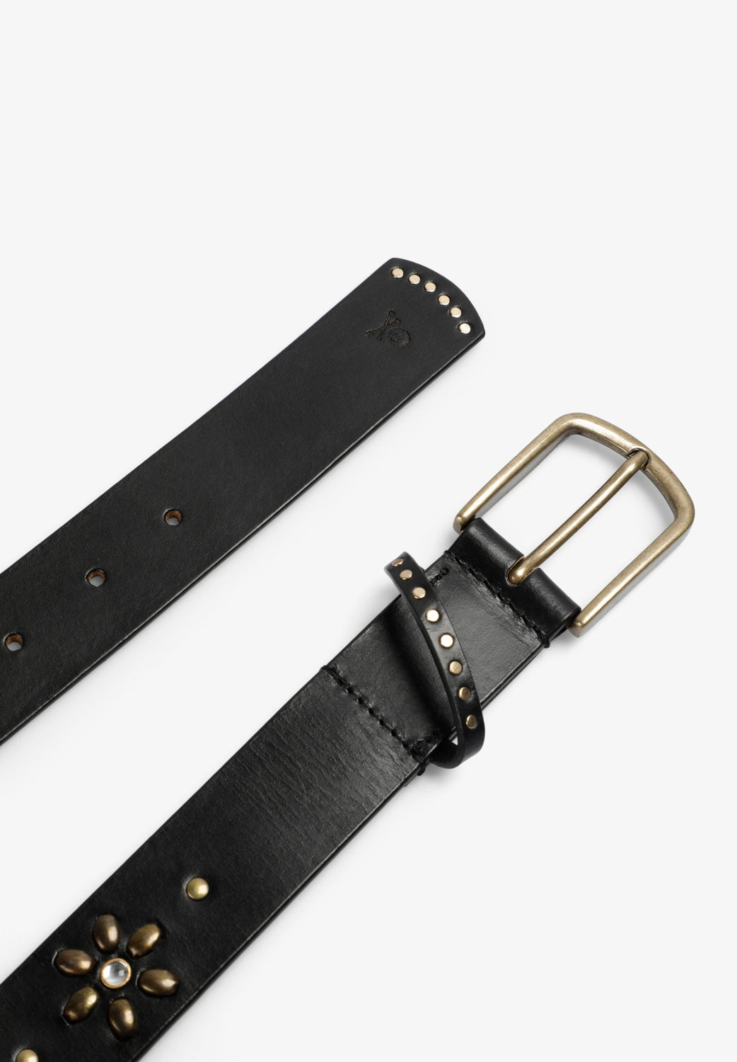 Pasek wykonany ze skóry z połączonymi ozdobnymi ćwiekami. Zapięcie na metaliczną klamrę.