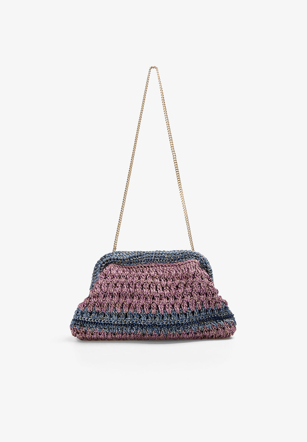 Kopertówka wykonana z plecionego materiału z metaliczną nicią i koralikami. Bawełniana podszewka i odpinany wewnętrzny uchwyt z łańcuszka.
