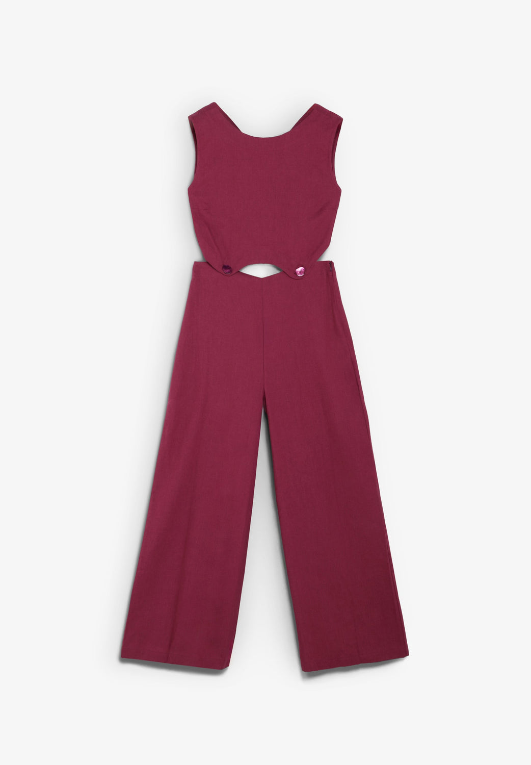 Kombinezon wykonany z lnu. Regular fit. Okrągły dekolt i brak rękawów. Ozdobne rozcięcia w pasie zintegrowane ze spodniami za pomocą kolorystyczne dobranych guzików. Dekolt w szpic i zapięcie na guziki.