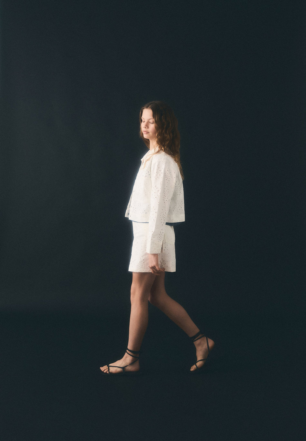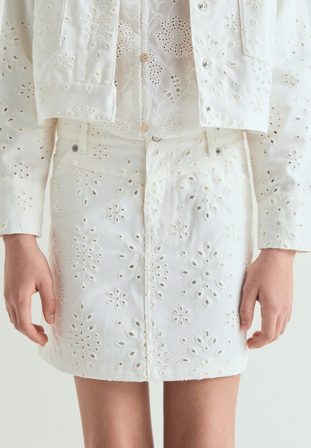 Mini skirt made of 100% BCI cotton. Perforated fabric. Slim fit. 5 pockets.
