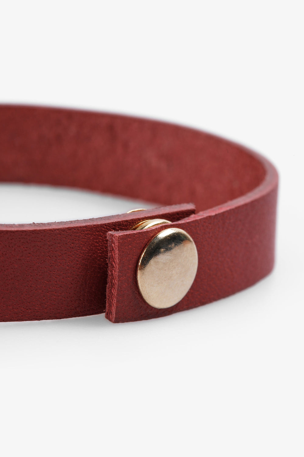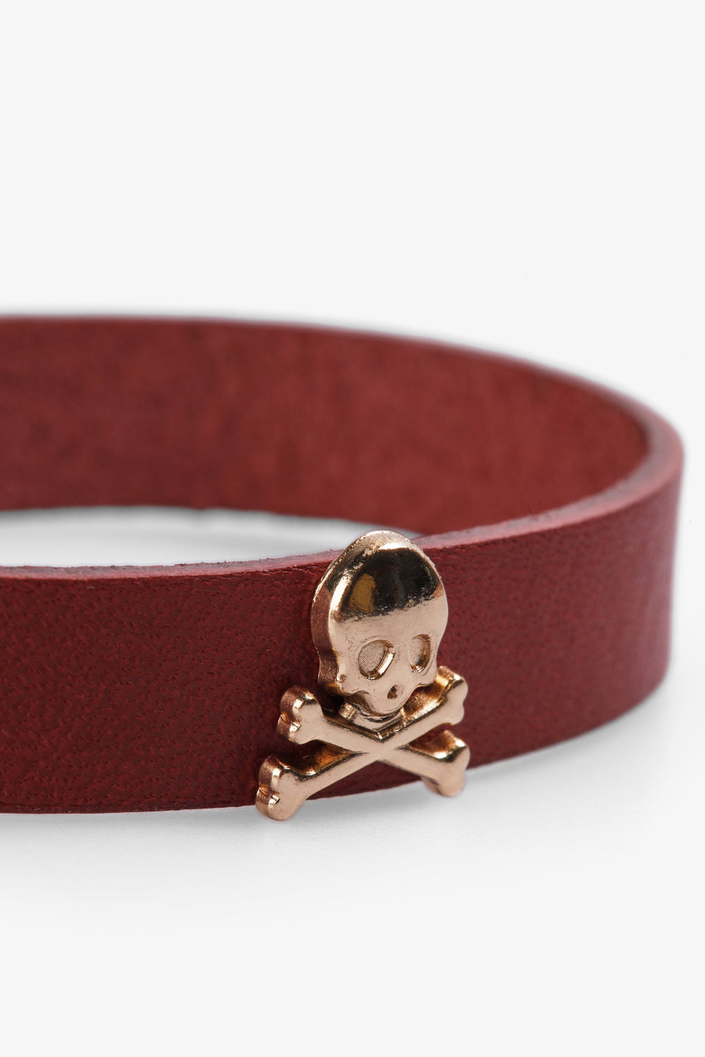 Pulsera confeccionada en piel con detalle de calaveras. Cierre con snap.