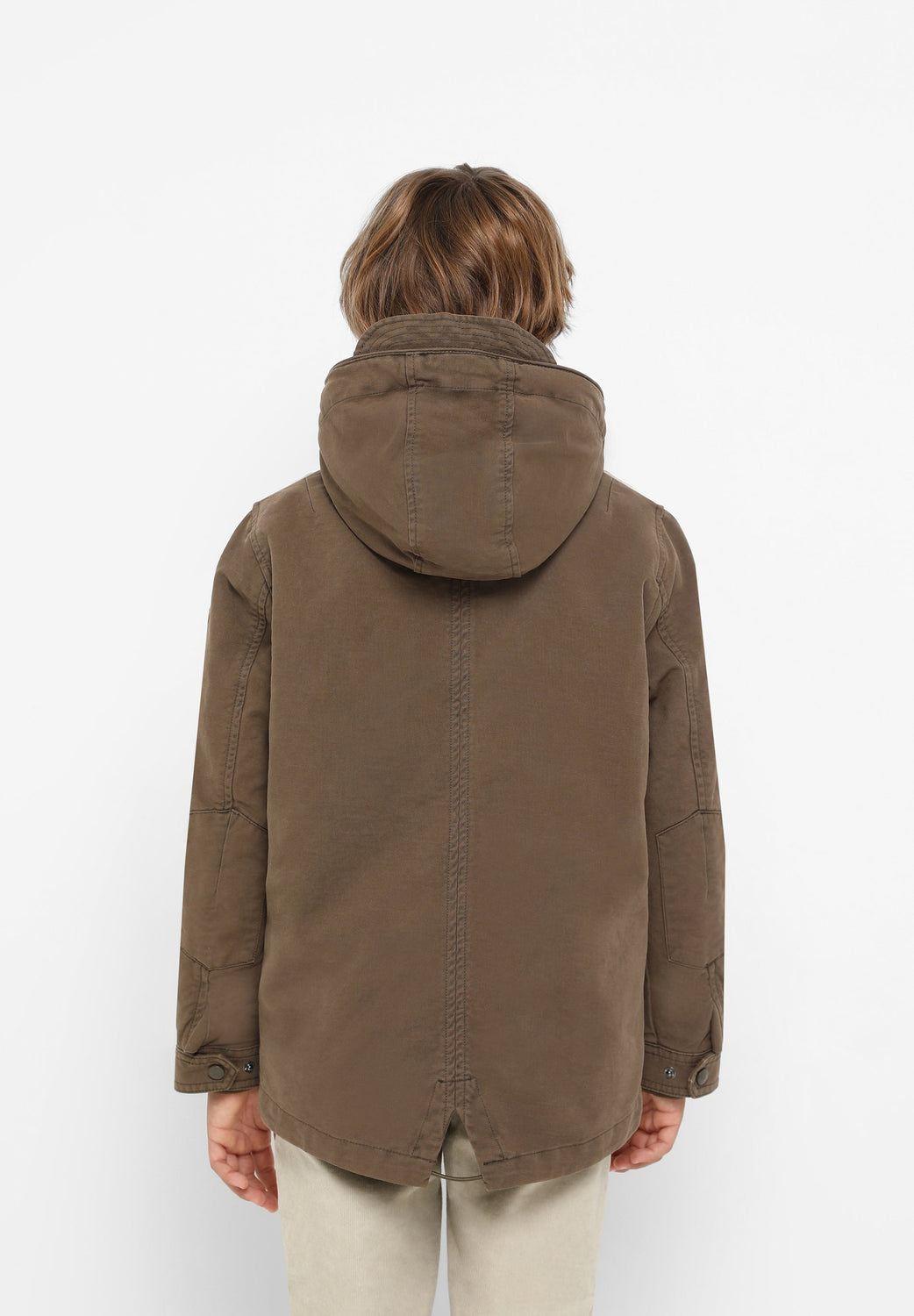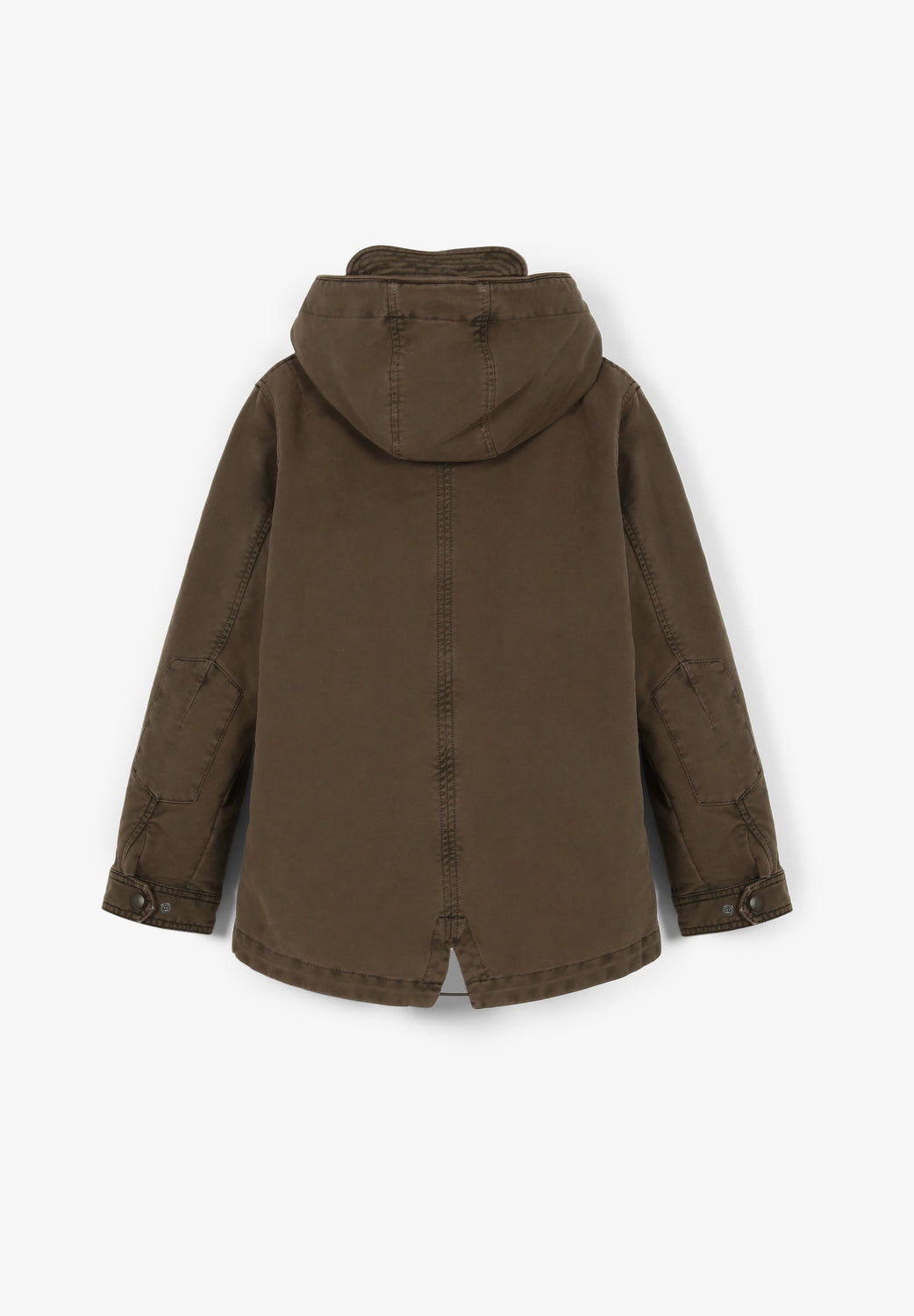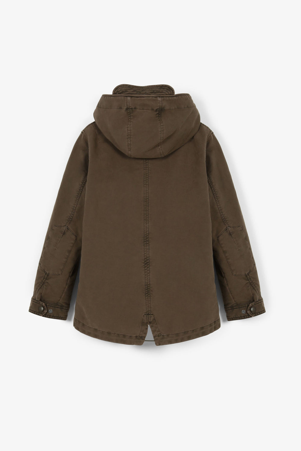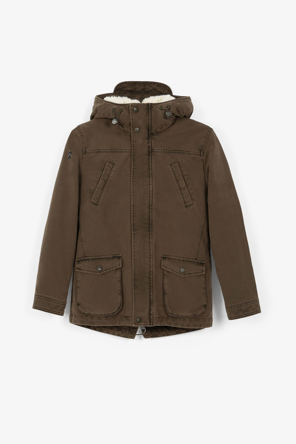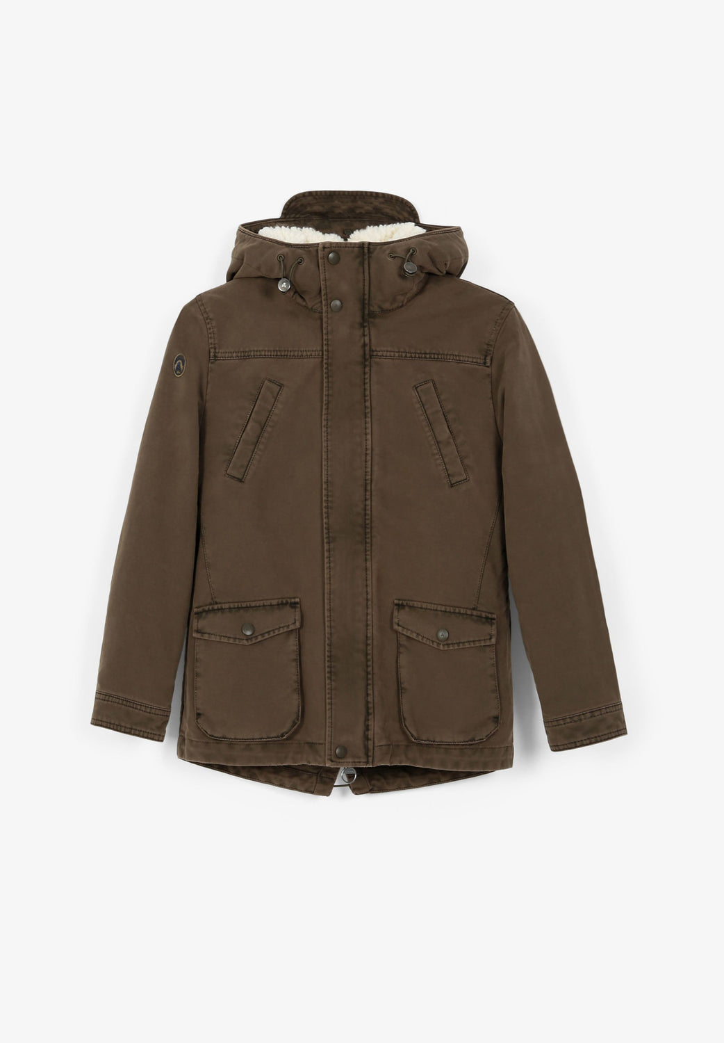 Parka with shearling lining made of 100% BCI cotton. Regular fit, collar with hood, zip fastening and snap buttons. Long sleeves, jetted and patch pockets. Adjustable hem.