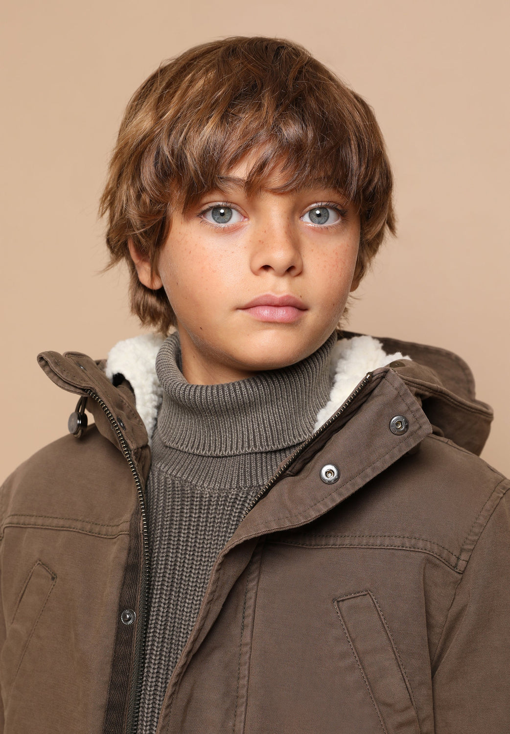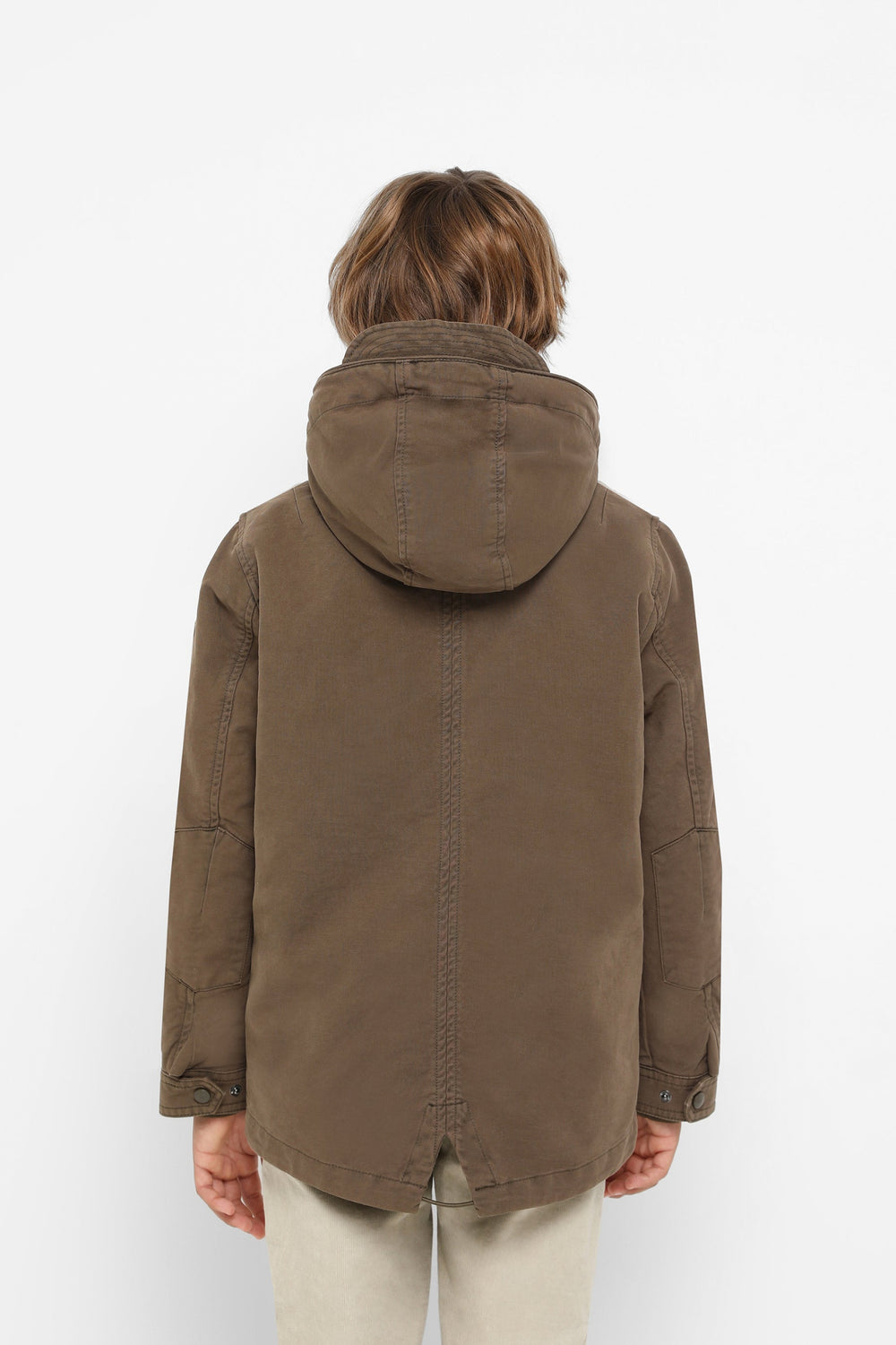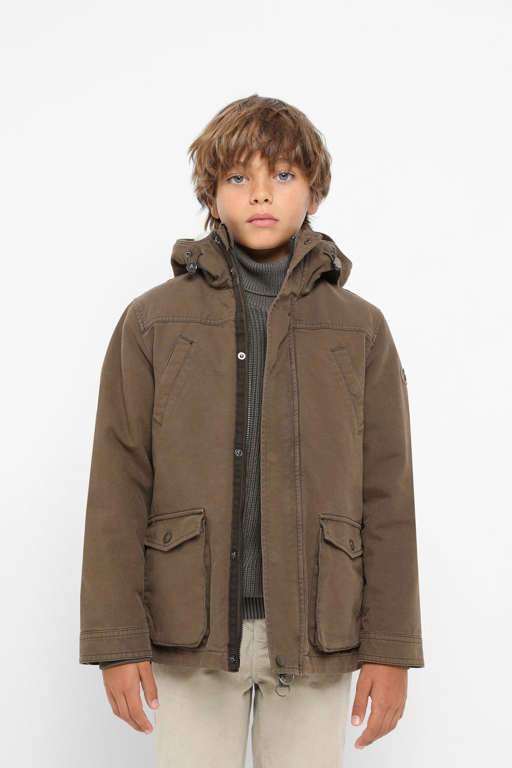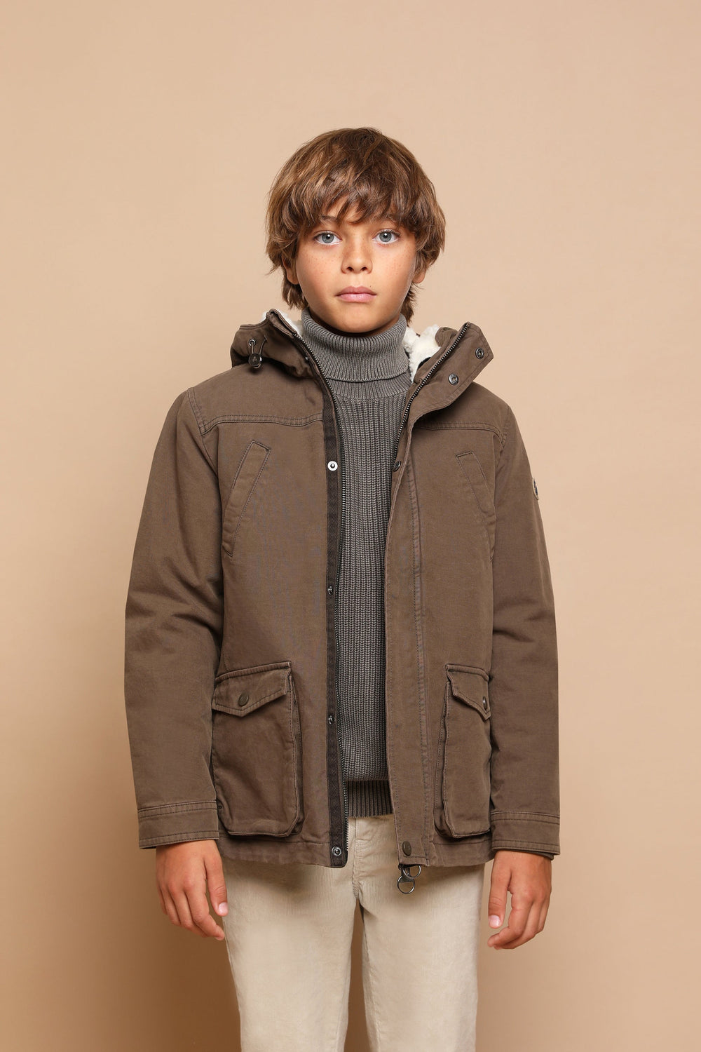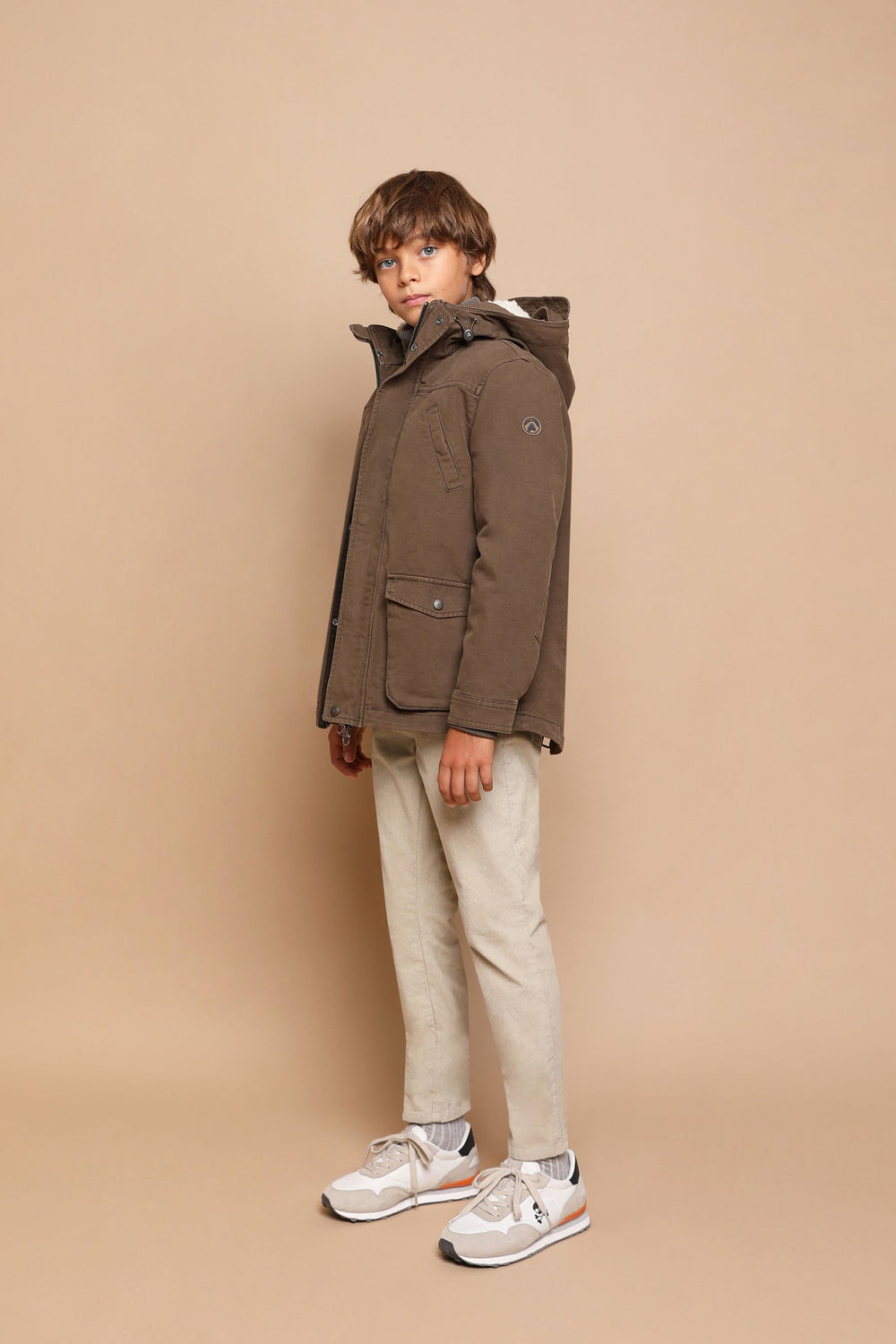 Parka with shearling lining made of 100% BCI cotton. Regular fit, collar with hood, zip fastening and snap buttons. Long sleeves, jetted and patch pockets. Adjustable hem.
