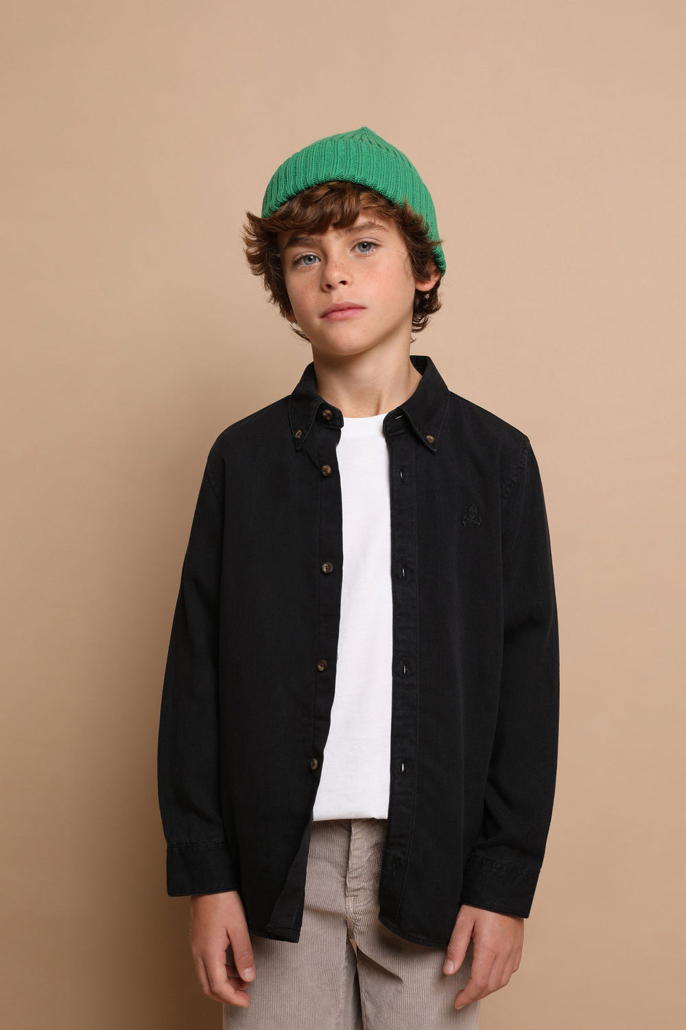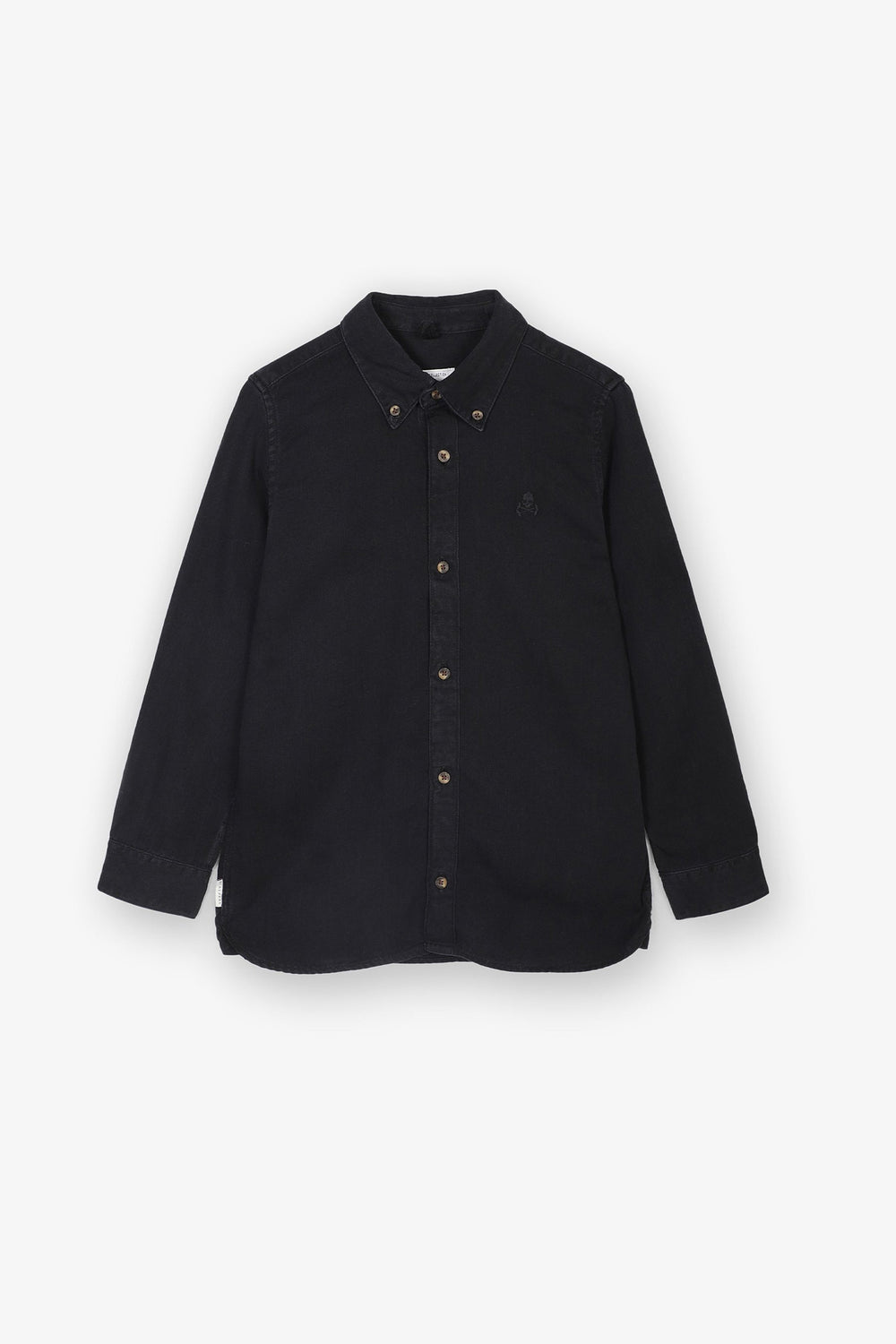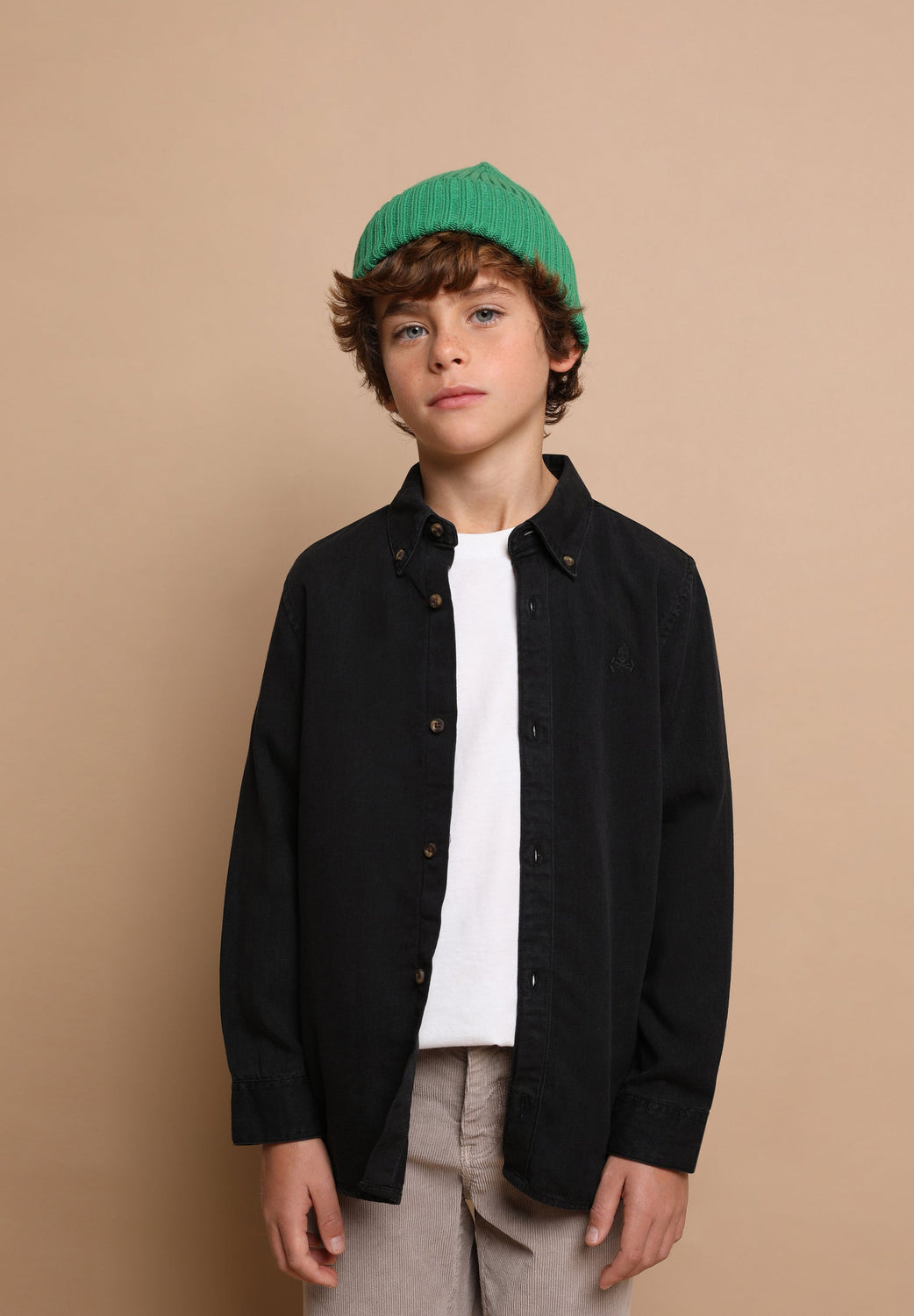 Dark denim shirt with matching embroidered skull in cotton and lyocell blend. Regular fit, collar with buttons and button fastening. Long sleeves with buttoned cuffs.