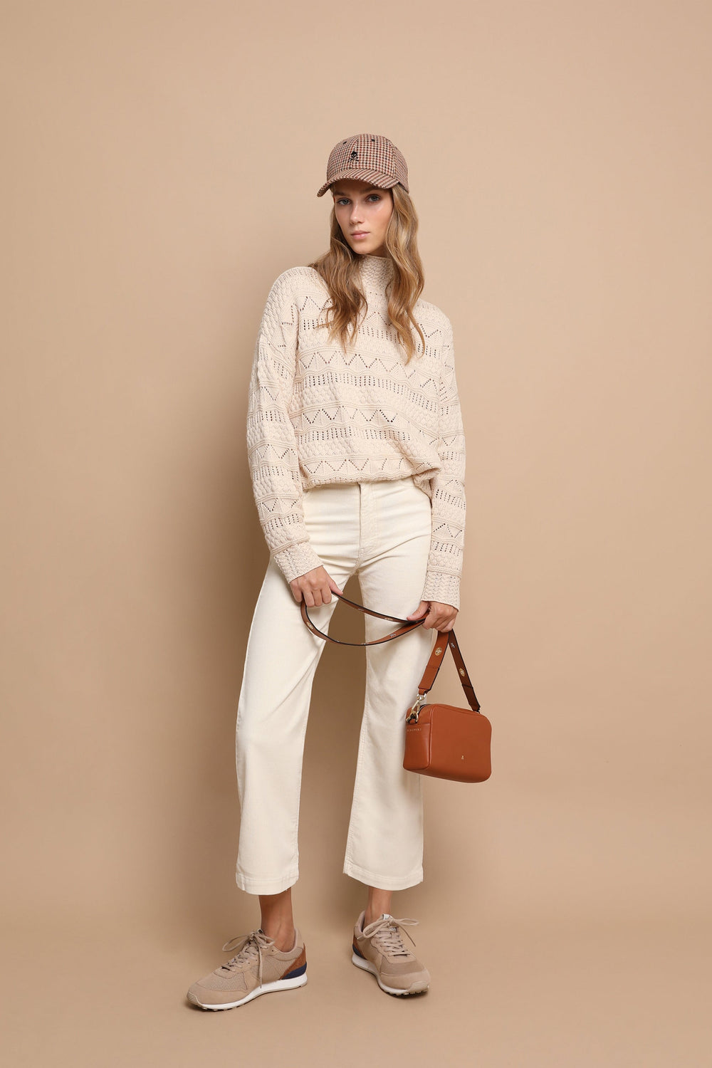 Corduroy trousers made of slightly stretch cotton fabric. Regular fit with high waist, zip and button fastening and side and back pockets. Belt loops at waist.