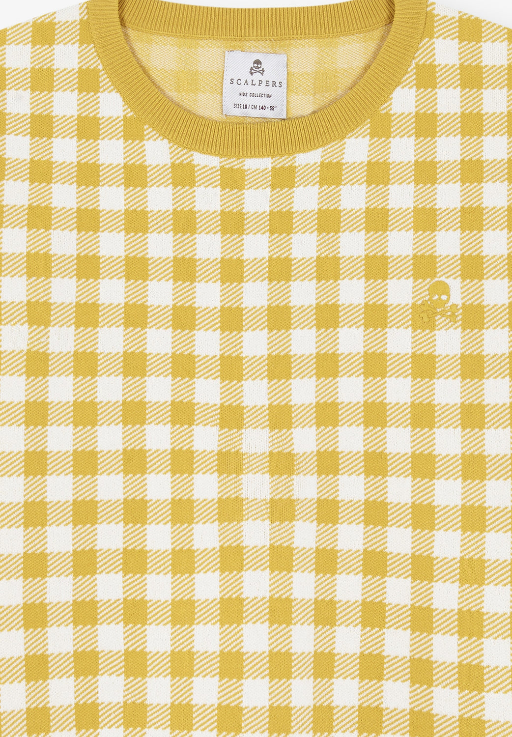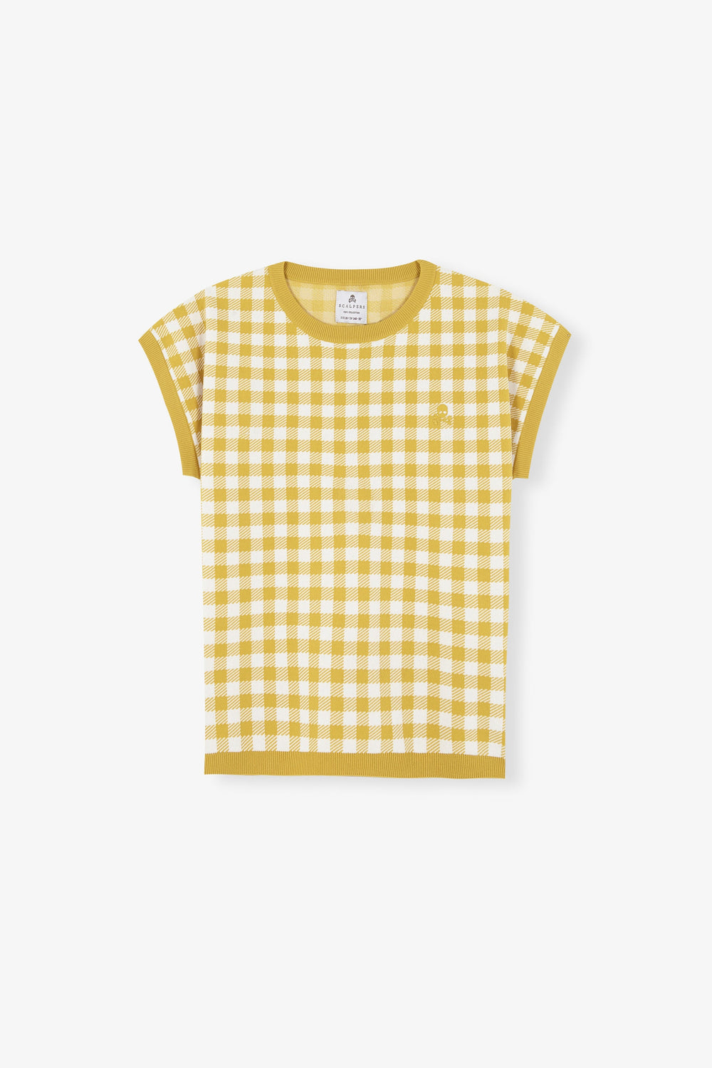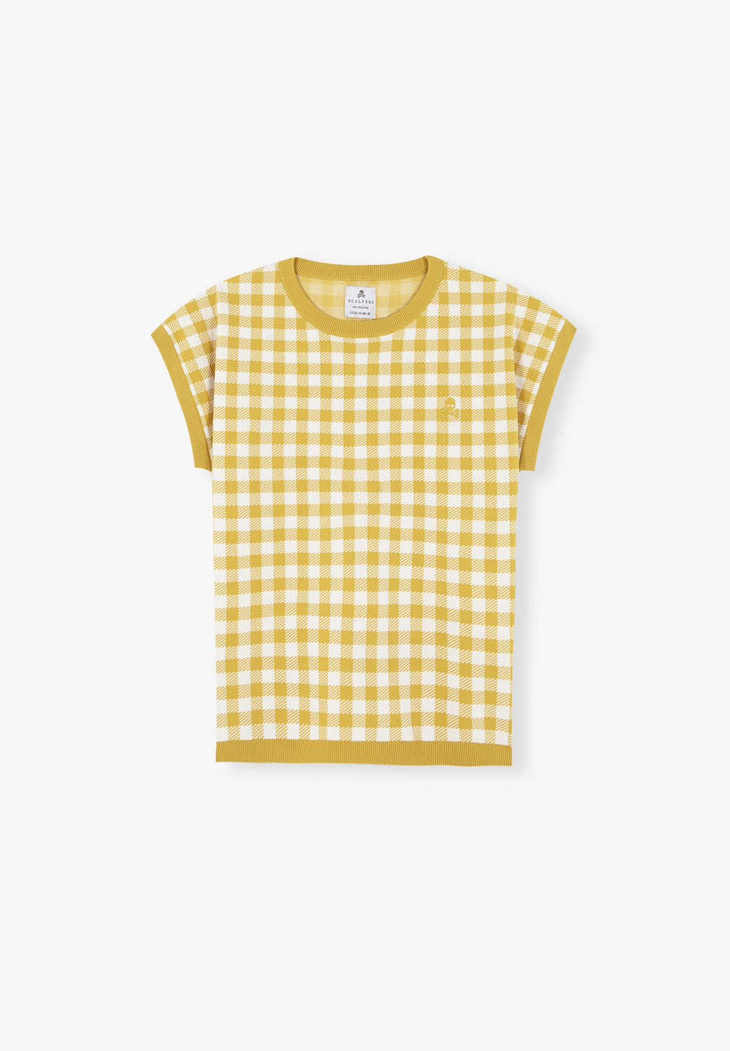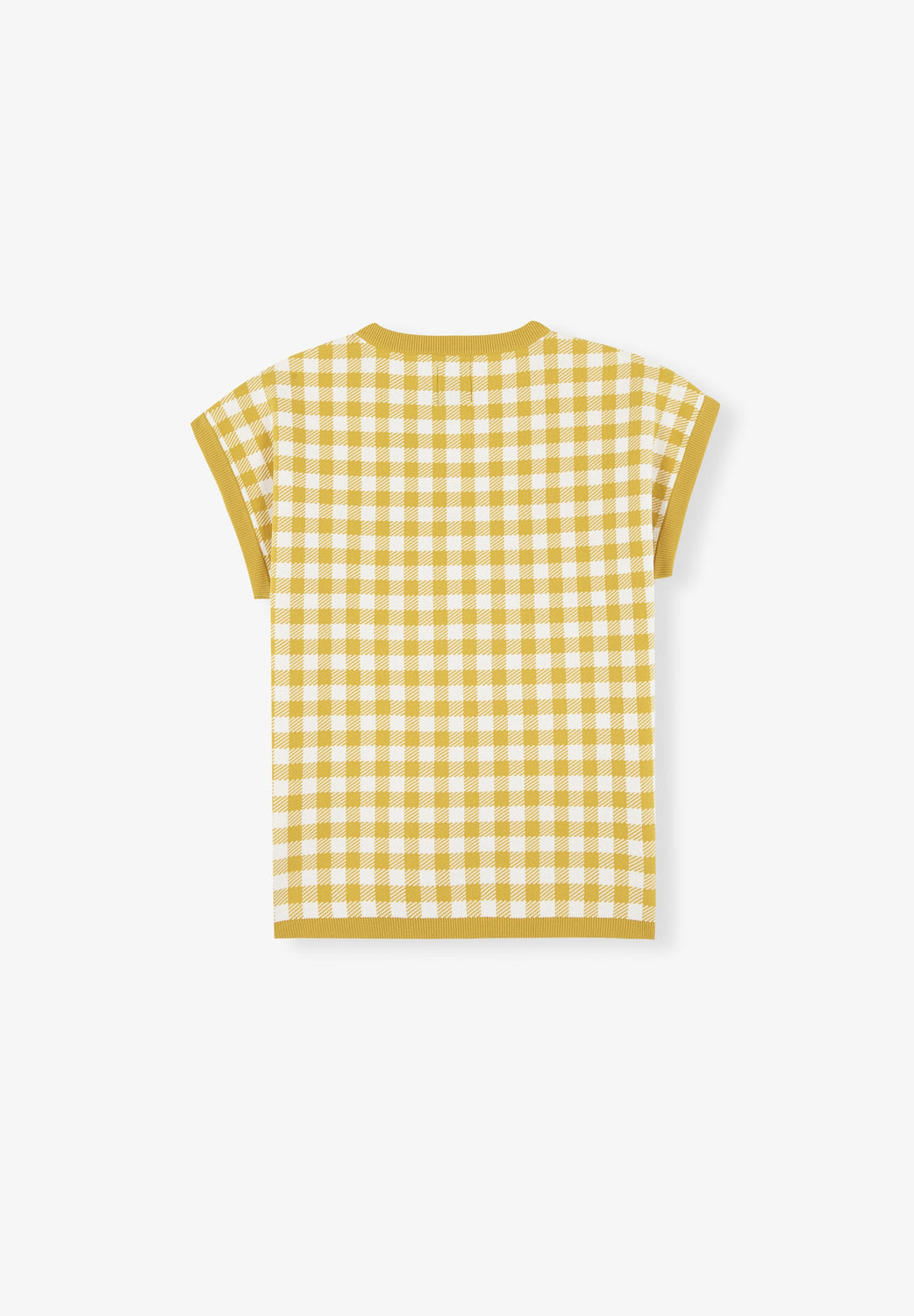 Gingham knit sweater. Regular fit, round neck and short sleeves.