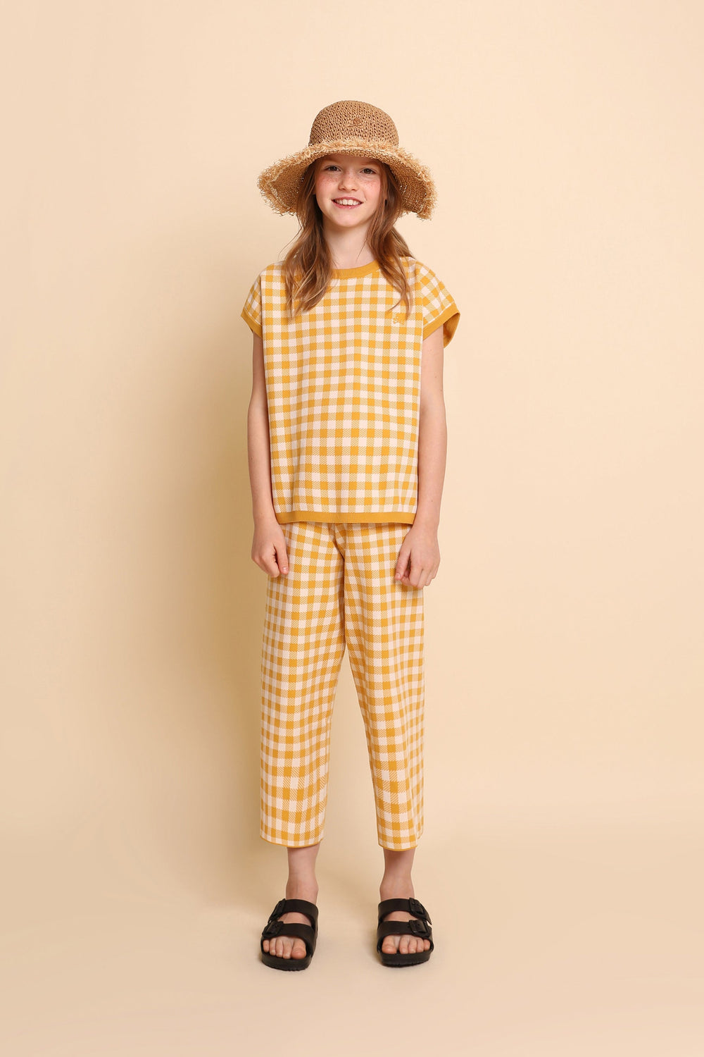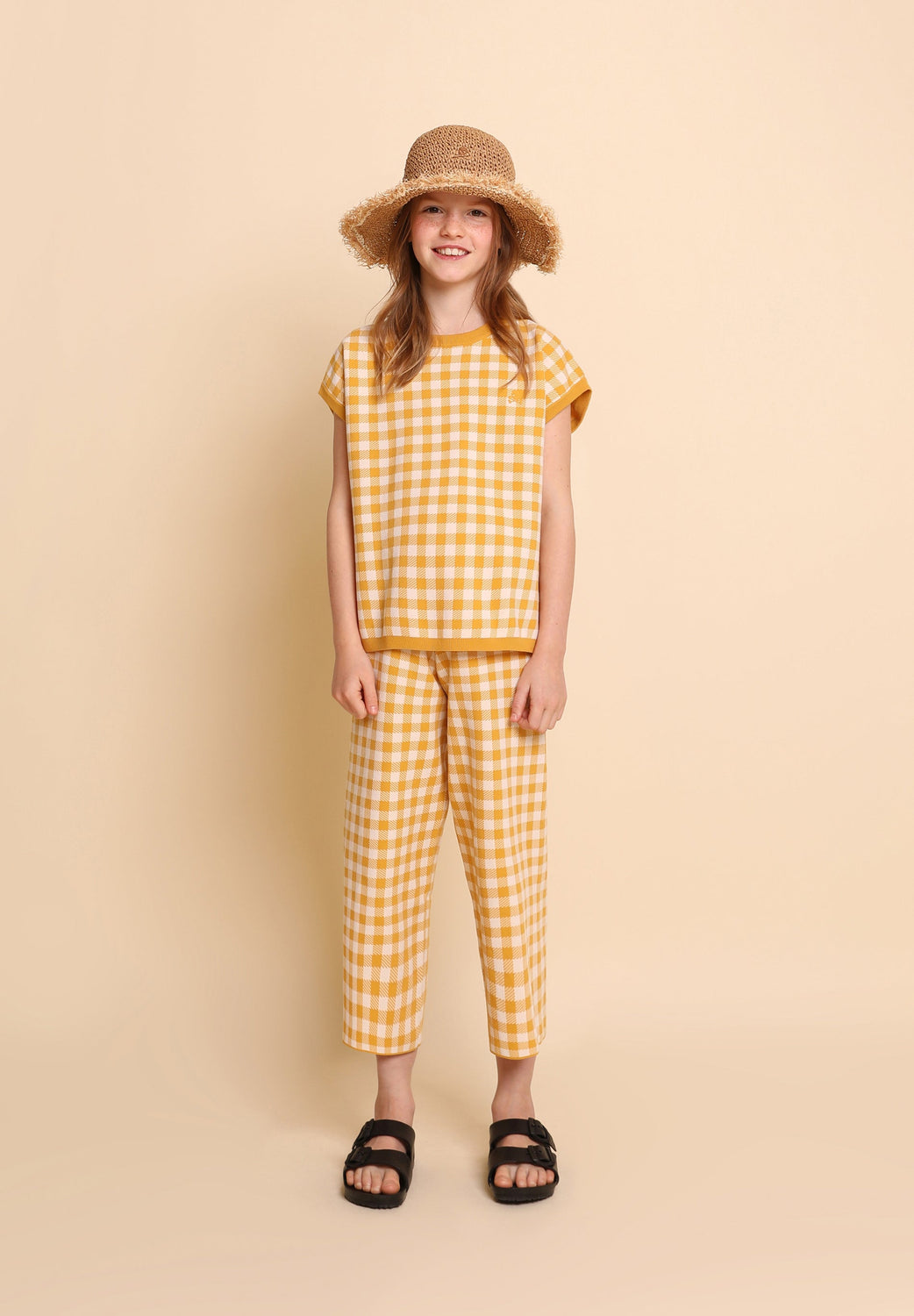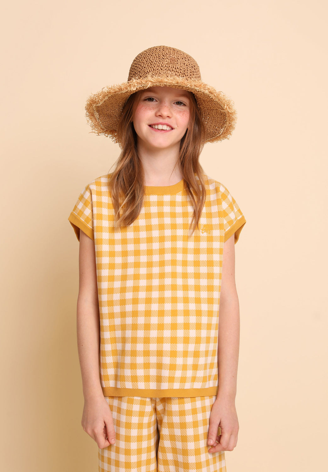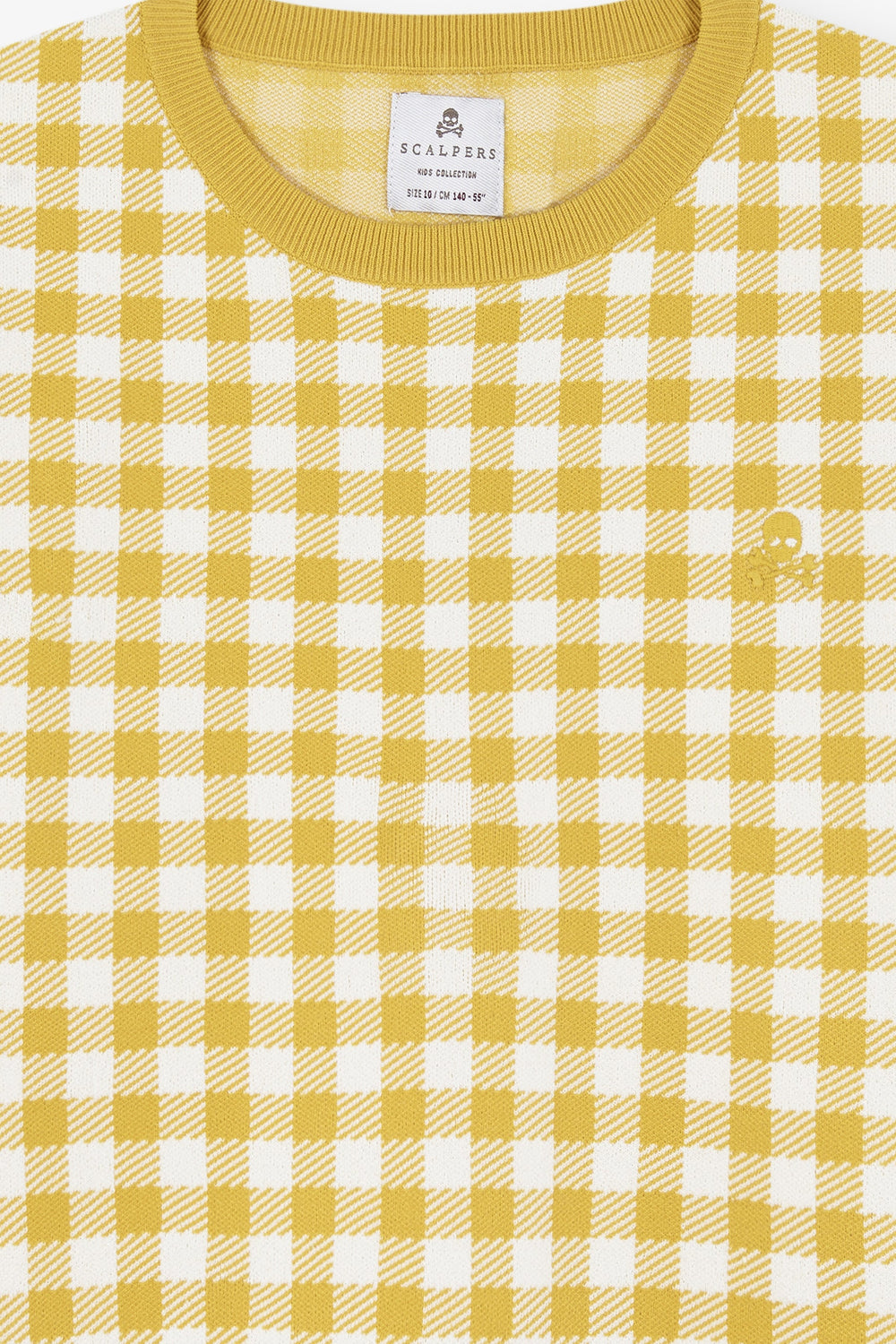 Gingham knit sweater. Regular fit, round neck and short sleeves.