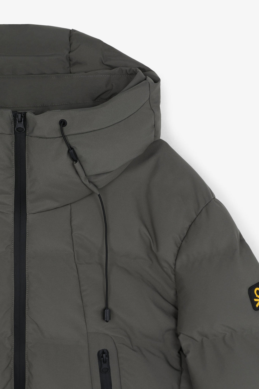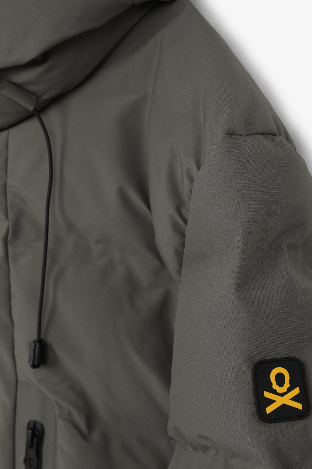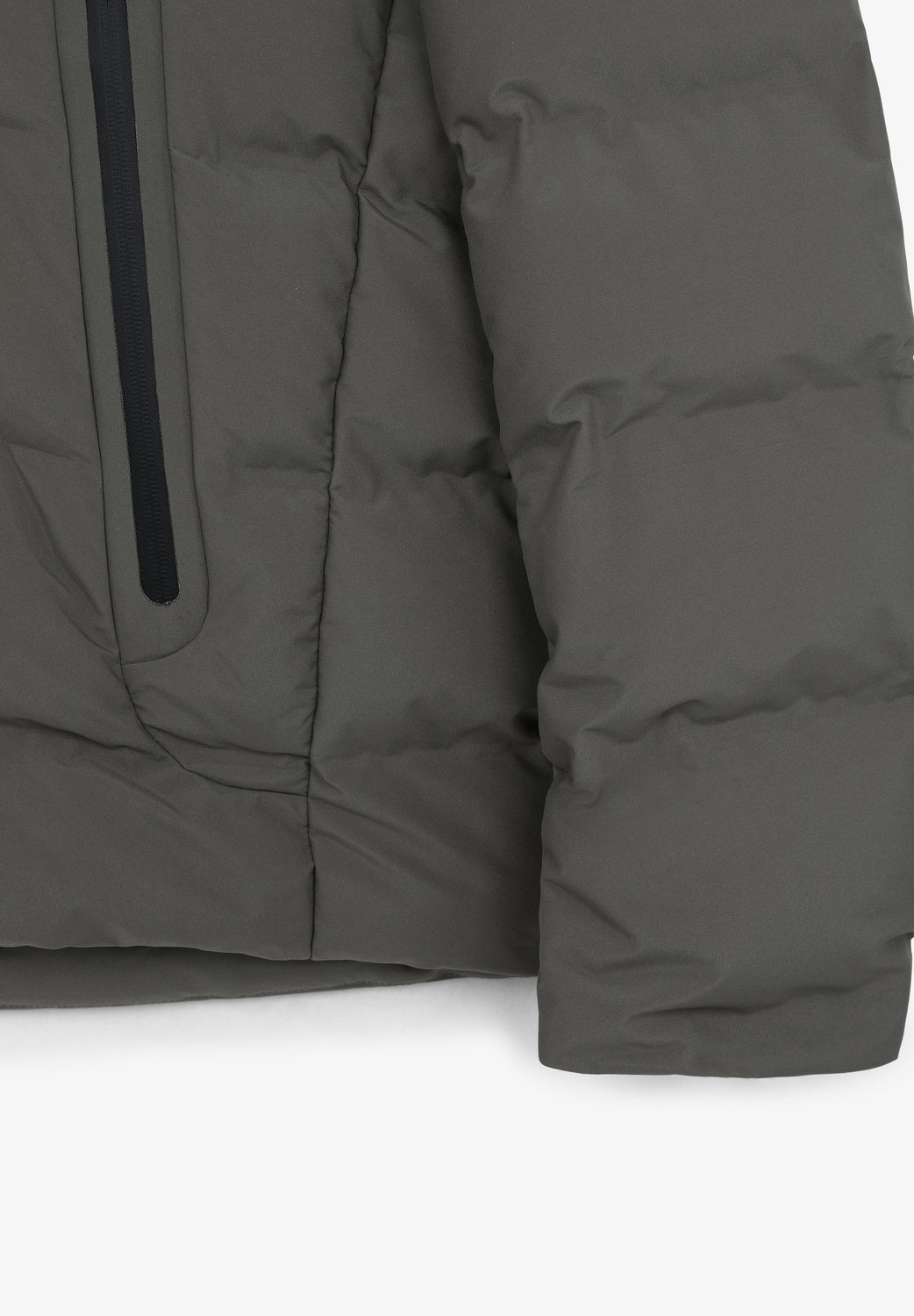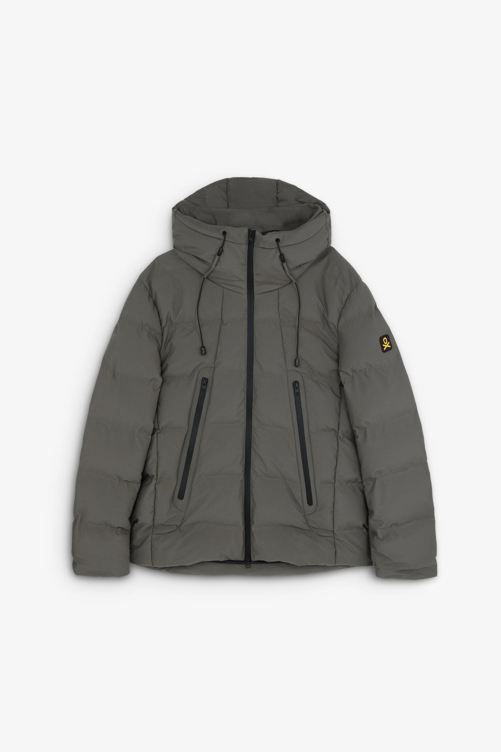 Padded technical ski jacket made of special technical fabric with windproof and waterproof properties. Regular fit cut, hooded collar with zip-foldable hood. Zip fastening with waterproof seals. Panel construction and heat sealed bands. Interior zipped security pocket, interior side mesh pockets and oversized front pockets. Rubberised sleeve patch detail.