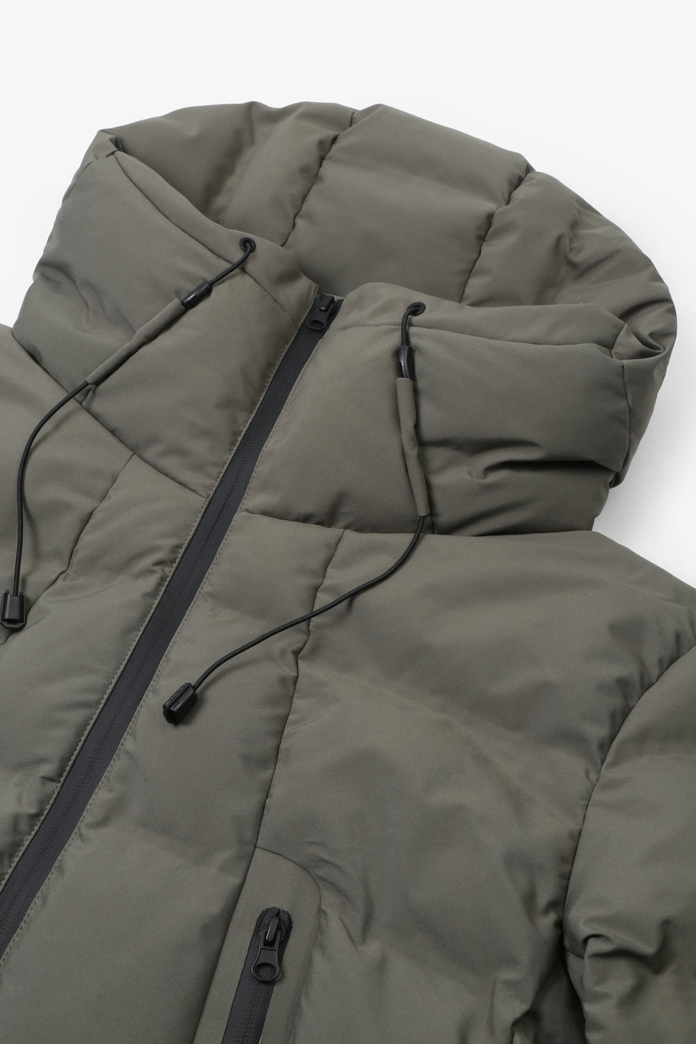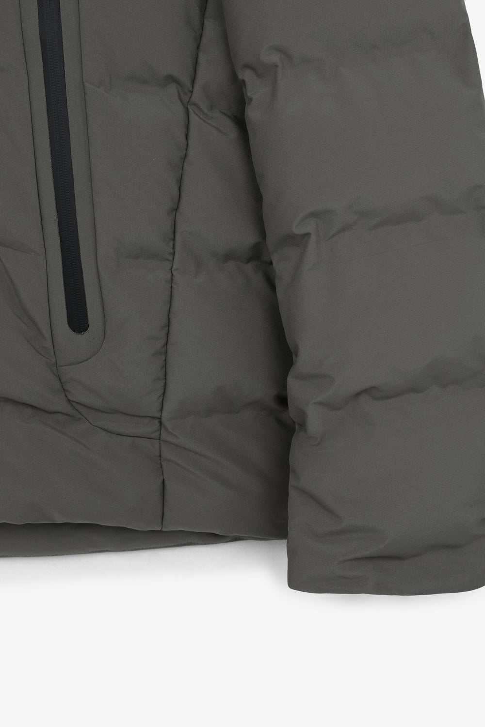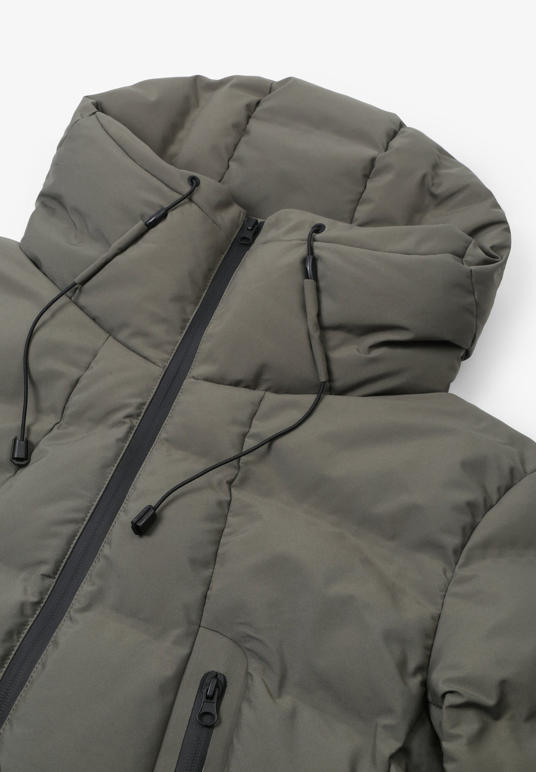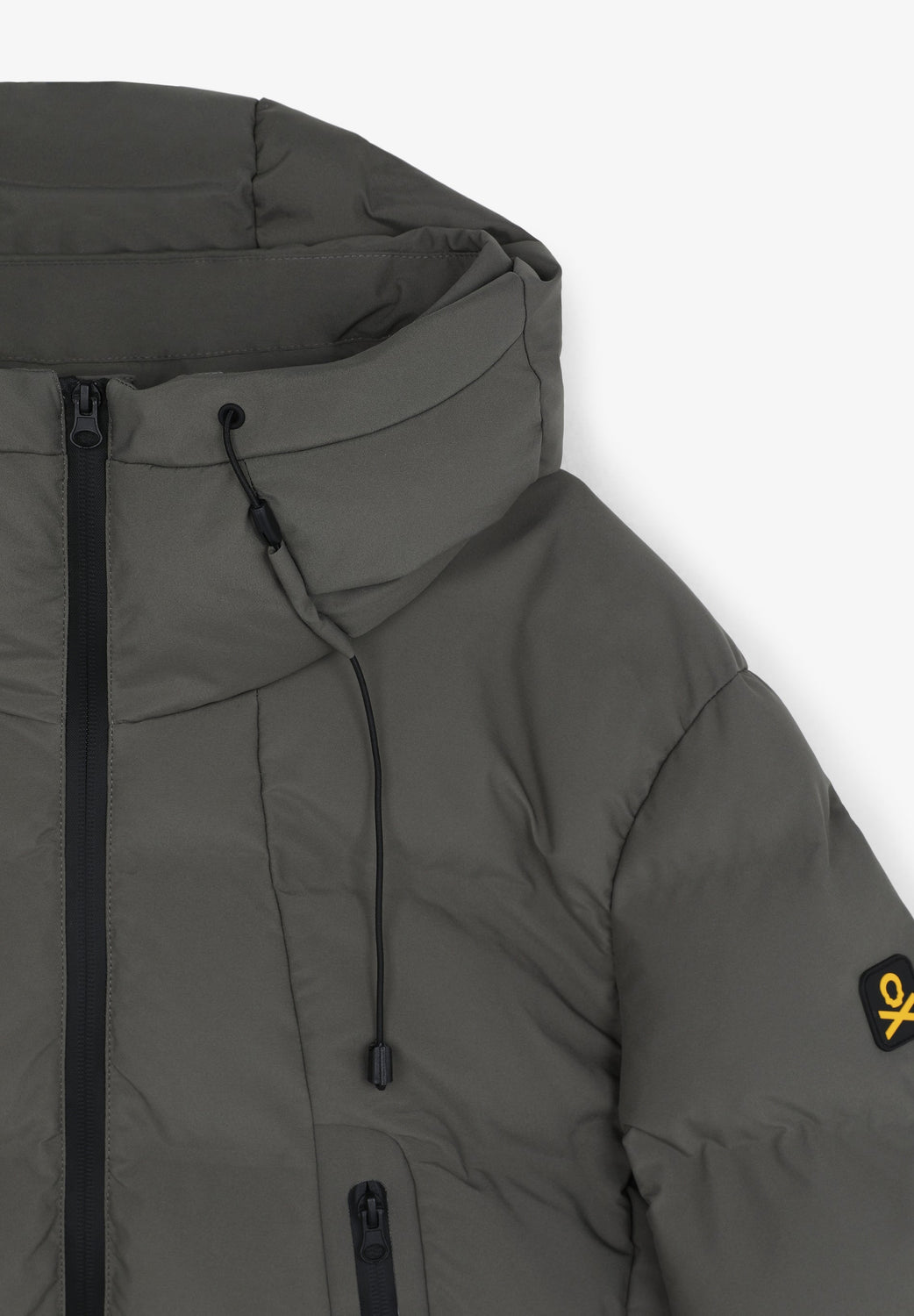 Padded technical ski jacket made of special technical fabric with windproof and waterproof properties. Regular fit cut, hooded collar with zip-foldable hood. Zip fastening with waterproof seals. Panel construction and heat sealed bands. Interior zipped security pocket, interior side mesh pockets and oversized front pockets. Rubberised sleeve patch detail.