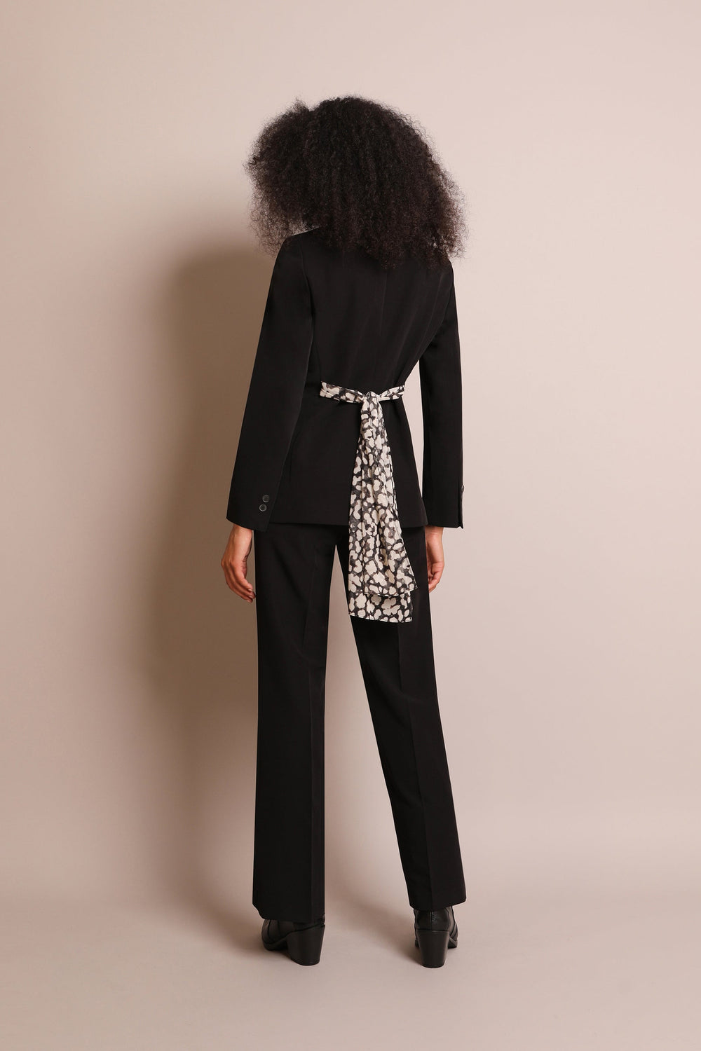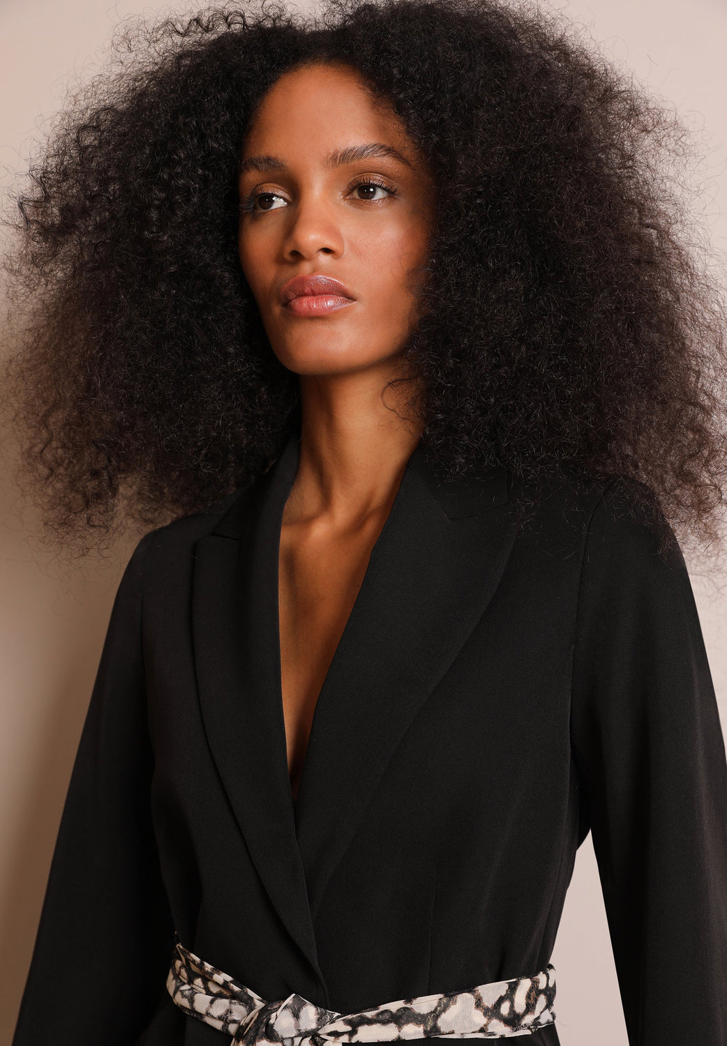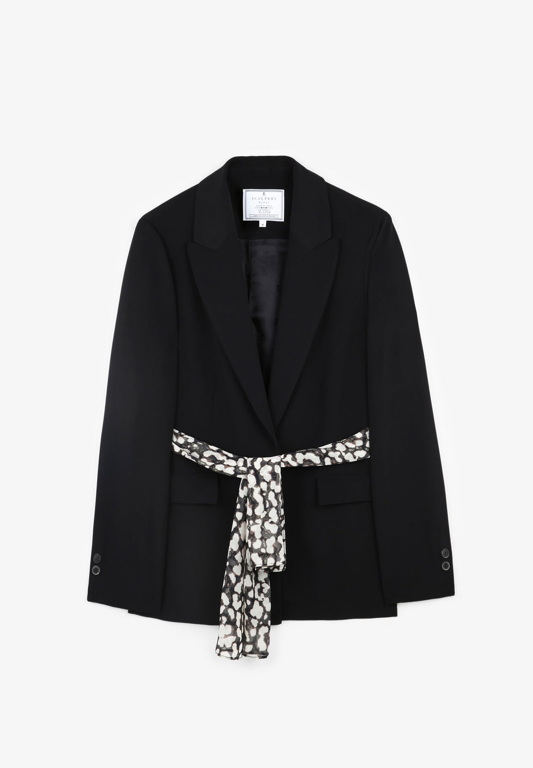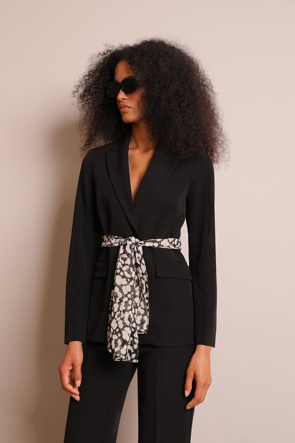 Blazer with a belt. Made from flowing fabric, with a button fastening, long sleeves with buttons, front flap pockets on the sides and an animal print handkerchief belt.