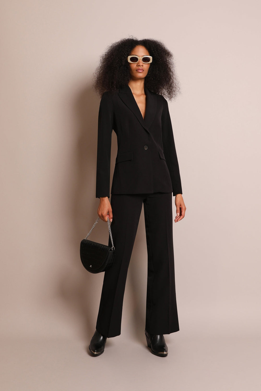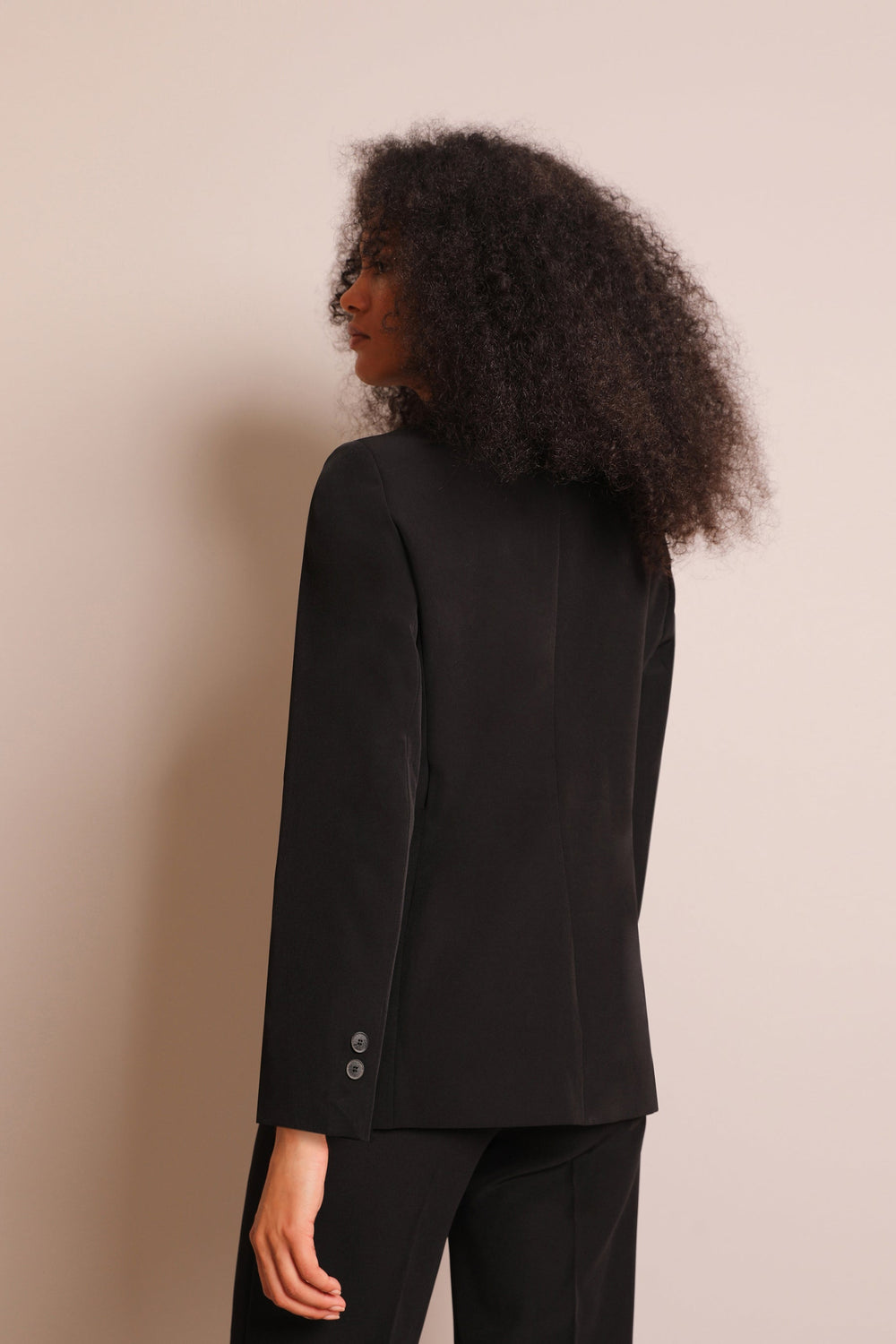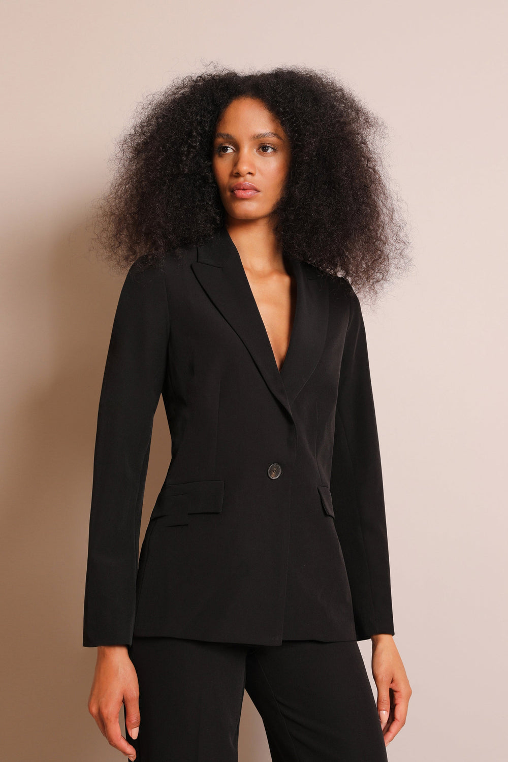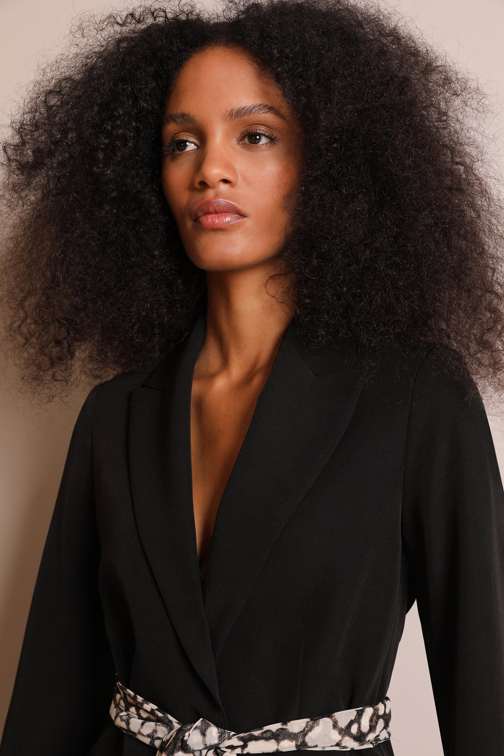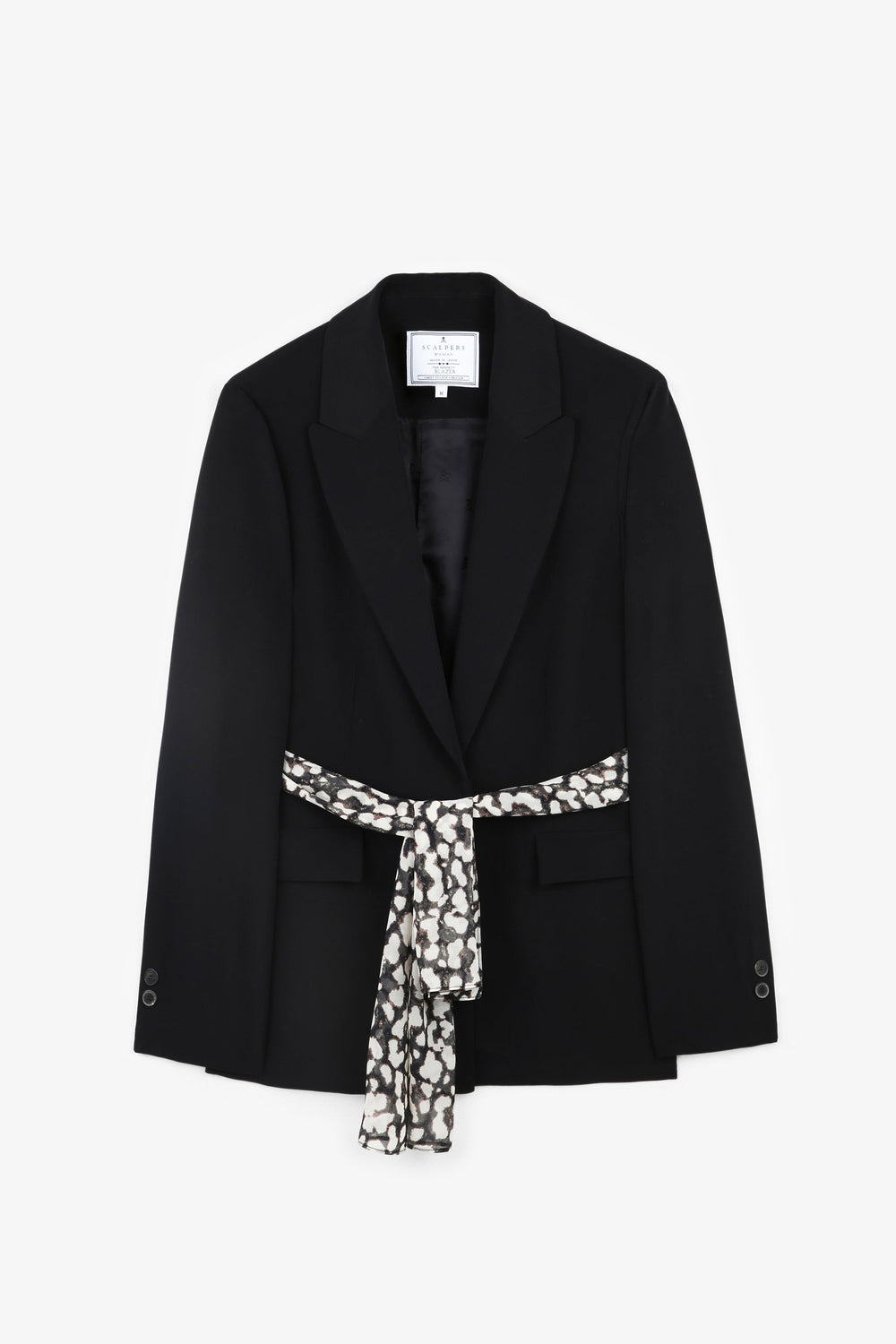 Blazer with a belt. Made from flowing fabric, with a button fastening, long sleeves with buttons, front flap pockets on the sides and an animal print handkerchief belt.