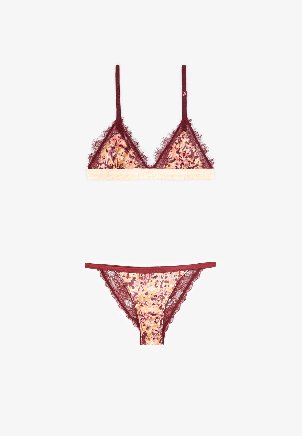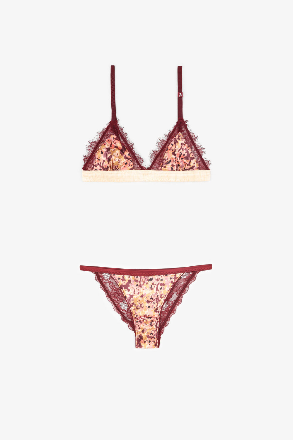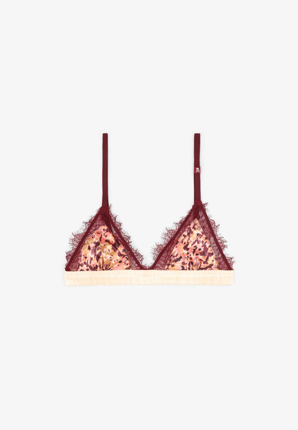 Print bra made of satin fabric. Adjustable shoulder straps, hook-and-eye fastening and elastic bottom band. Lace trim detail on the neckline.