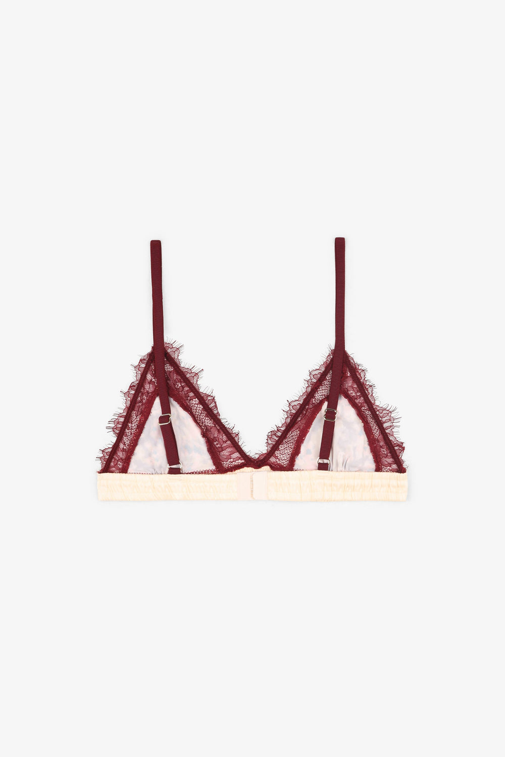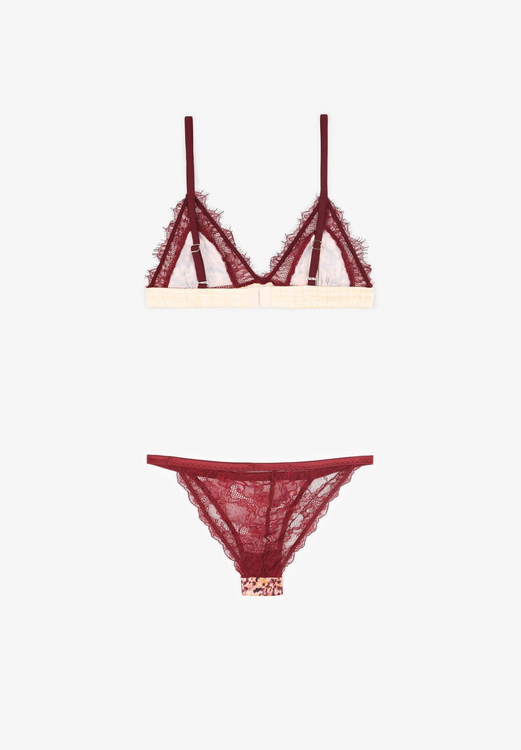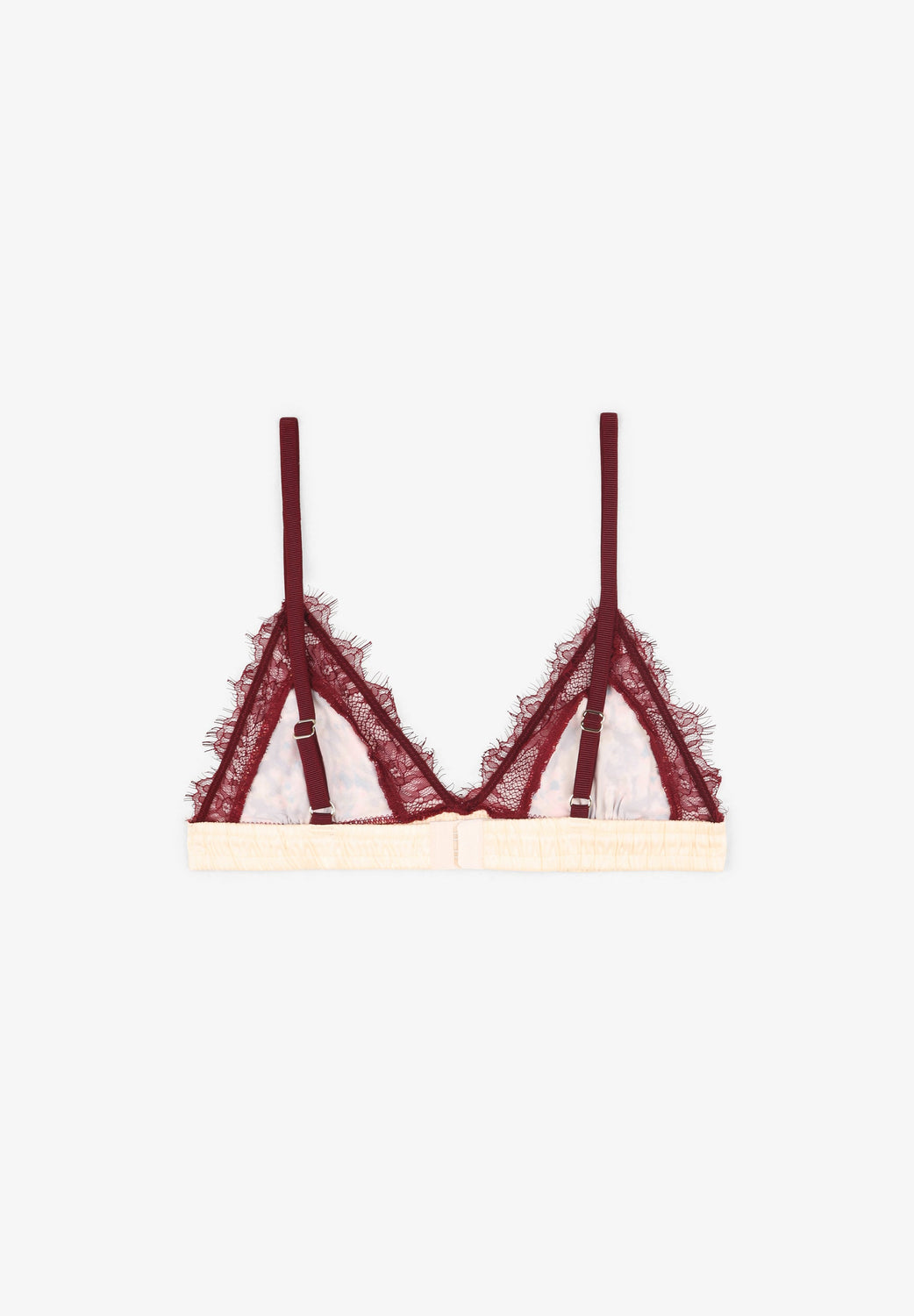 Print bra made of satin fabric. Adjustable shoulder straps, hook-and-eye fastening and elastic bottom band. Lace trim detail on the neckline.