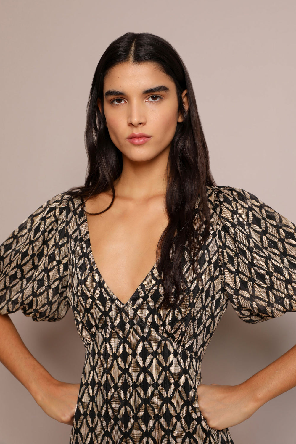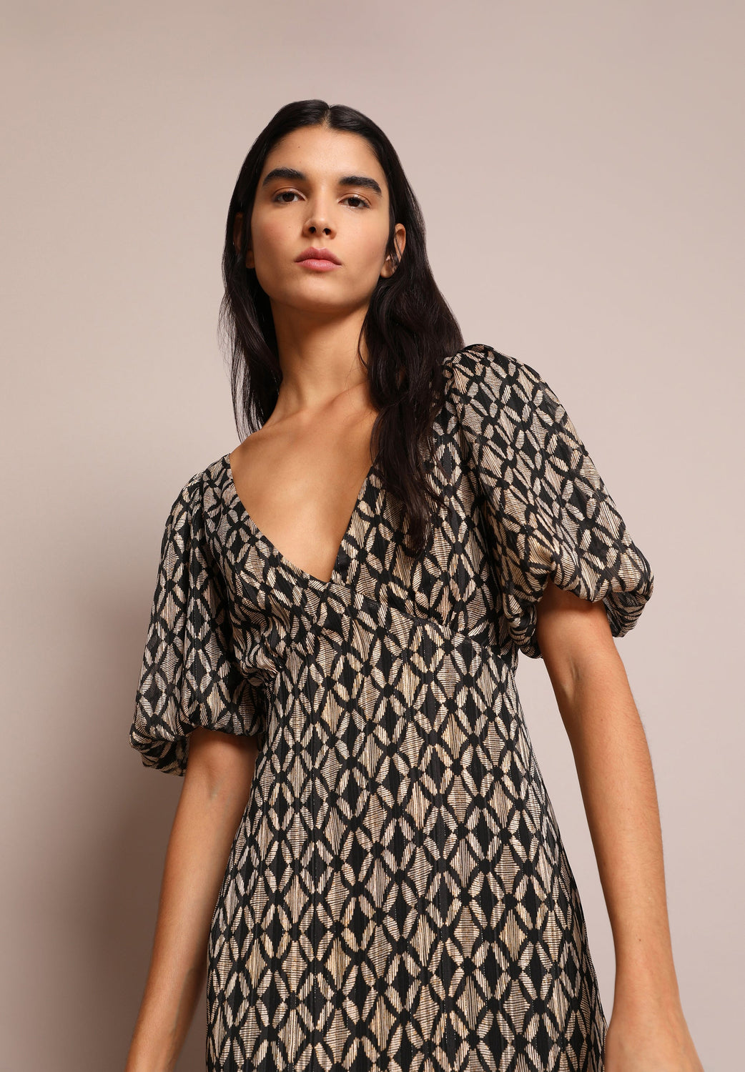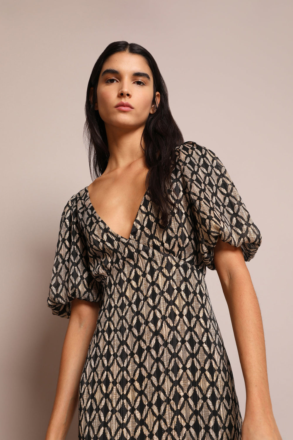 Midi dress with metallic print. Made in metallic fabric. Slim fit cut. V-neckline. Open back with loops. Short puffed sleeves. Ruffle at the hem