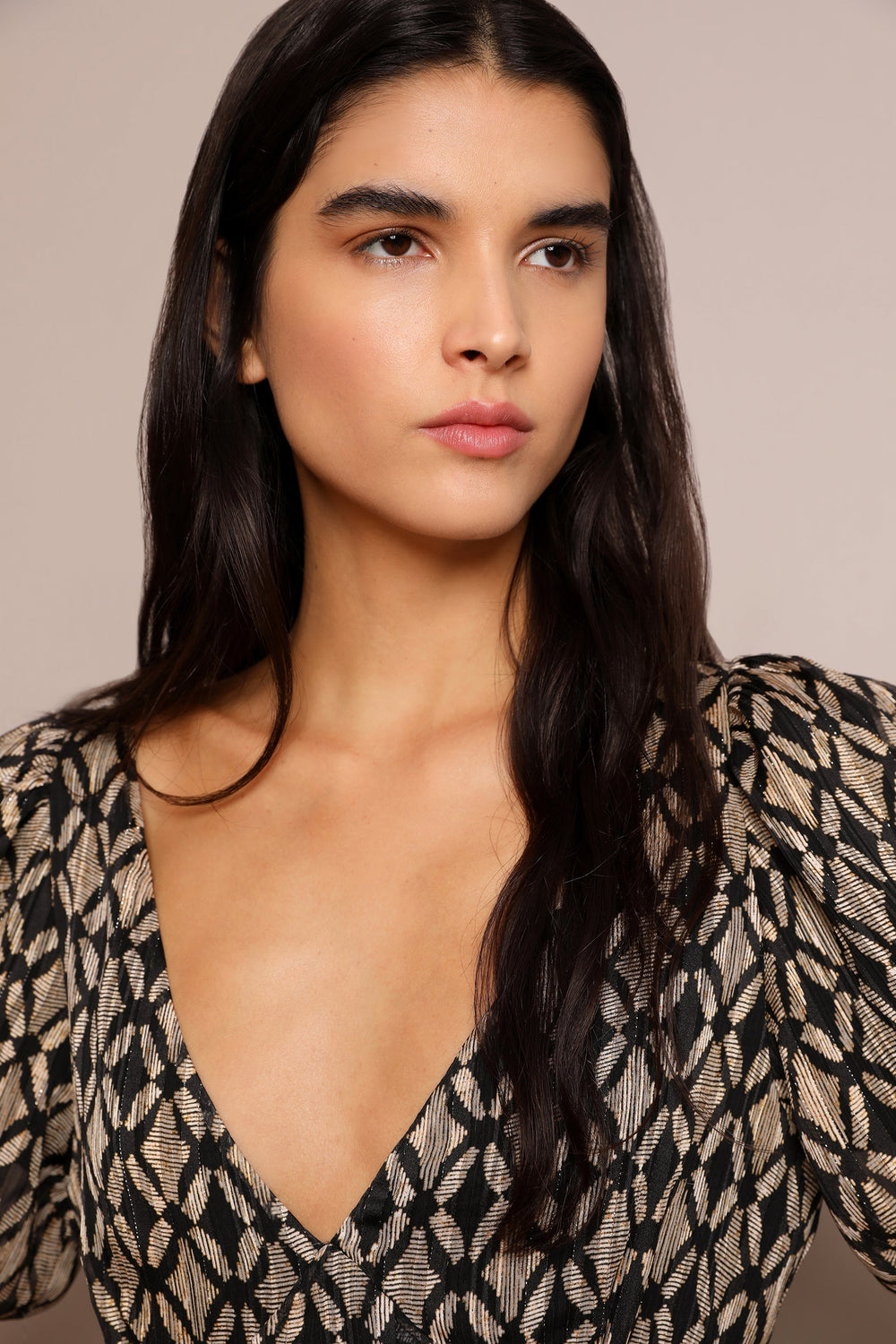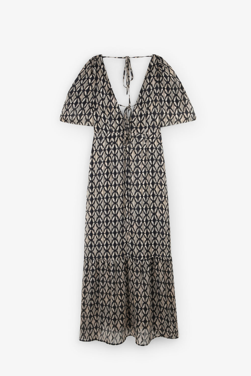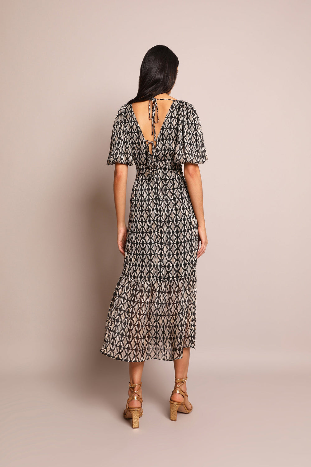 Midi dress with metallic print. Made in metallic fabric. Slim fit cut. V-neckline. Open back with loops. Short puffed sleeves. Ruffle at the hem