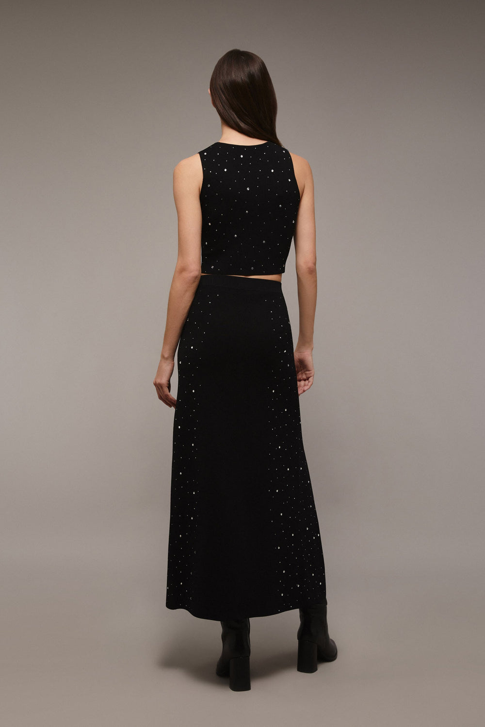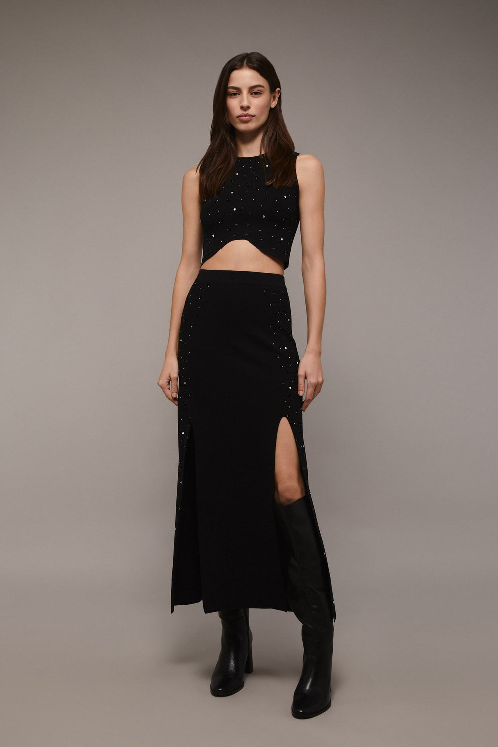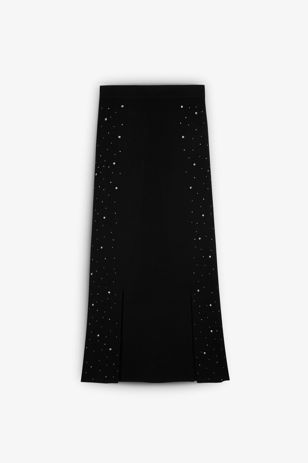 Knit midi skirt with bead appliqué detail on the sides.