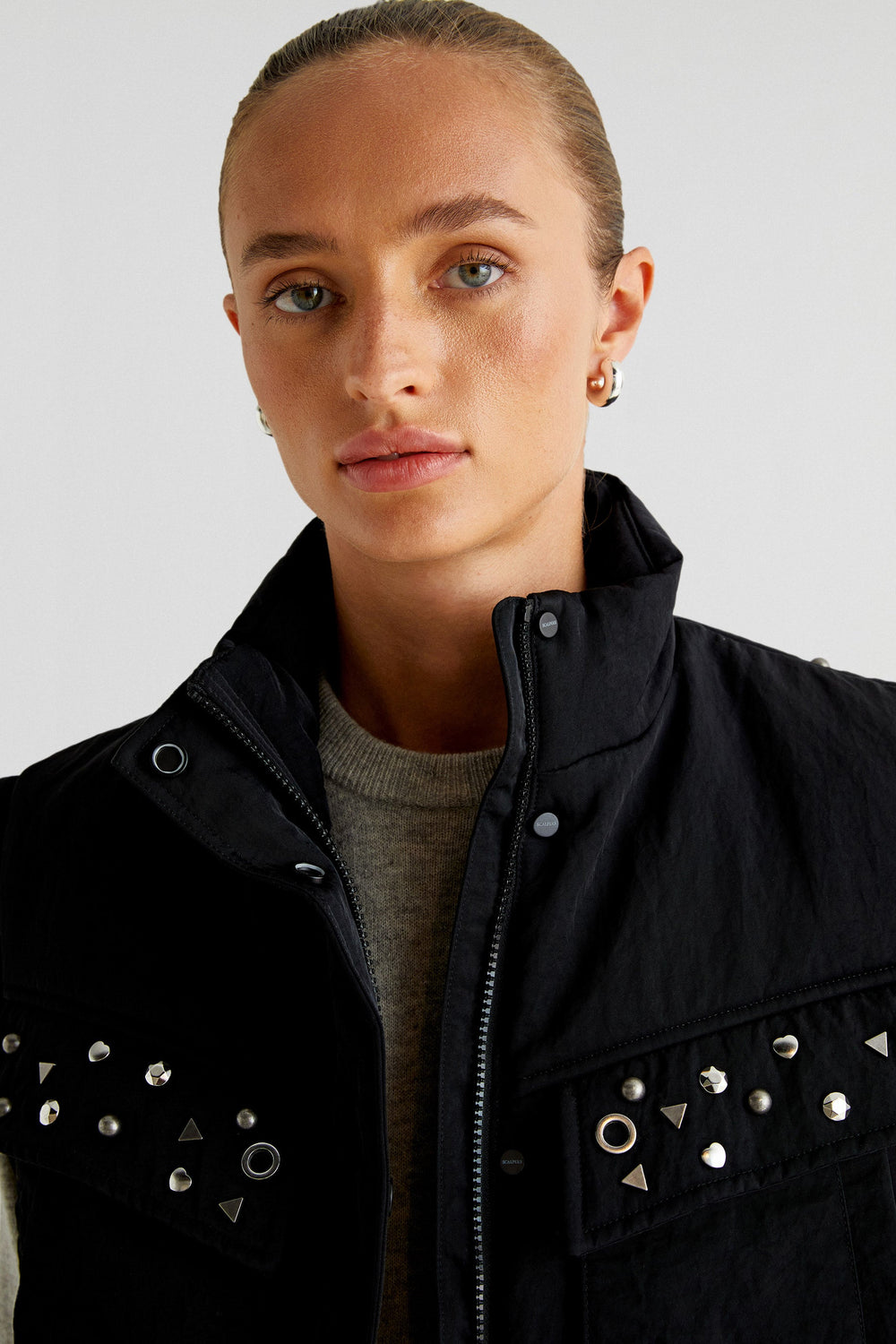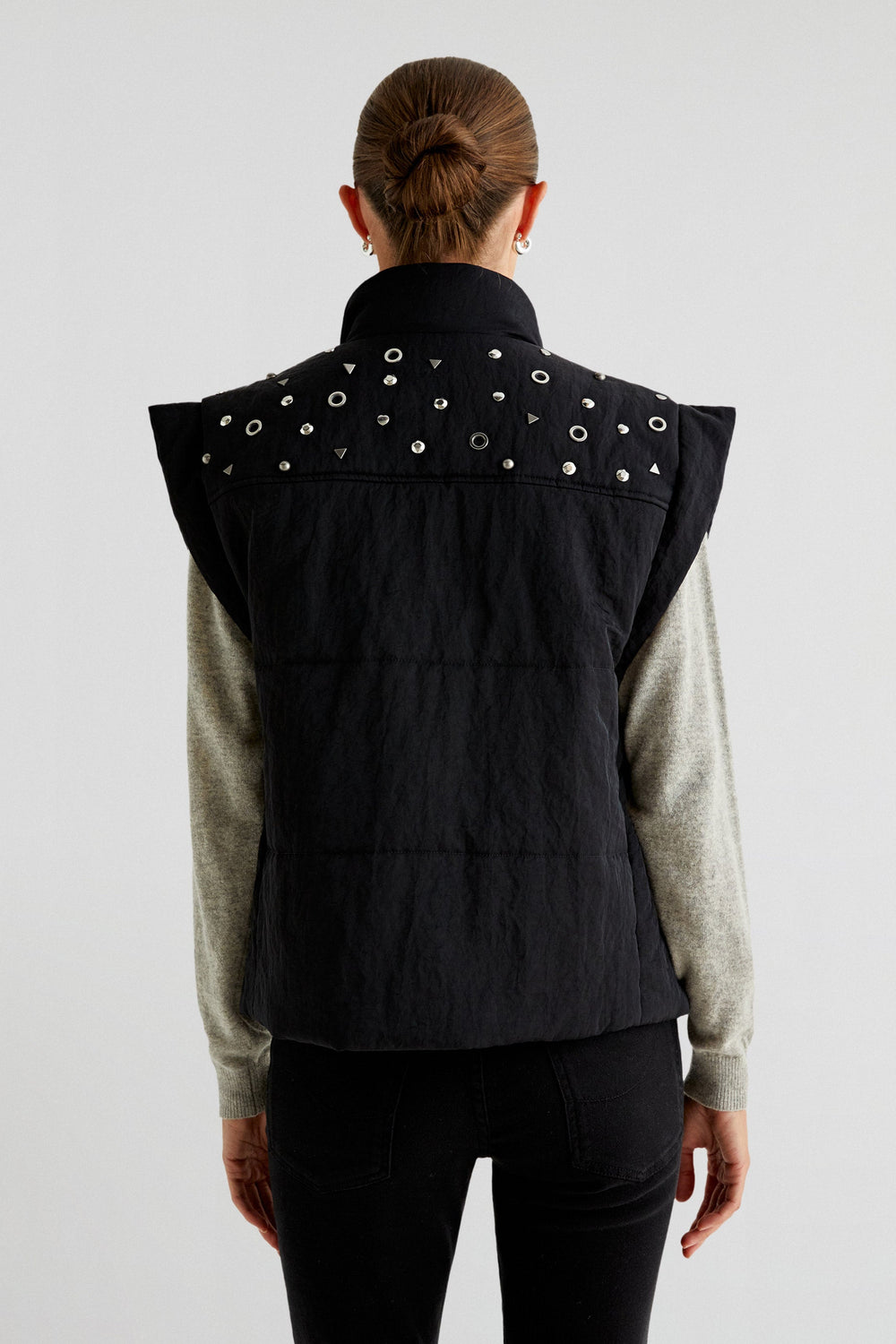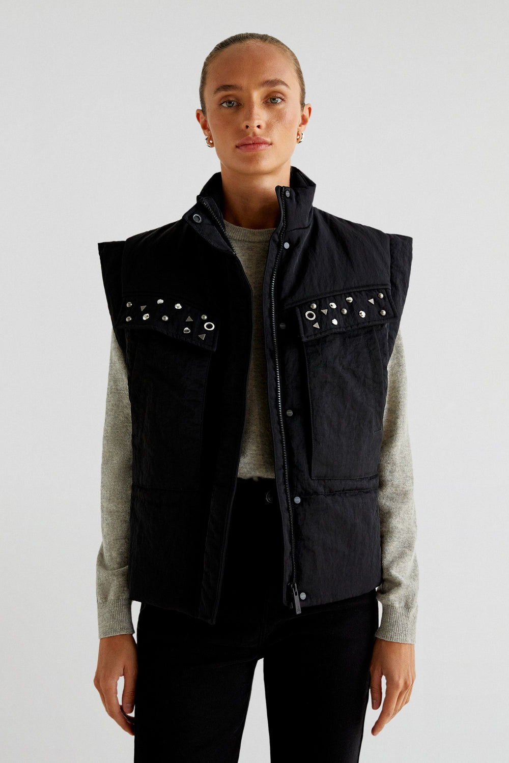 Gilet made of recycled fabric. Slightly oversize, high collar and zip and snap button fastening. Sleeveless with detail and large flap pockets. Studs on pockets and back.