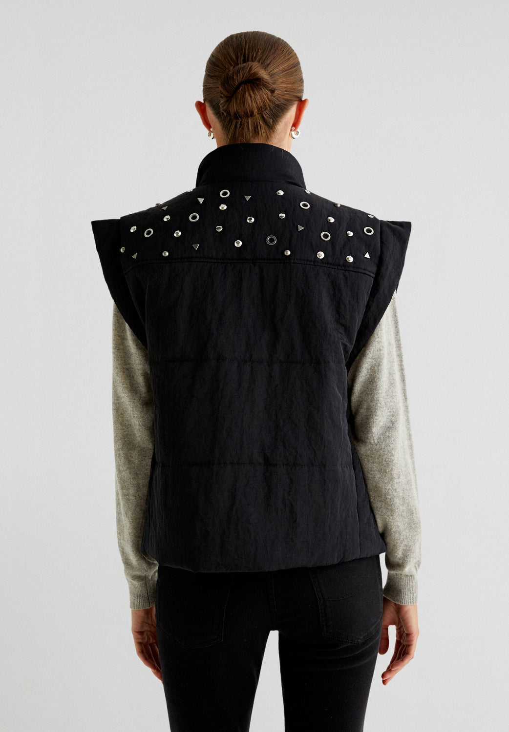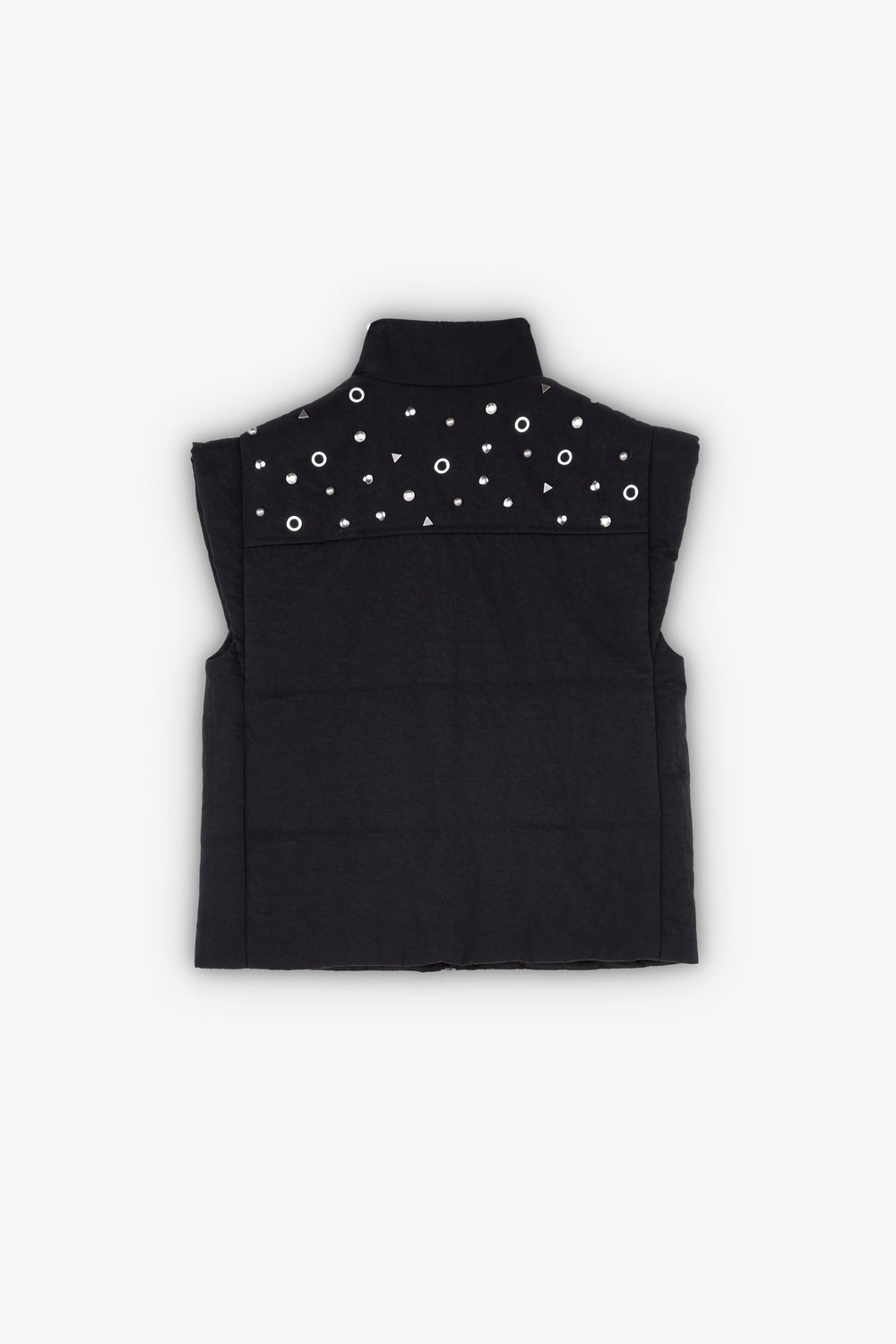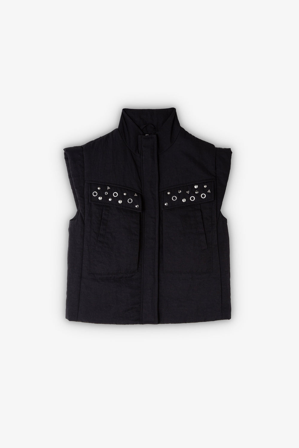 Gilet made of recycled fabric. Slightly oversize, high collar and zip and snap button fastening. Sleeveless with detail and large flap pockets. Studs on pockets and back.