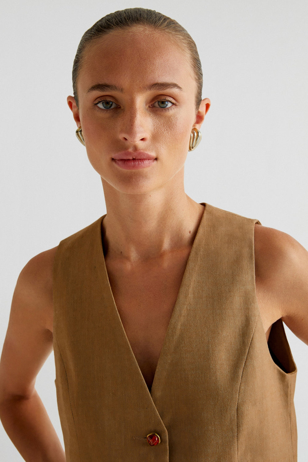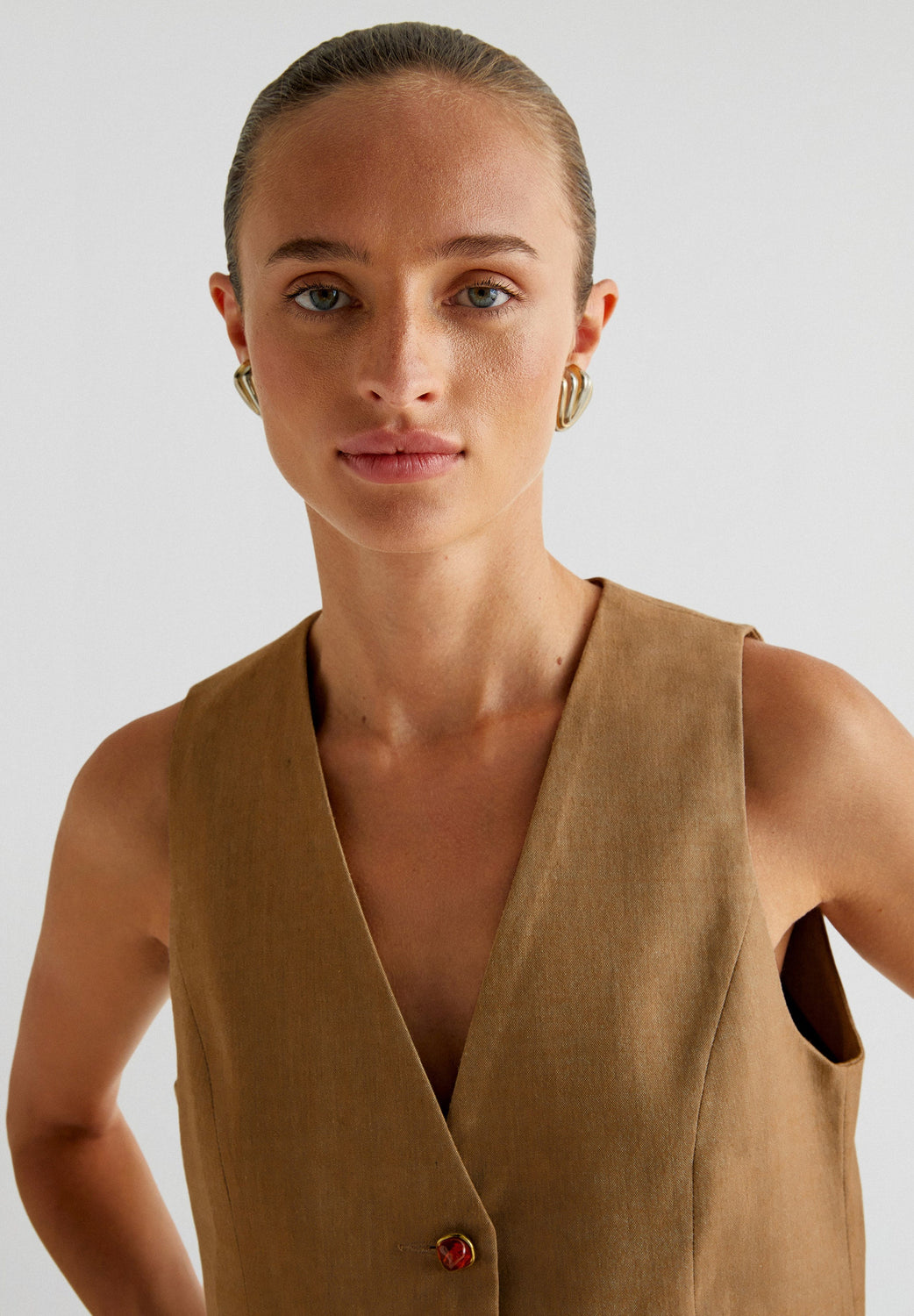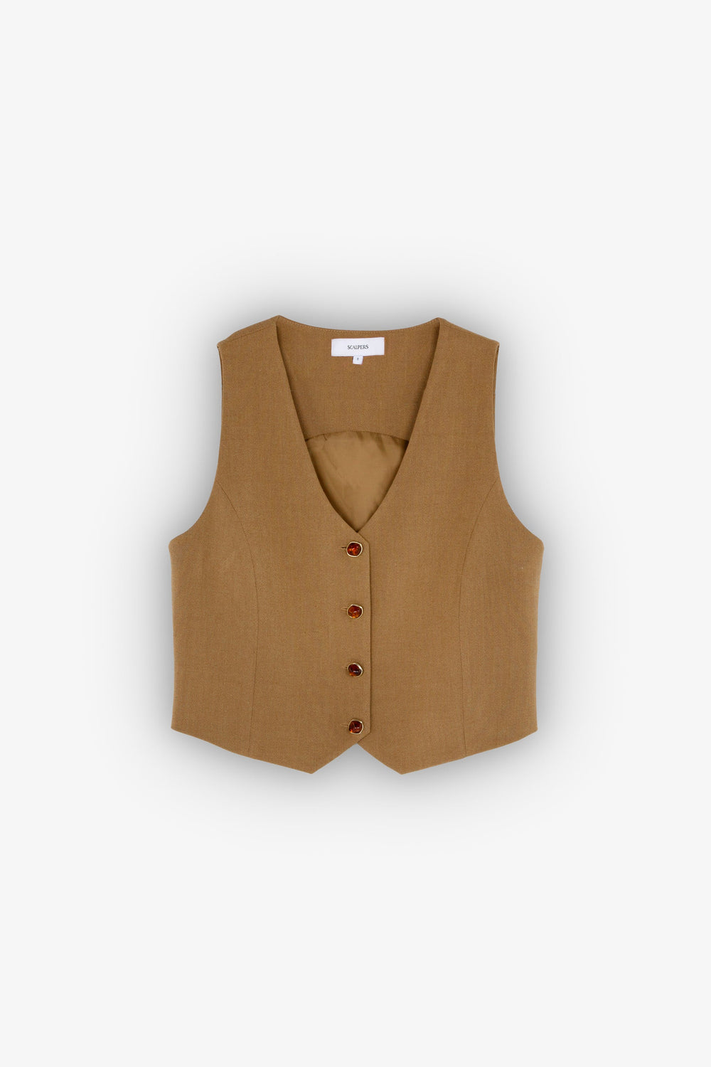 Cropped waistcoat. Slim fit, V-neck and button fastening. Sleeveless design.