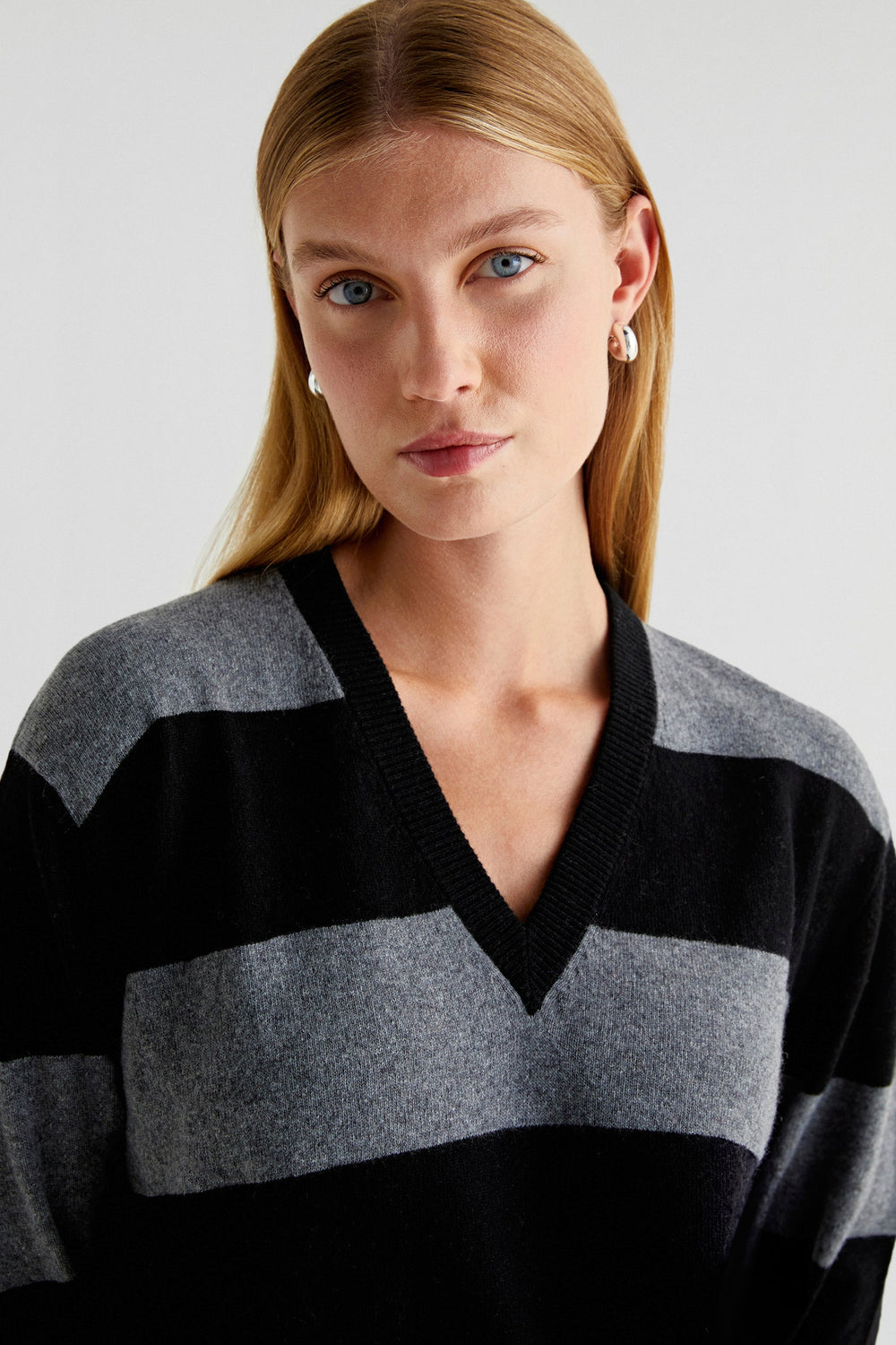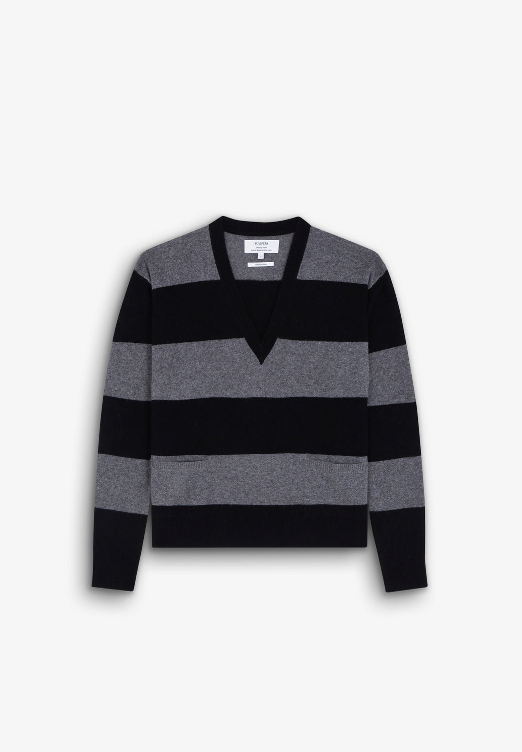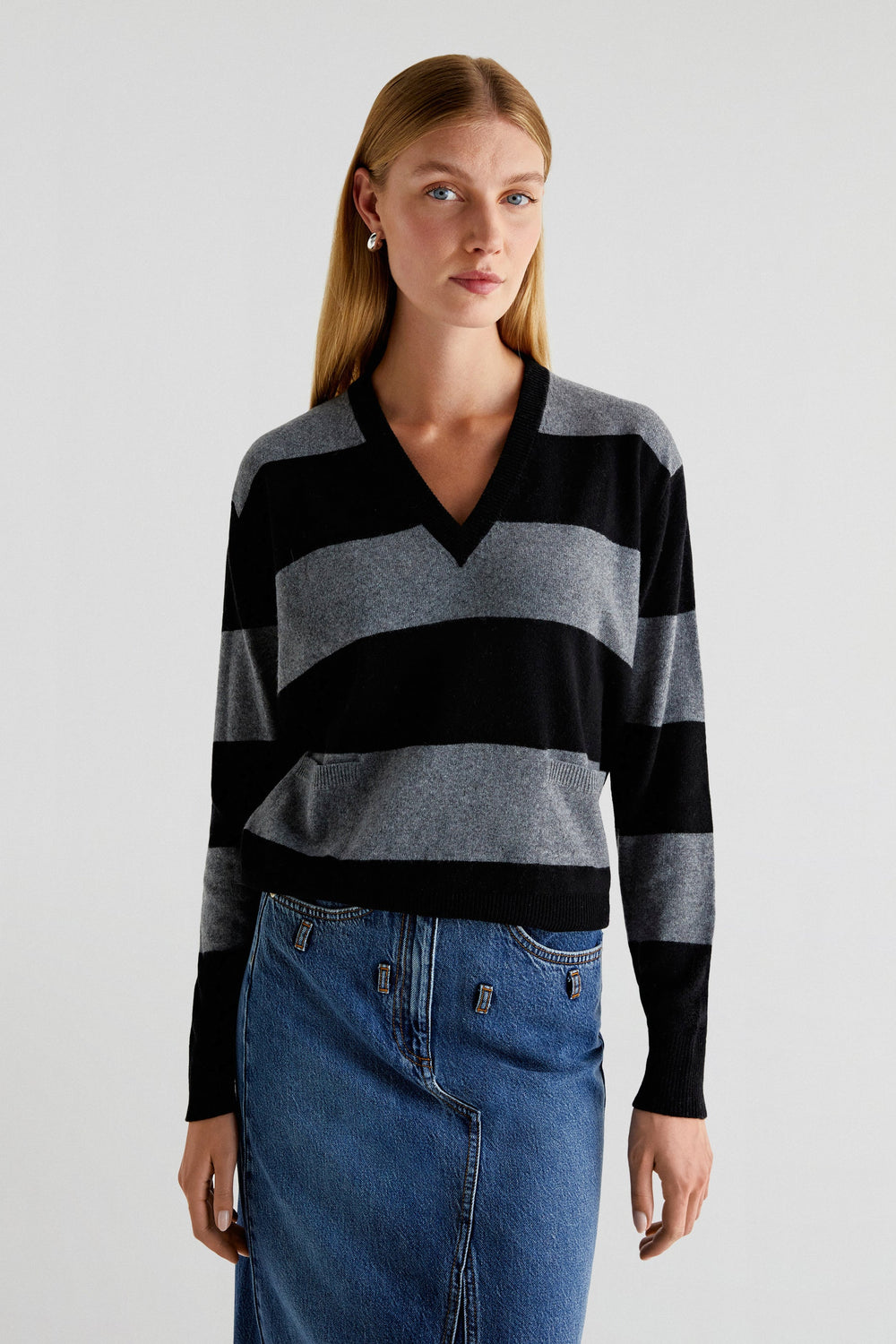 STRIPED SWEATER WITH POCKETS AND V-NECK