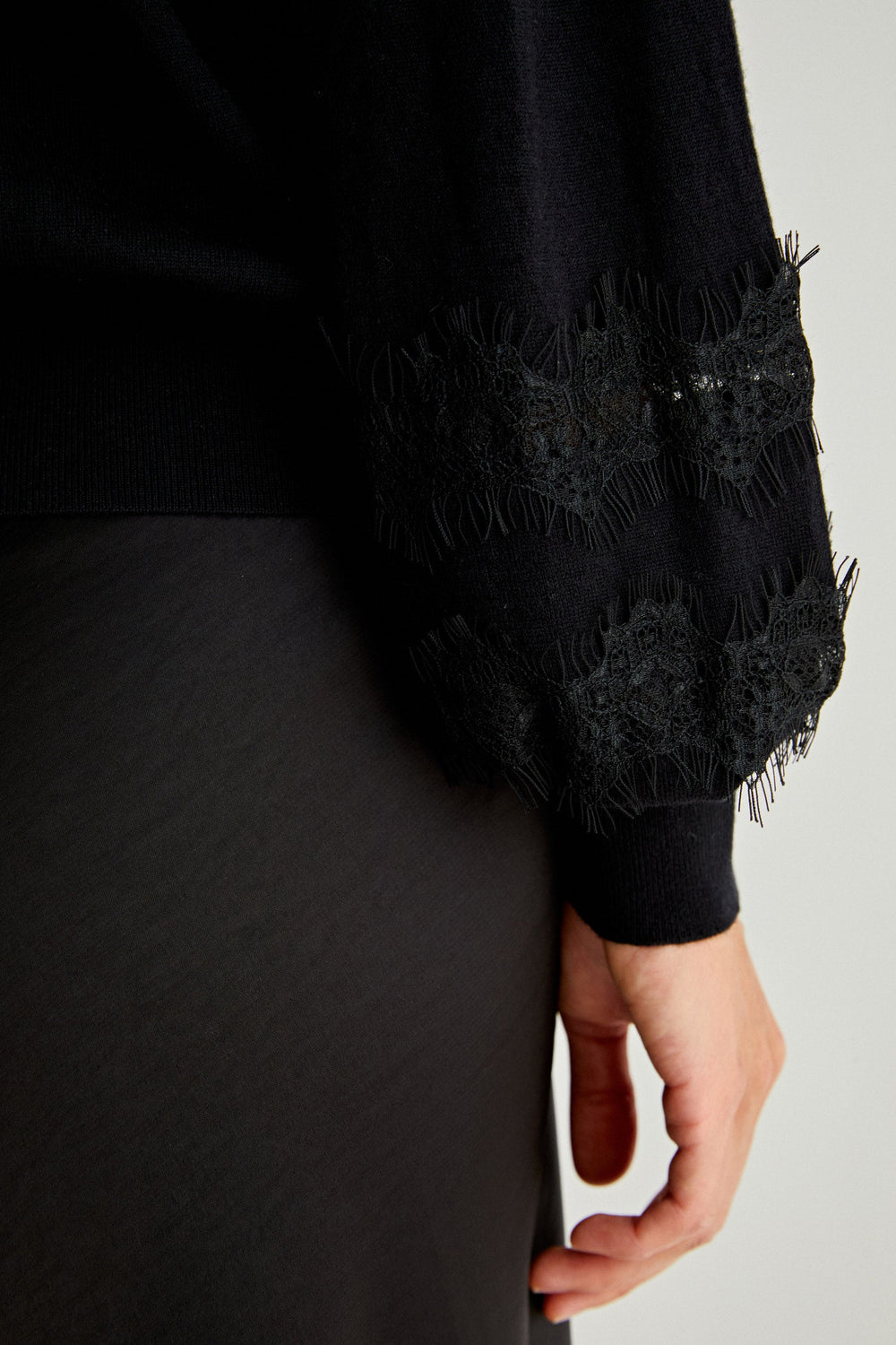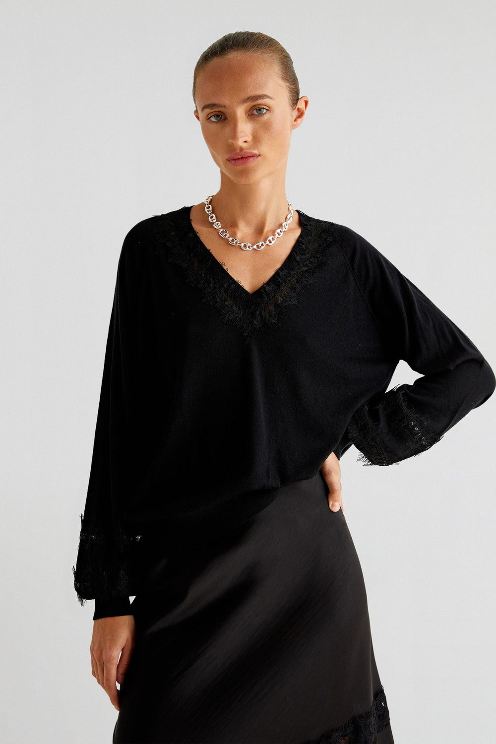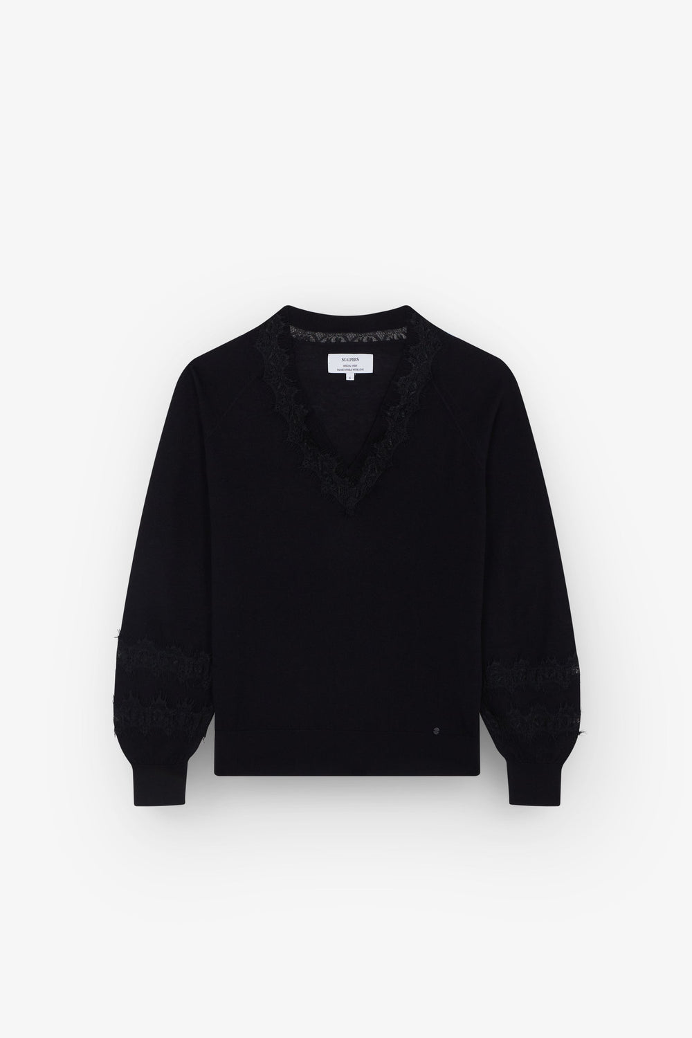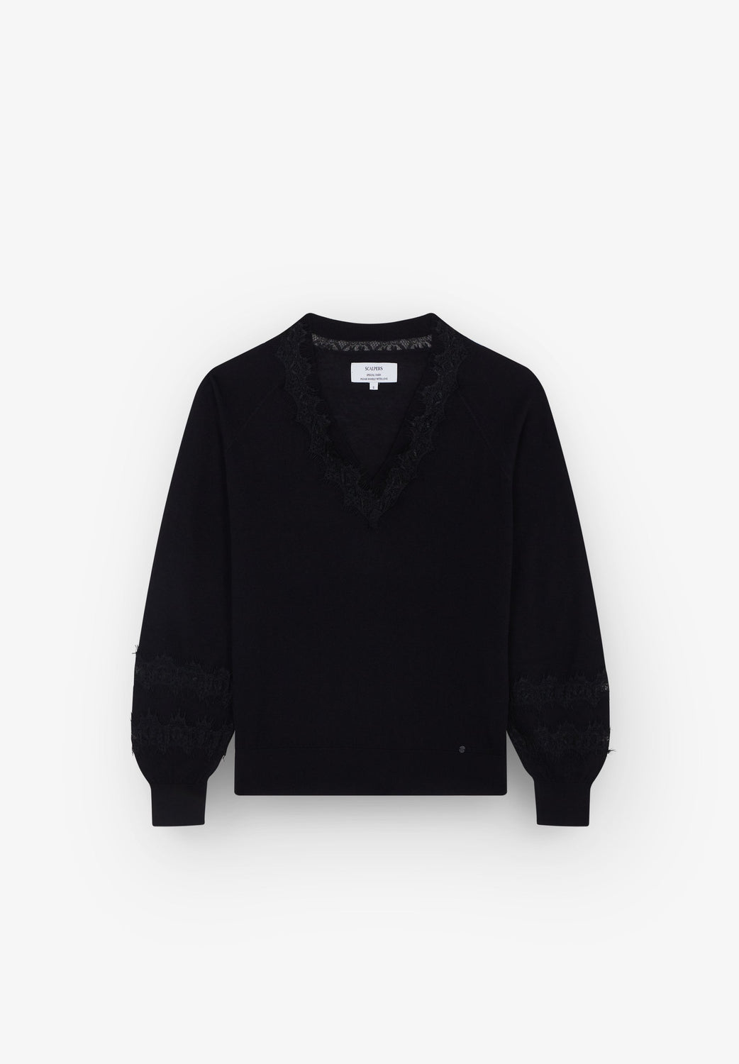Sweater made of a wool blend. Regular fit, V-neckline and long sleeves. Lace detailing on the neckline and cuffs.