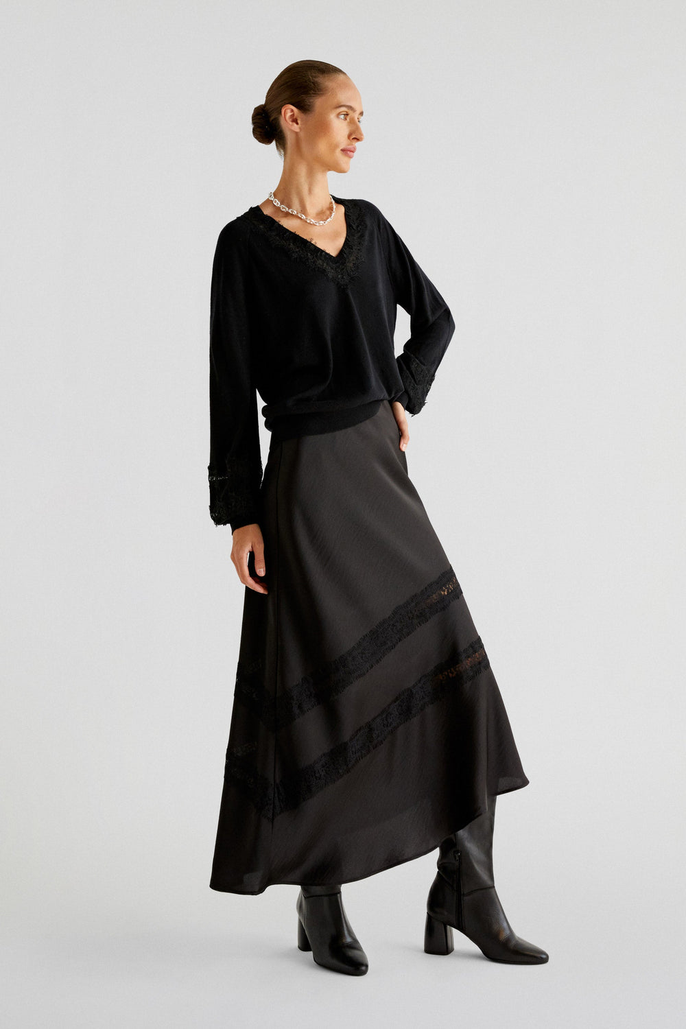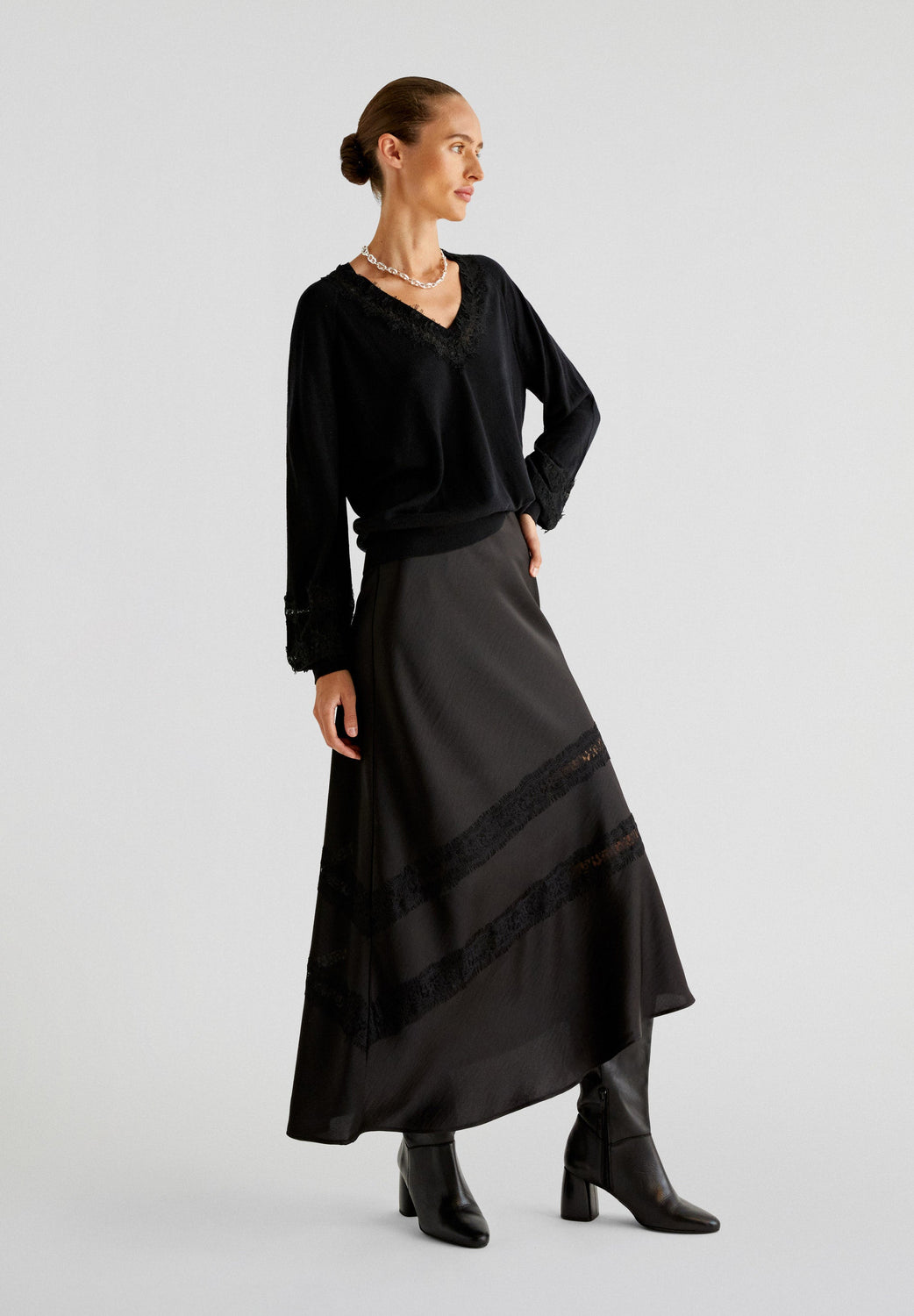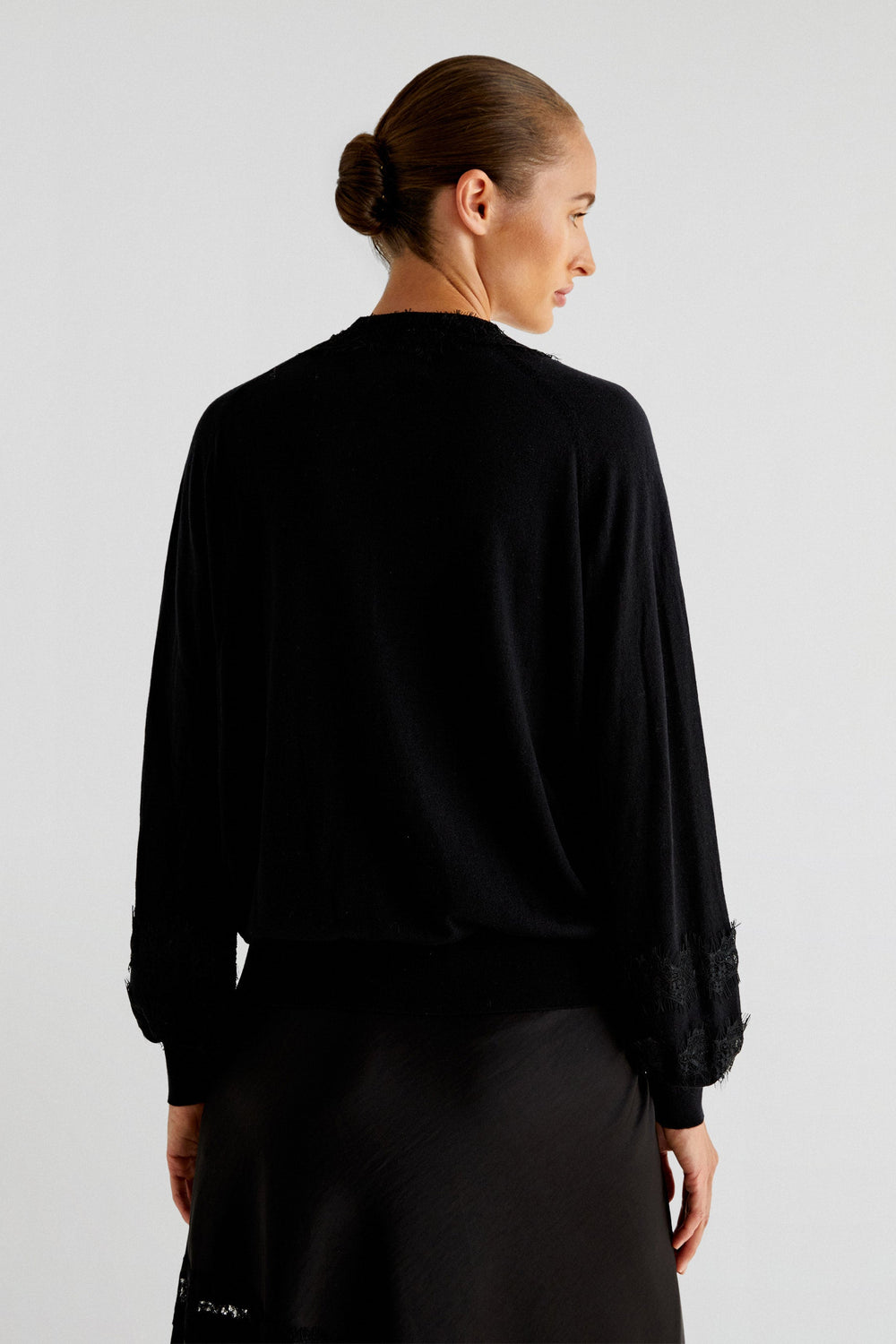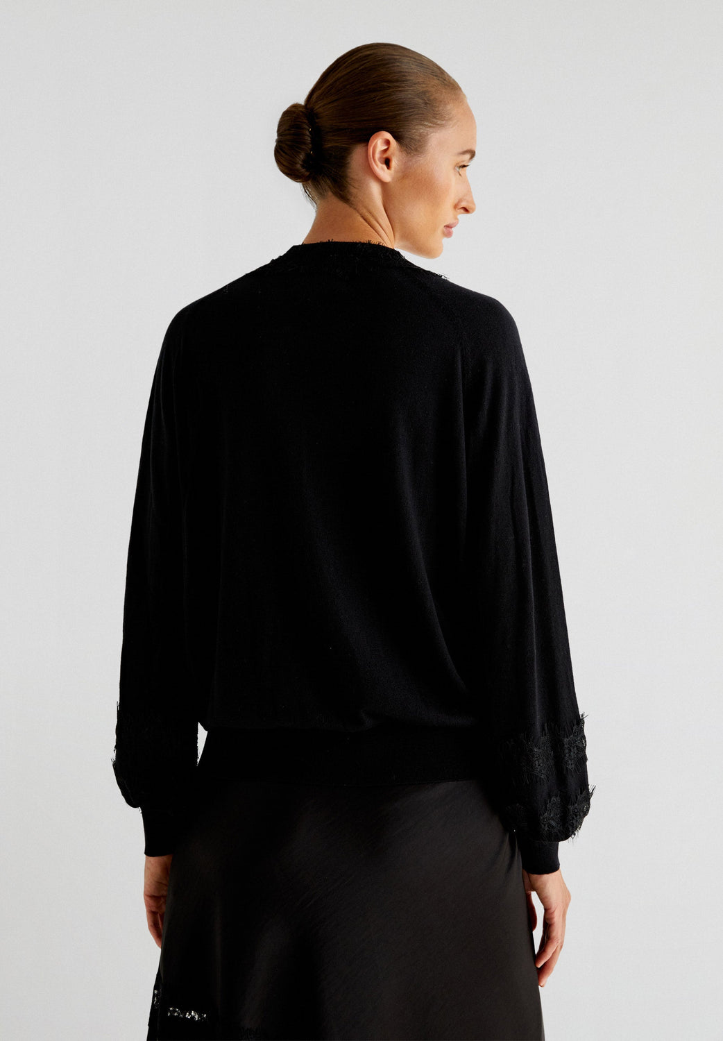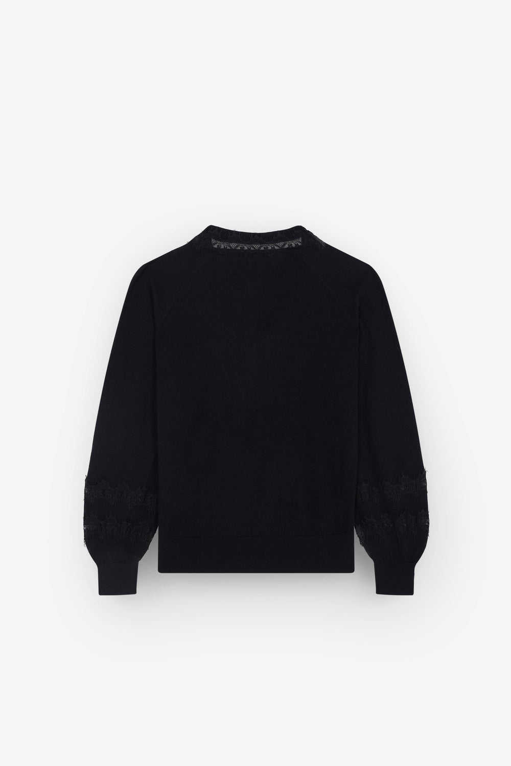 Sweater made of a wool blend. Regular fit, V-neckline and long sleeves. Lace detailing on the neckline and cuffs.