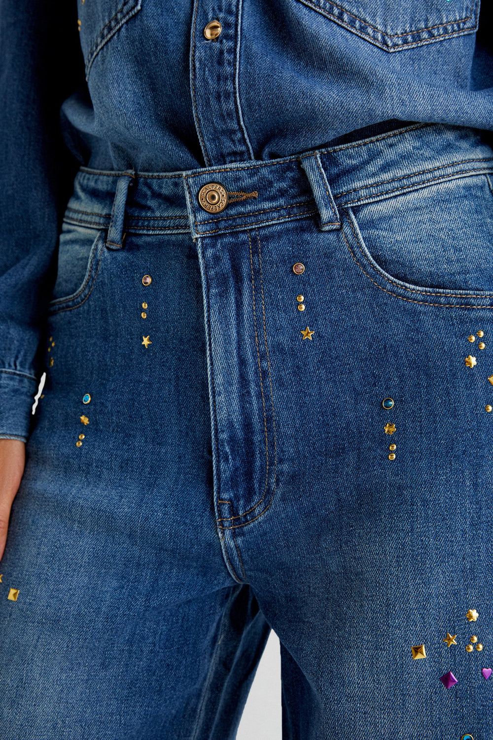 Jeans with studs made of slightly stretchy BCI cotton fabric. Mid-rise full length, button and zip fly fastening. Front and back pocket and belt loops.