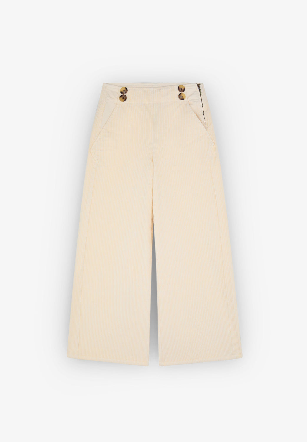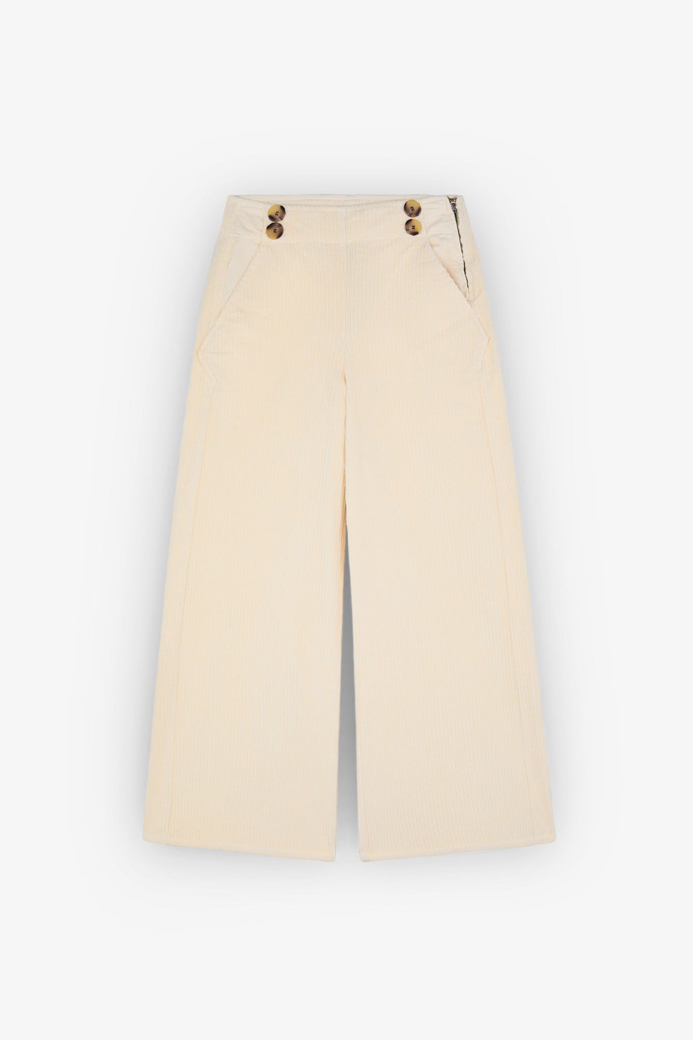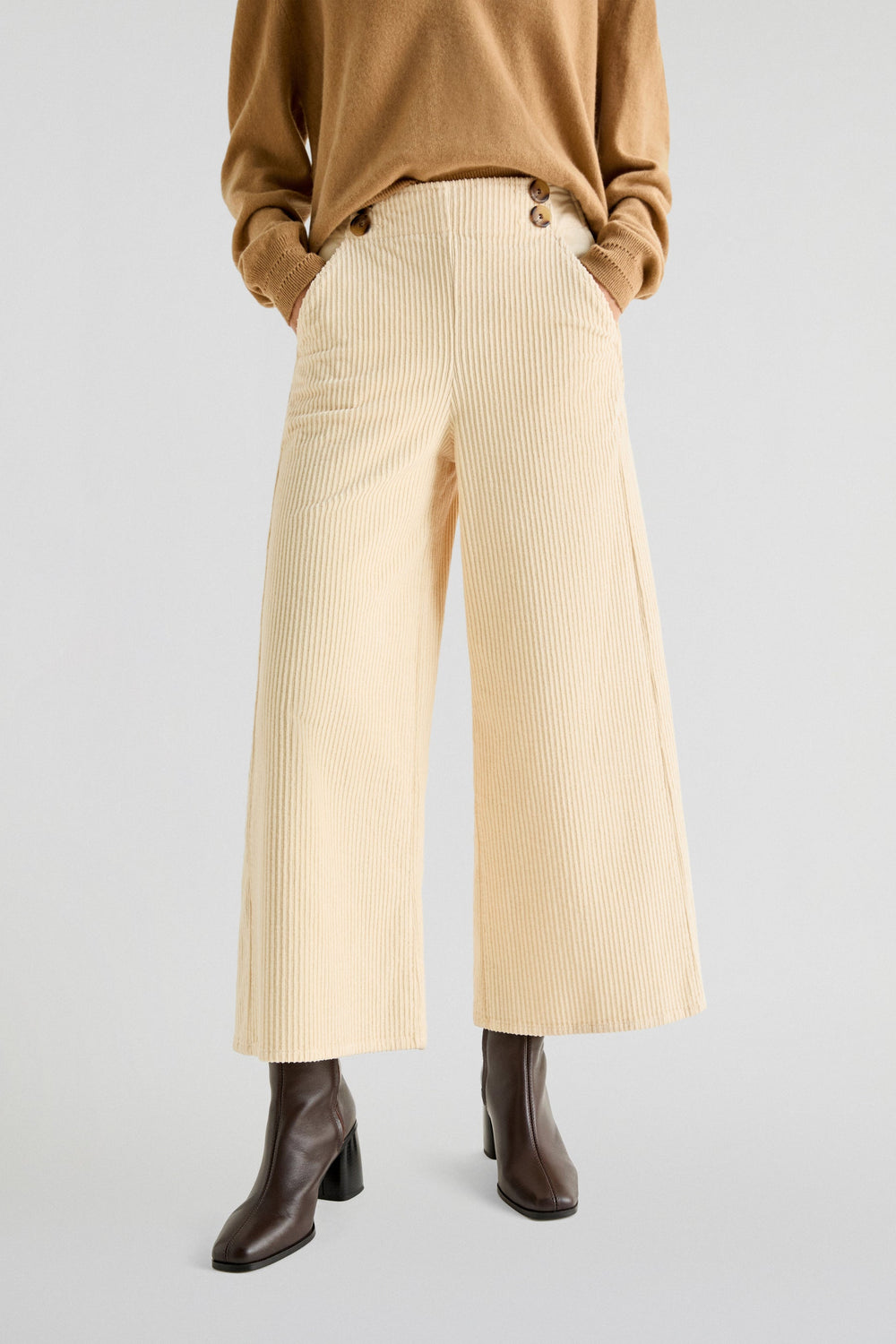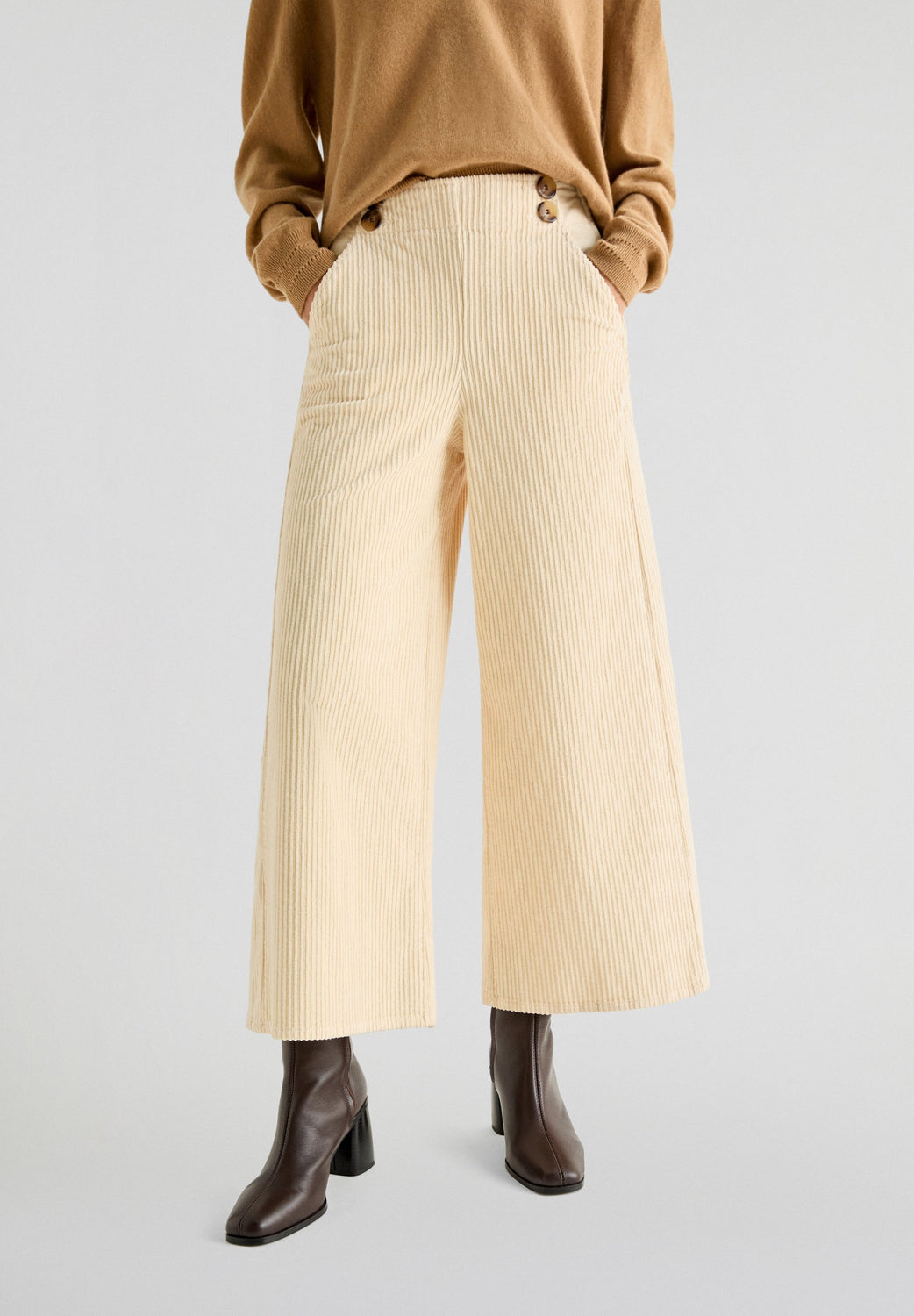 Corduroy trousers made of slightly stretch cotton fabric. Culotte cut, side button fastening and side pockets.