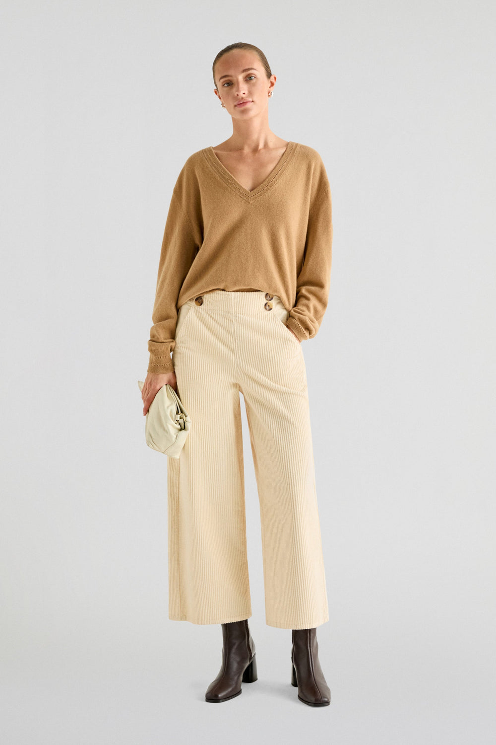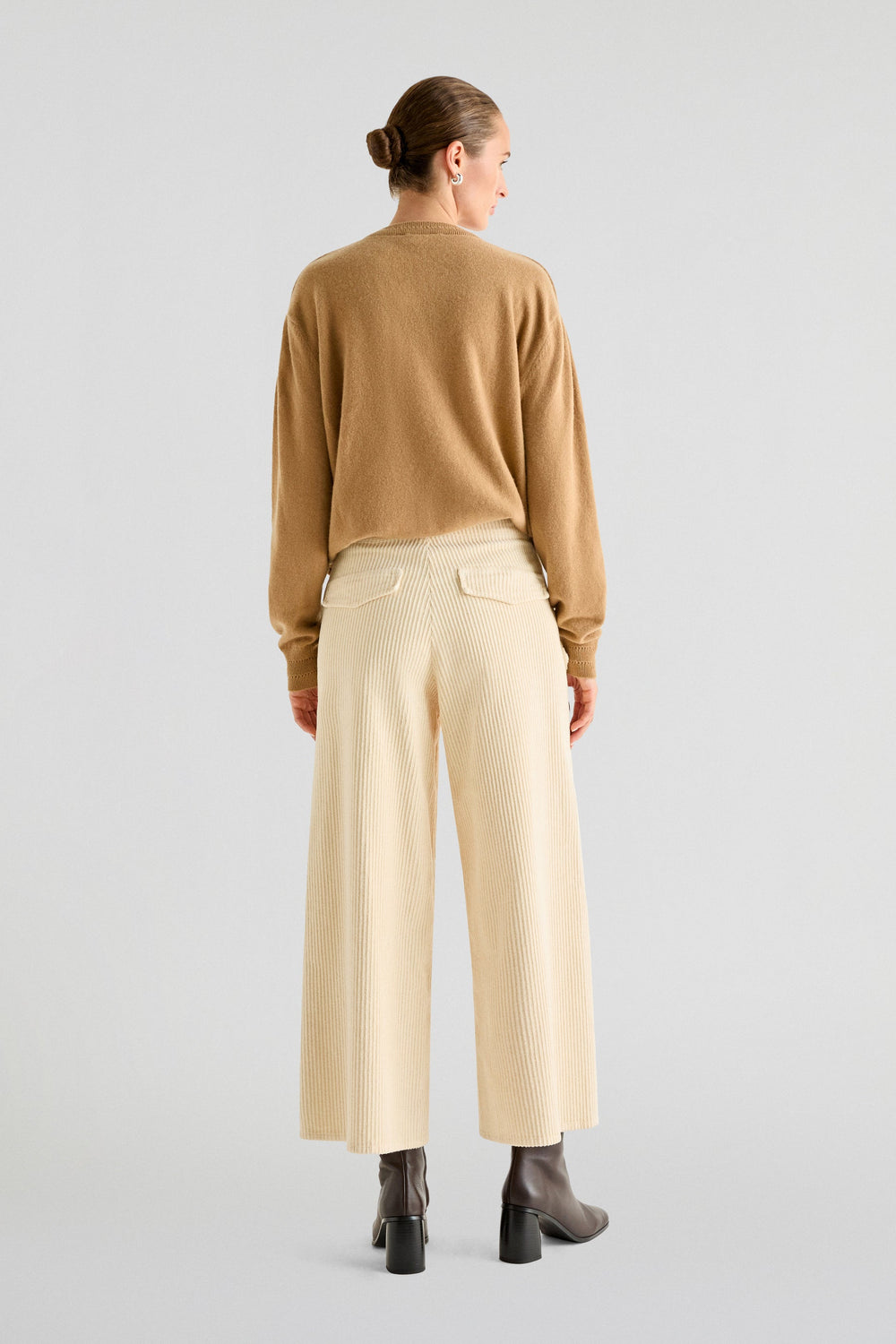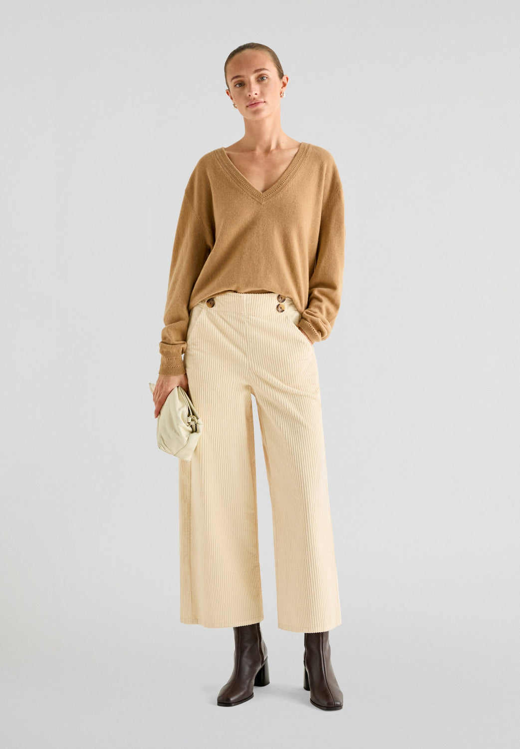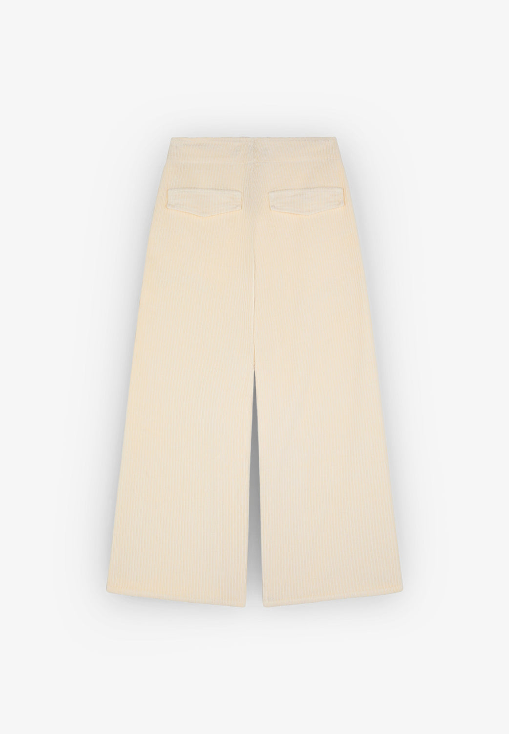 Corduroy trousers made of slightly stretch cotton fabric. Culotte cut, side button fastening and side pockets.