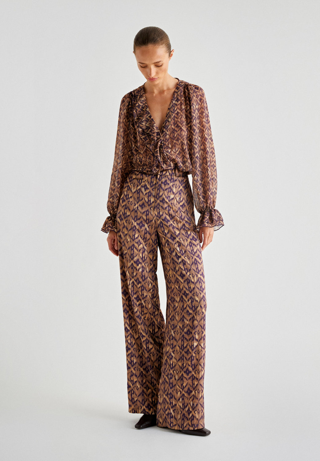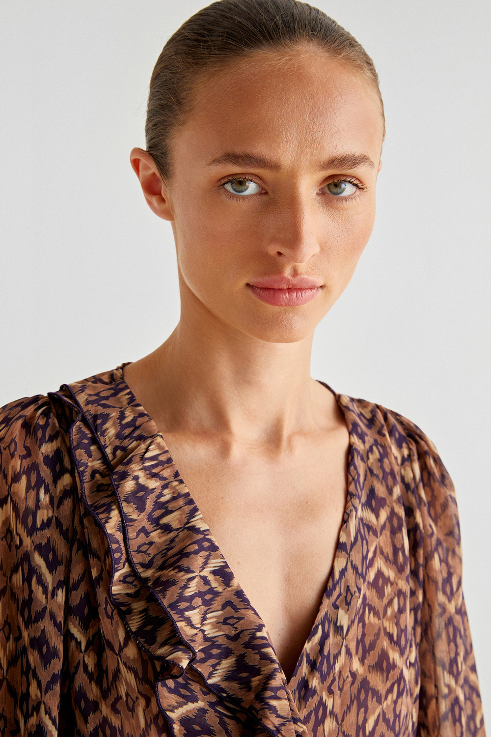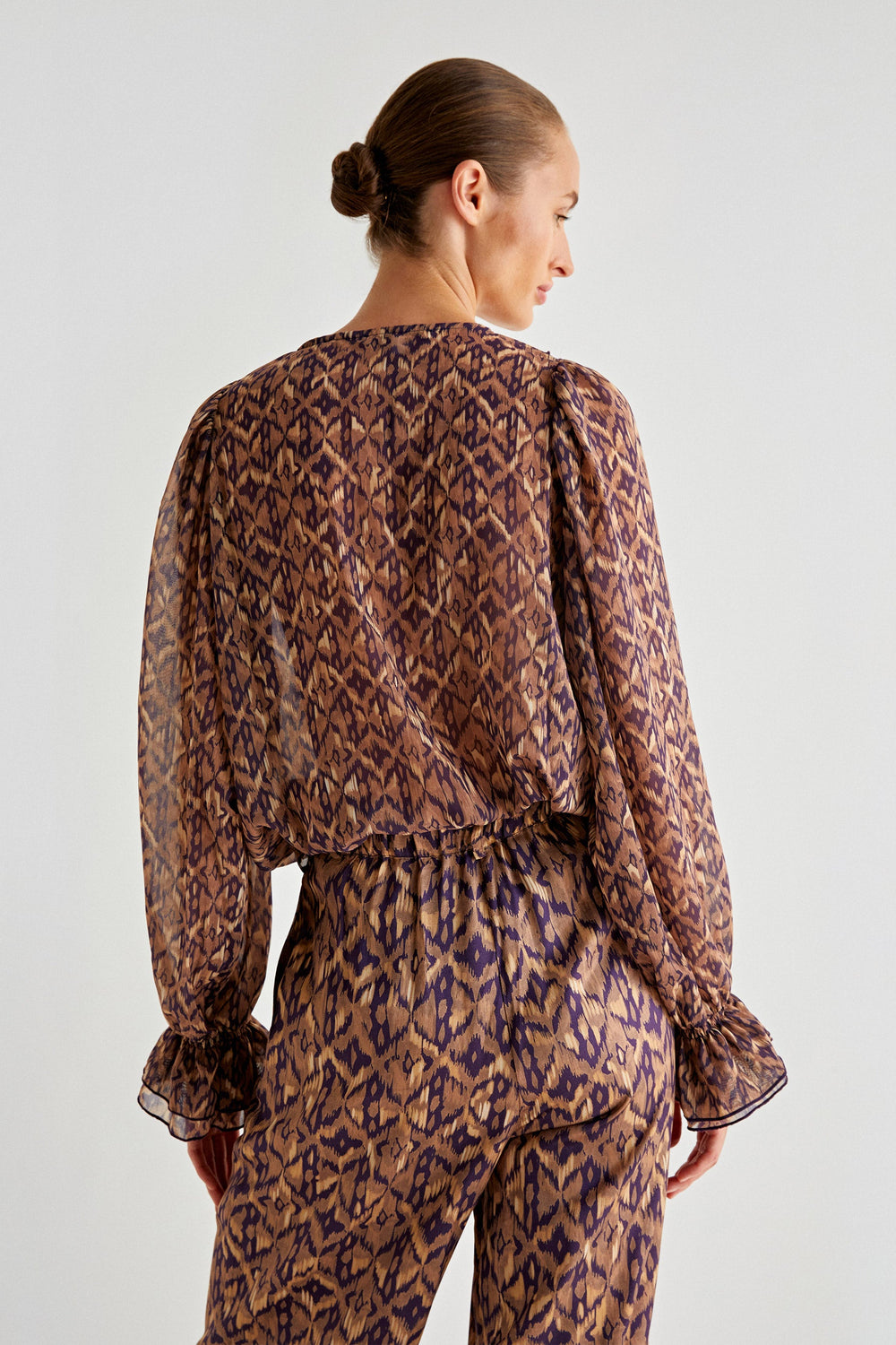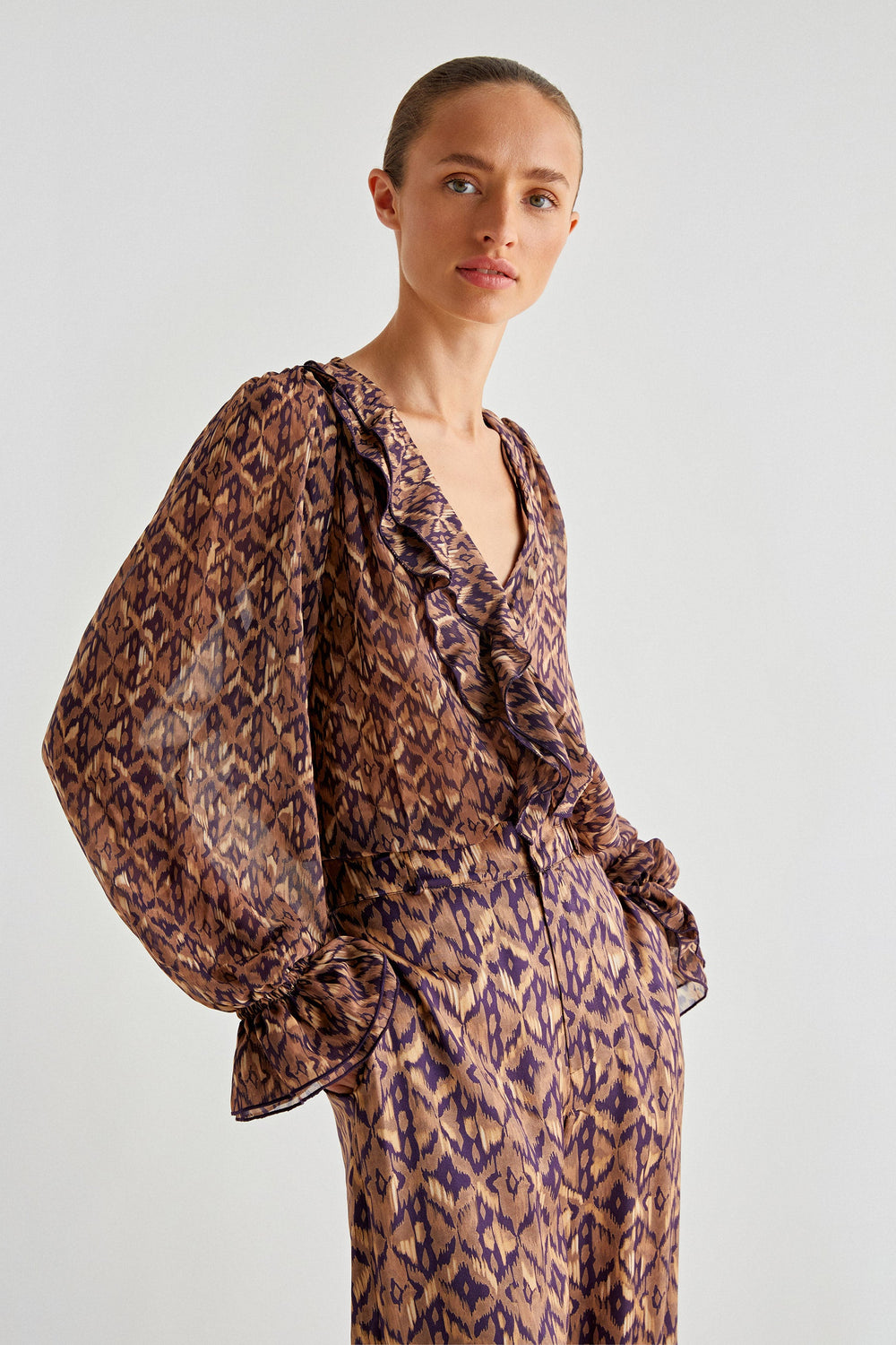 Ethnic blouse made of flowing fabric. Regular fit, V-neck with ruffle detail and long sleeves with elastic cuffs.
