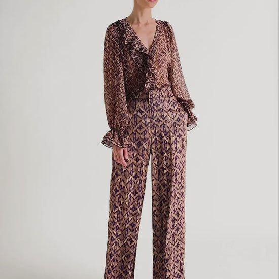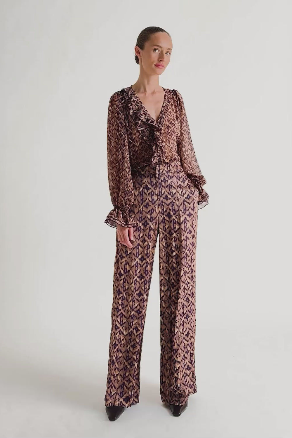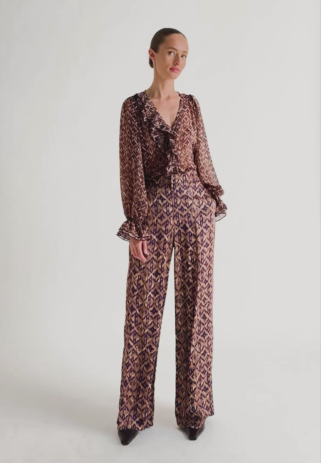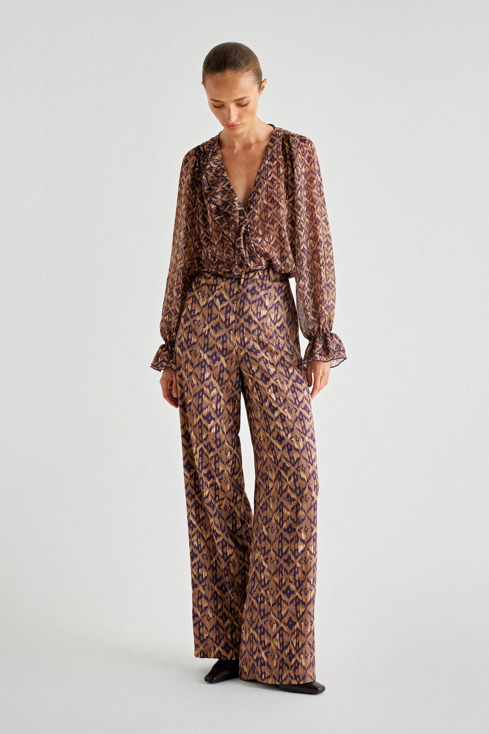 Ethnic blouse made of flowing fabric. Regular fit, V-neck with ruffle detail and long sleeves with elastic cuffs.