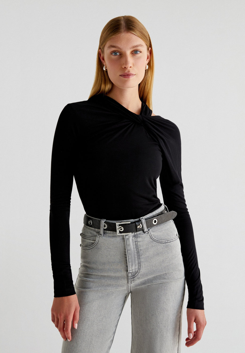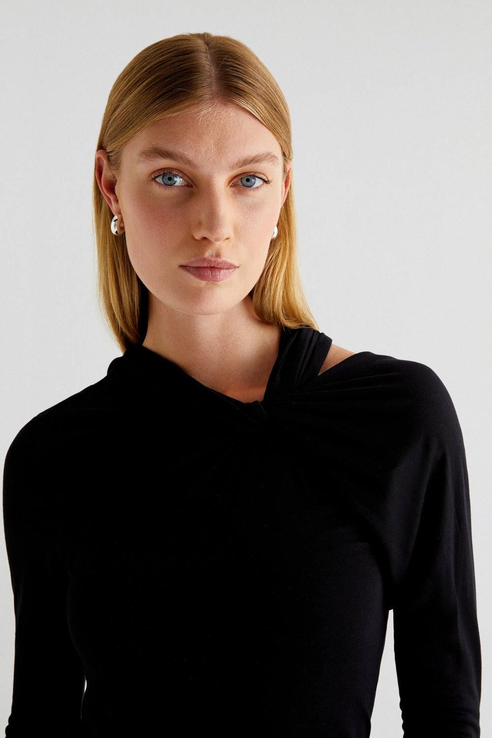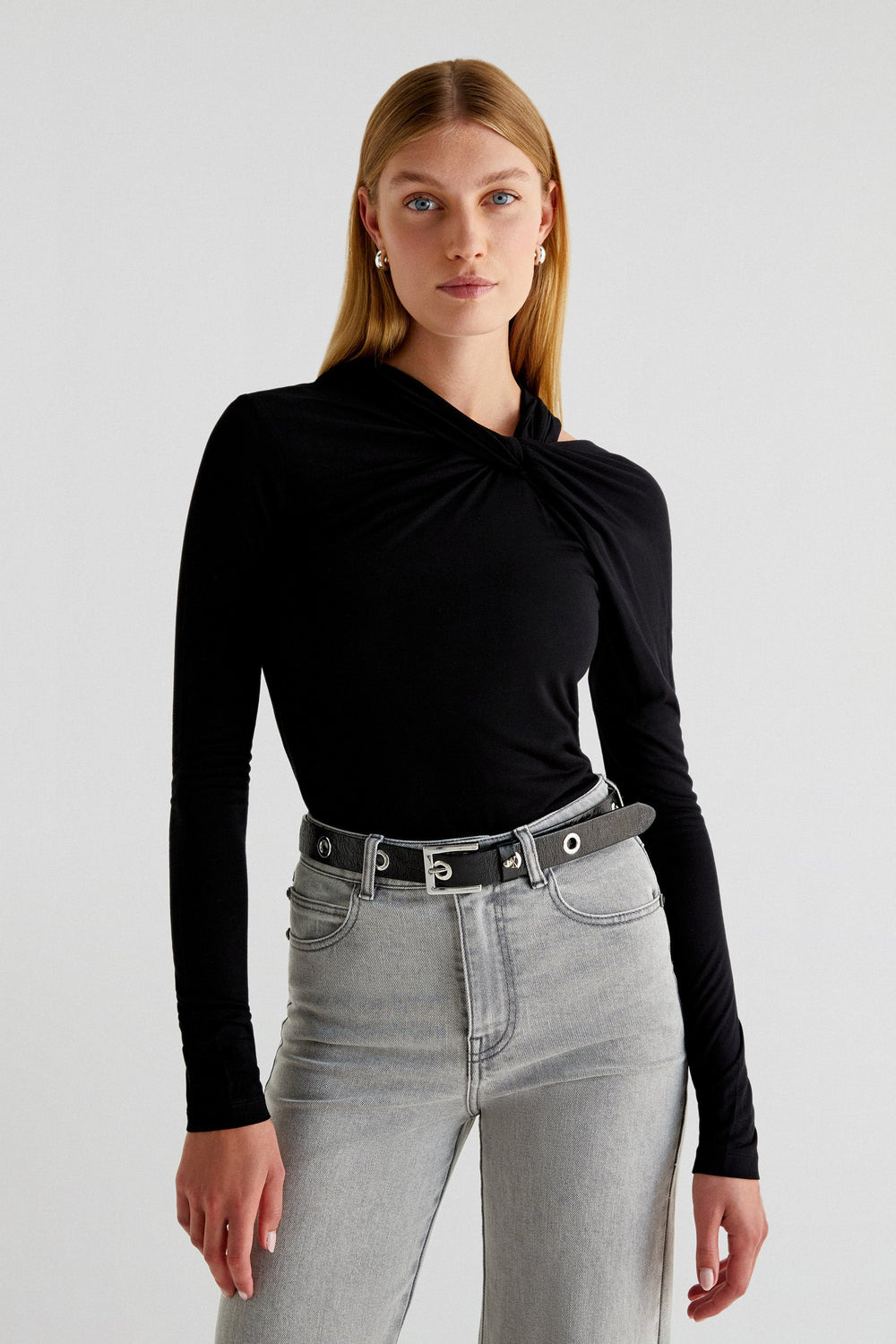 Top made of slightly stretchy fabric. Slim fit, neckline with knot and strap detail and long sleeves.