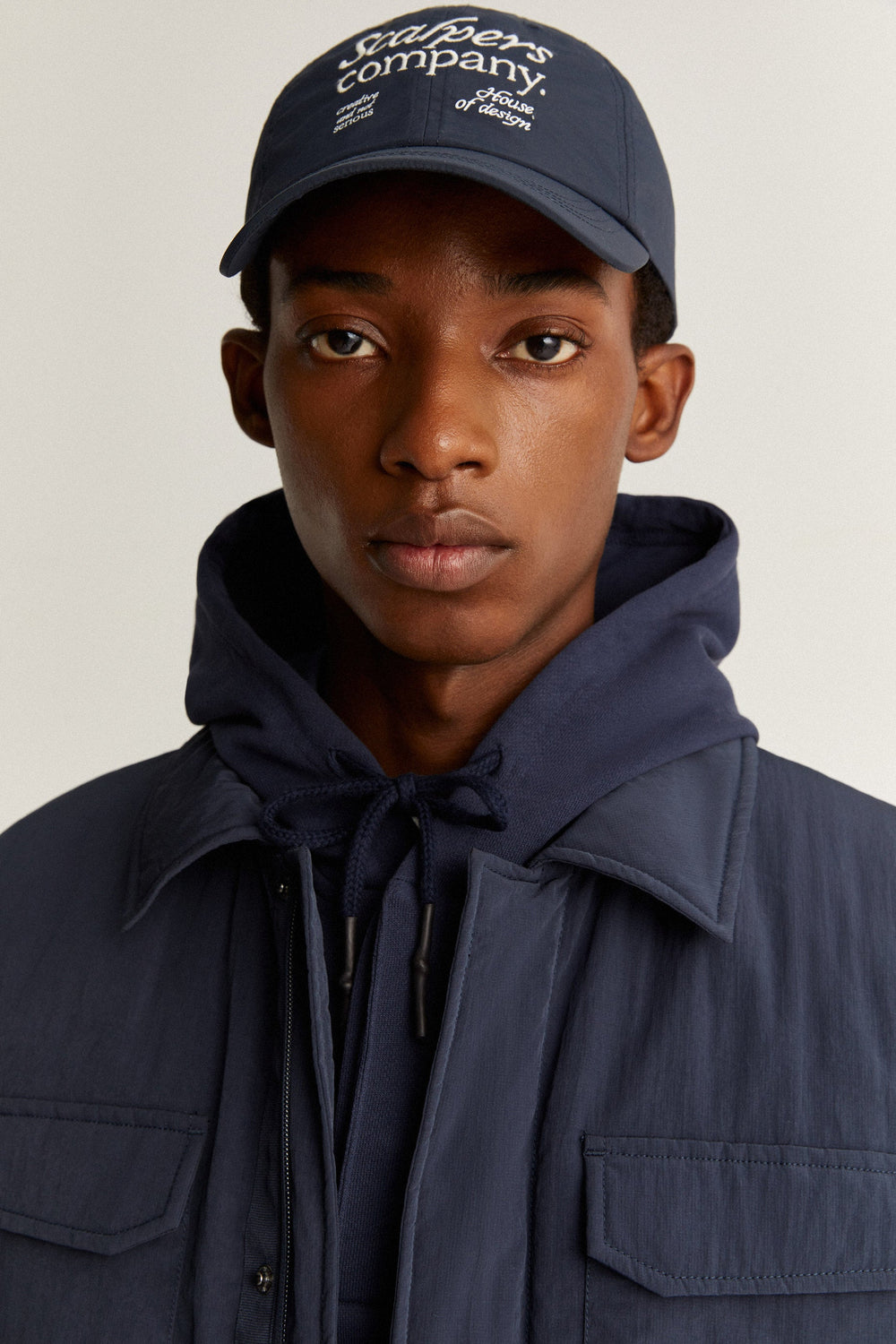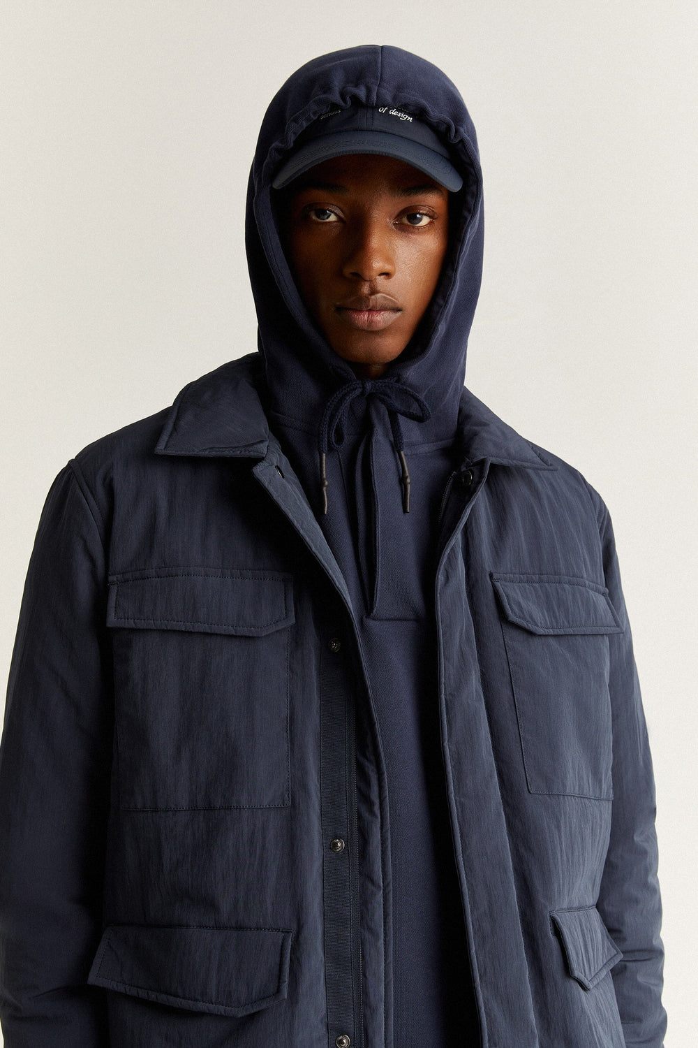 - Double slider zip and snap buttons concealed by a placket