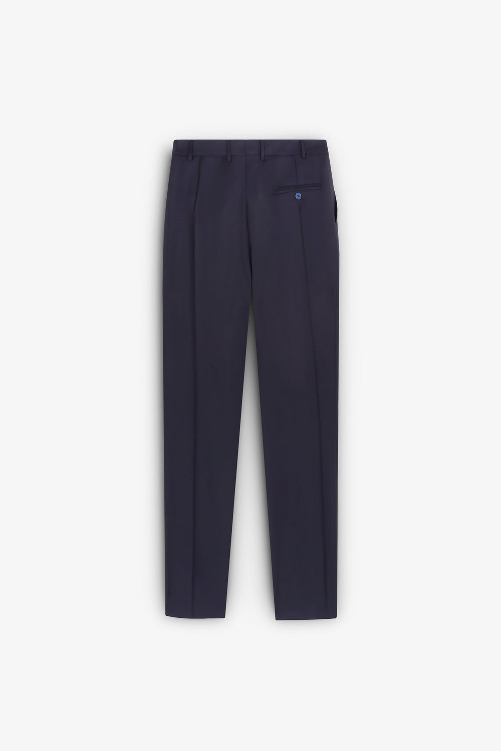 • Straight trousers with extended hook and eye fastening and a zip. Simple hem without turn-up. Inner button for braces. Side pockets and back welt pocket with button. Belt loops at waist