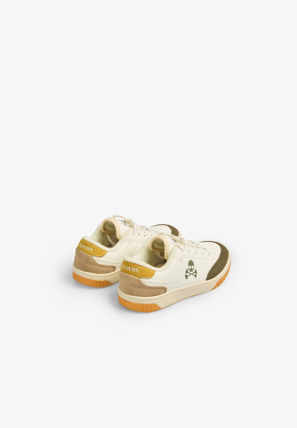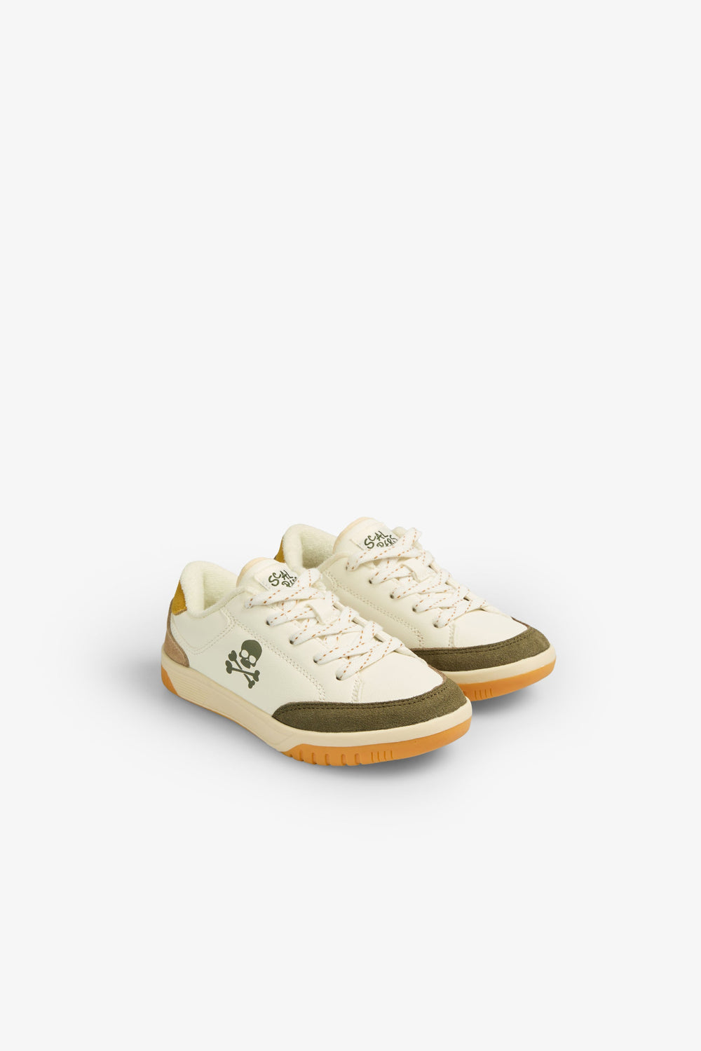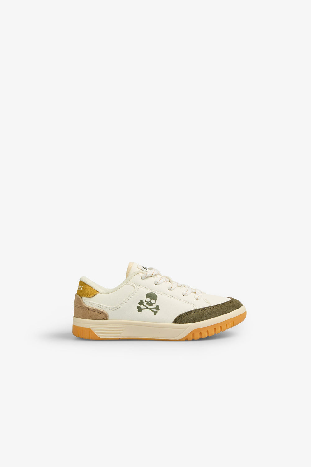 Leather sneakers with split suede details. Matching lace-up fastening, rubber soles and contrast heels. Side skull details.