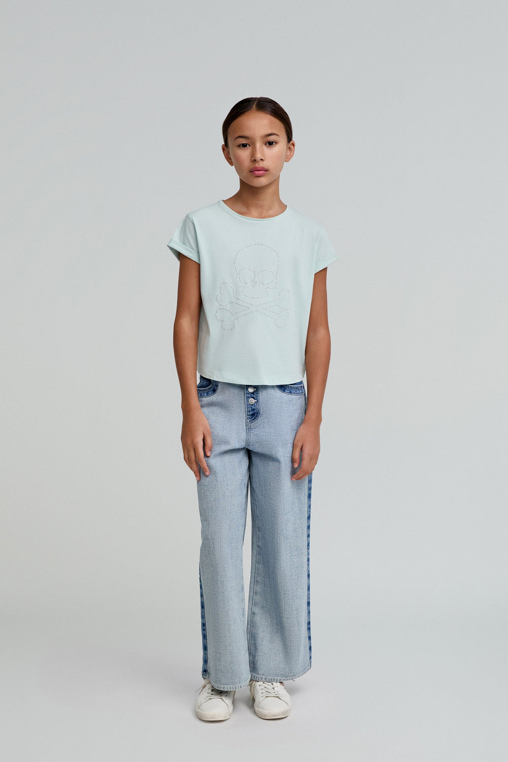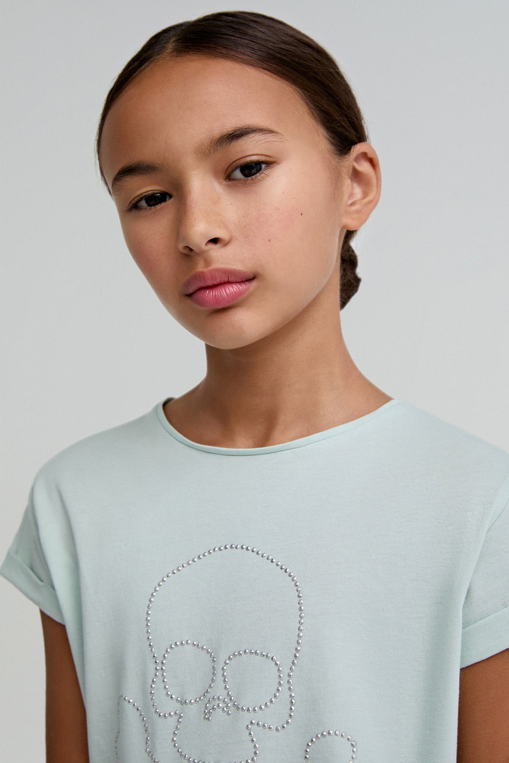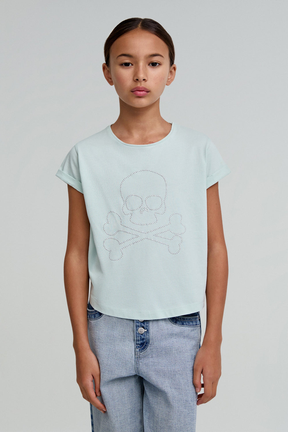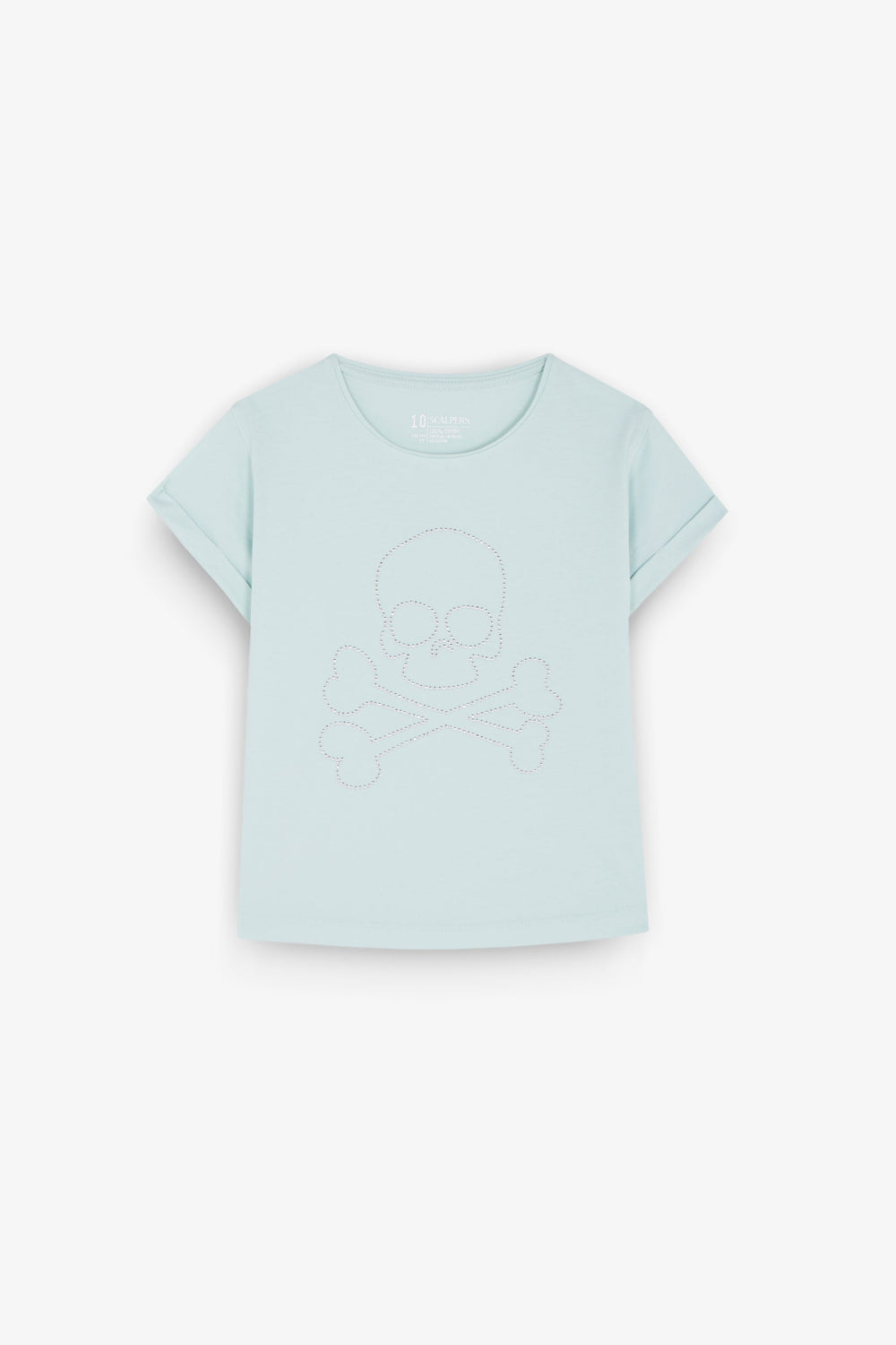 T-shirt with rhinestones. Made of 100% BCI cotton, faded effect. Regular fit. Round collar. Short sleeves. Rhinestone skull on the front.